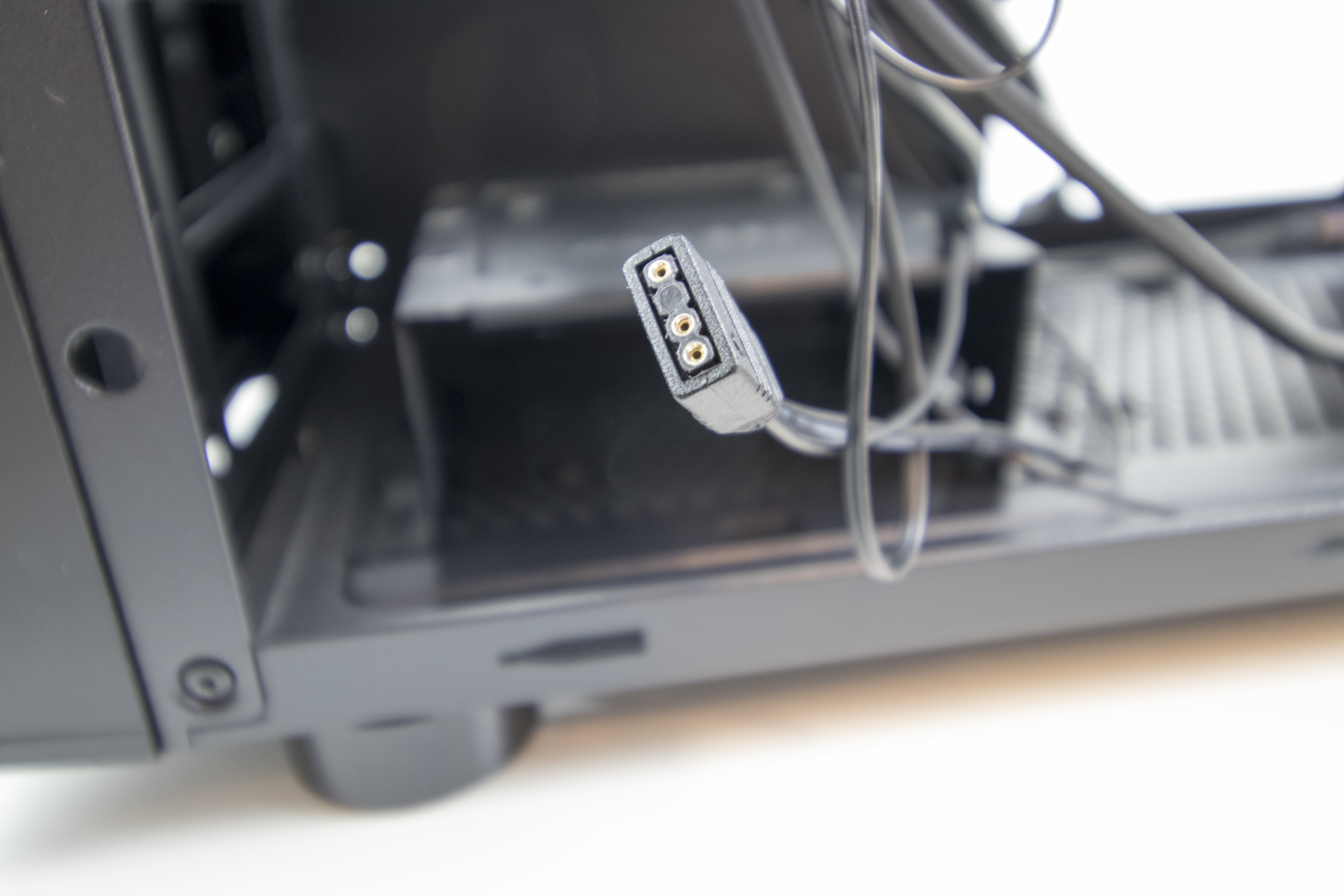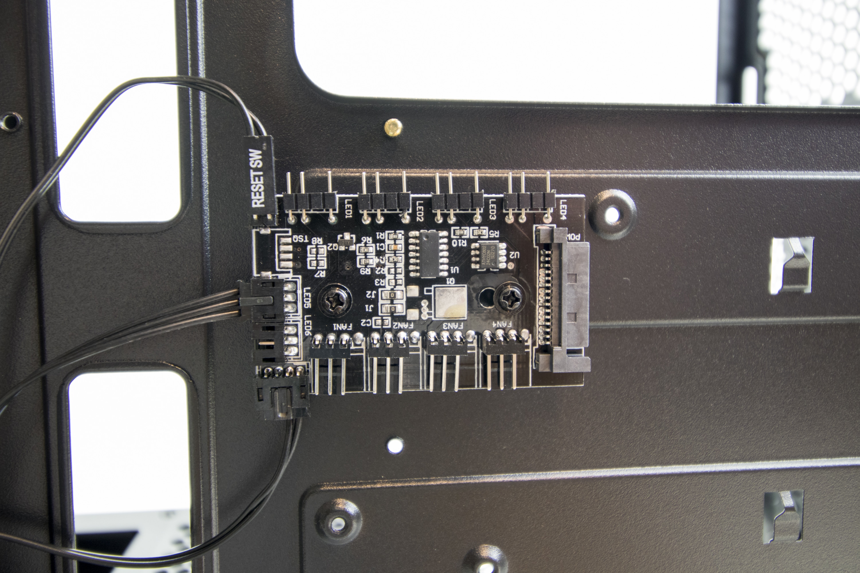Die Rückseite des Mainboard-Trays ist relativ unspektakulär. Hier sind noch zahlreiche Haltenasen für Kabelbinder zur Kabelführung zu finden. Der Platz ist mit 20 Millimeter Höhe auch ausreichend dimensioniert. Überraschend ist jedoch der Controller, der mitgeliefert wird. Dieser erlaubt die Steuerung von bis zu sechs RGB-Produkten sowie vier 3-Pin-Lüftern. Die Steuerung erfolgt wahlweise per Reset-Button am I/O-Panel oder über kompatible Mainboards mit digital adressierbarer RGB-Beleuchtung (3-Pin, 5 Volt).