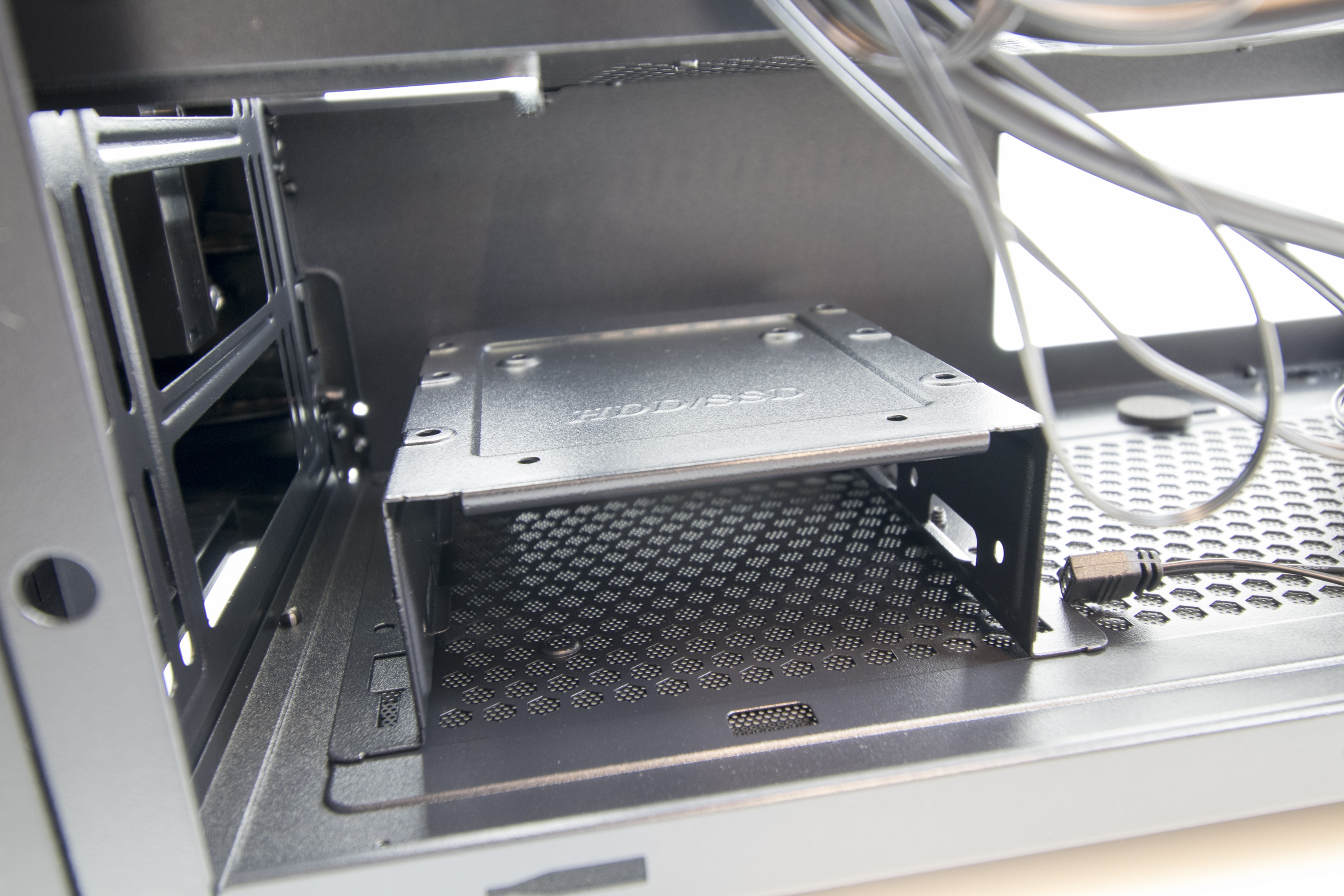 Das unter der Netzteilabdeckung montierbare Netzteil ist durch Gummipuffer entkoppelt, damit keine Vibrationen aufs Gehäuse übertragen werden. Dahinter befindet sich der Festplattenkäfig, der die Aufnahme von jeweils einem 2,5″- und einem 3,5″-Laufwerk ermöglicht. Leider ohne Entkopplung. Auch mit Festplattenfähig gibt es eigentlich genug Platz für Kabel, da der Festplattenkäfig nur halbe Höhe hat. Wer ihn nicht benötigt, kann ihn aber auch einfach von der Unterseite aus abschrauben.