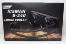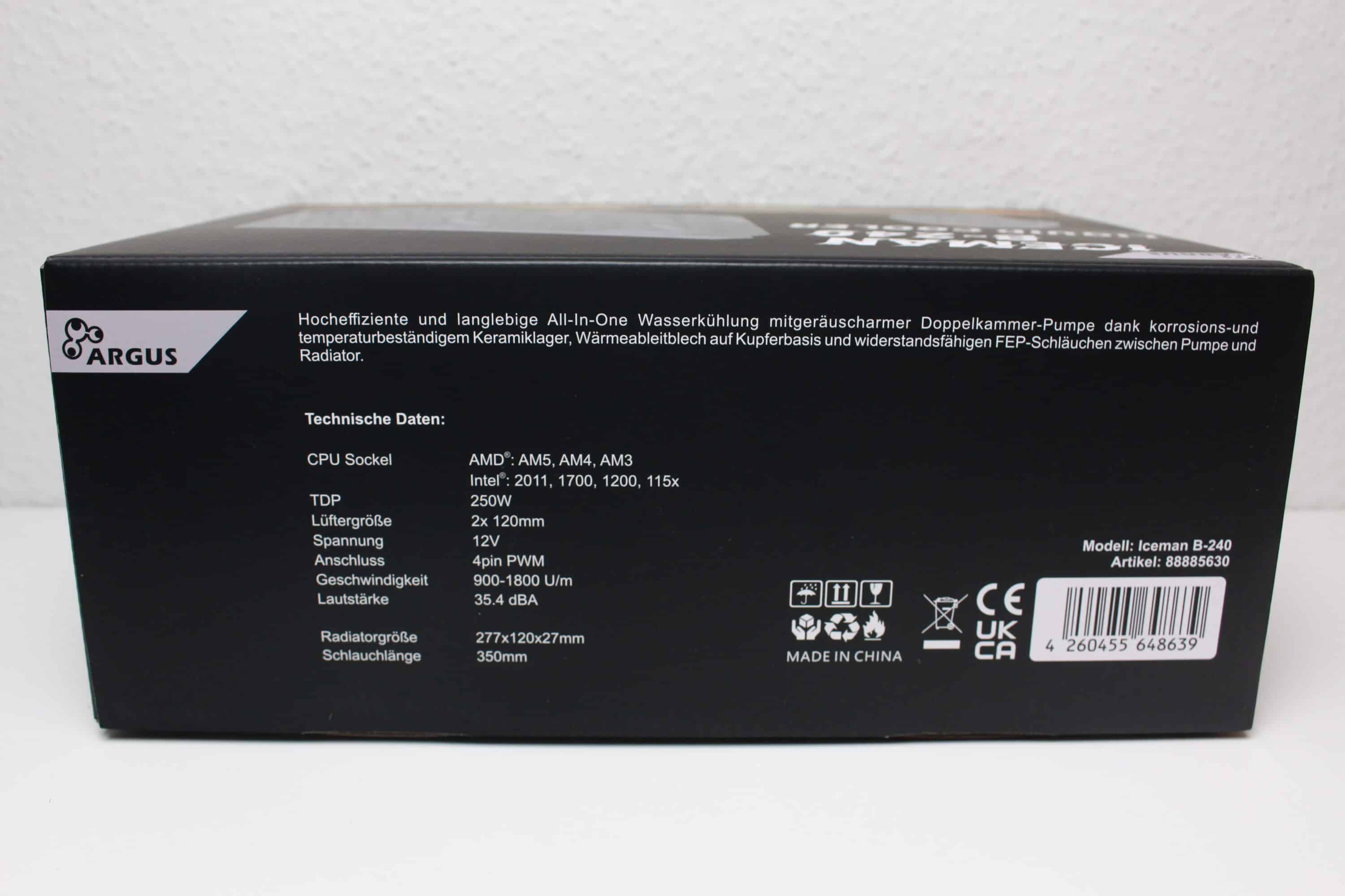 Die Inter-Tech Argus Iceman B-240 kommt verpackt in einem farbig bedruckten Karton aus Pappe auf dem vor allem die Farbe Schwarz dominiert aber auch Bilder der Kompaktwasserkühlung zu erkennen sind. Des Weiteren wurden der Produktnamen sowie eine Tabelle mit den wichtigsten technischen Daten und eine kurze Produktbeschreibung auf die Verpackung gedruckt.
