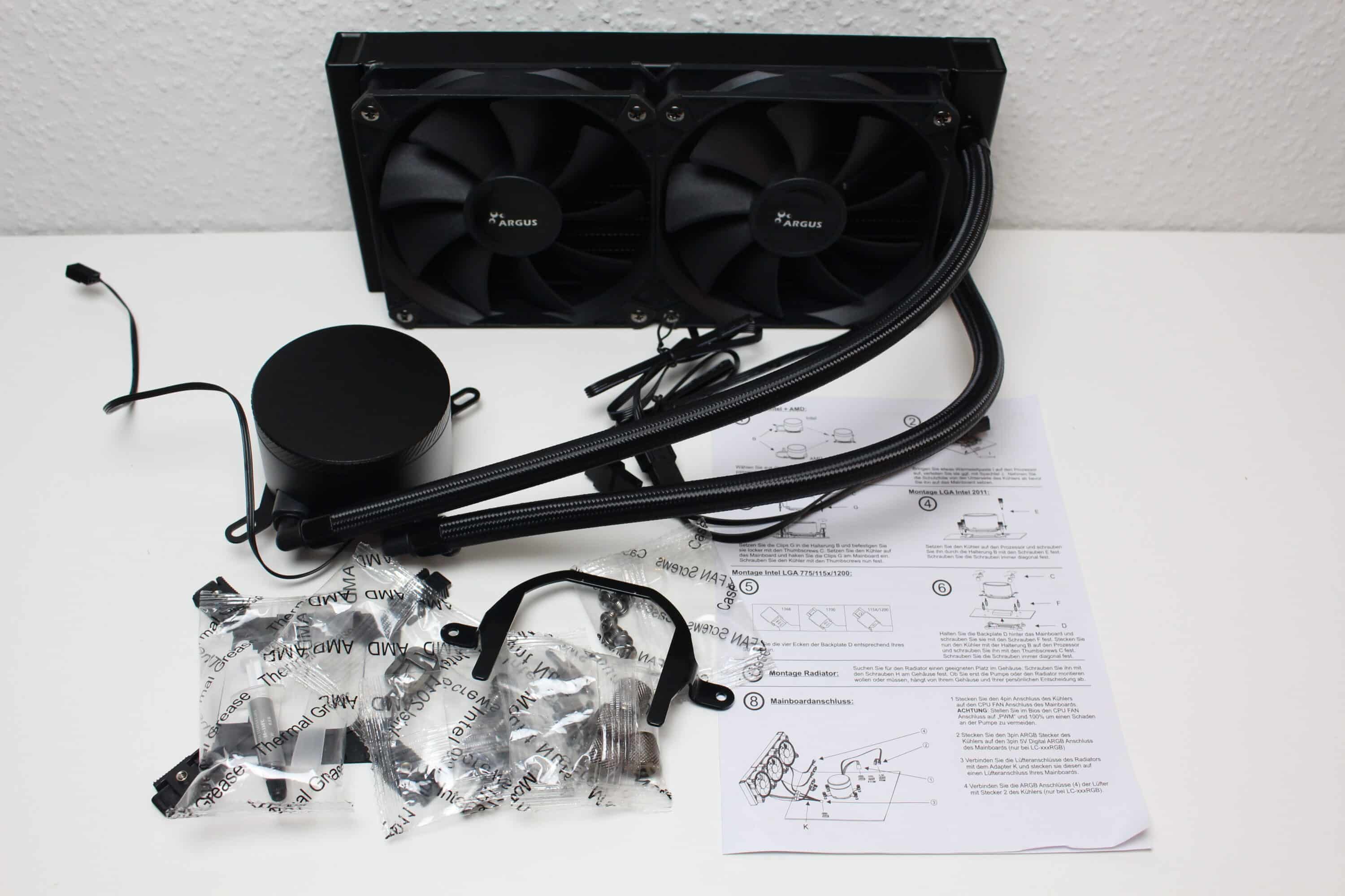 Im Inneren finden wir neben einer dünnen Schaumstoffmatte auch eine Form aus recycelter Pappe vor, die alle Komponenten und Zubehör an Ort und Stelle hält. Zusätzliche Schutzfolien aus Kunststoff sollen zudem Kratzer auf den lackierten Bauteilen verhindern. Zum Lieferumfang gehören neben der Radiator-Pumpen-Kombination des Weiteren zwei vorinstallierte 120-mm-Lüfter, das notwendige Montagezubehör, eine Montageanleitung, eine Tube Wärmeleitpaste sowie ein Spatel zum Verstreichen ebenjener.