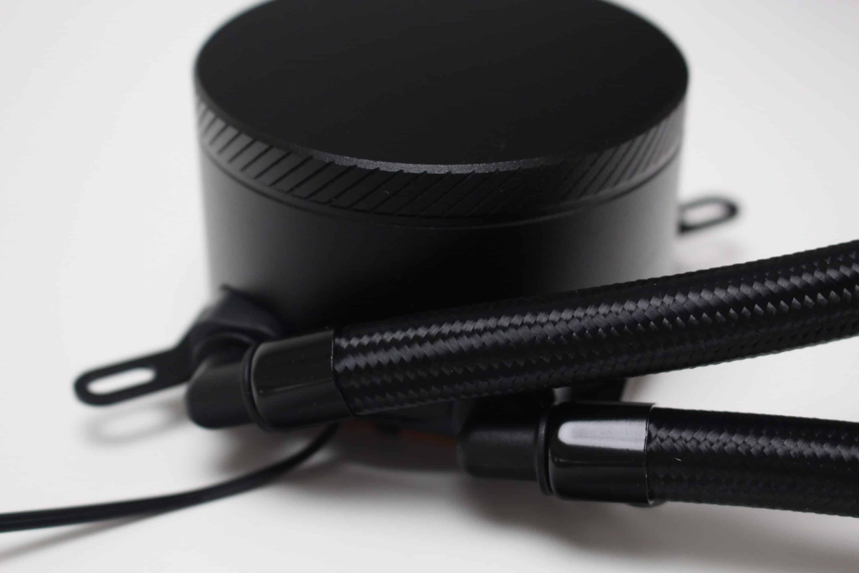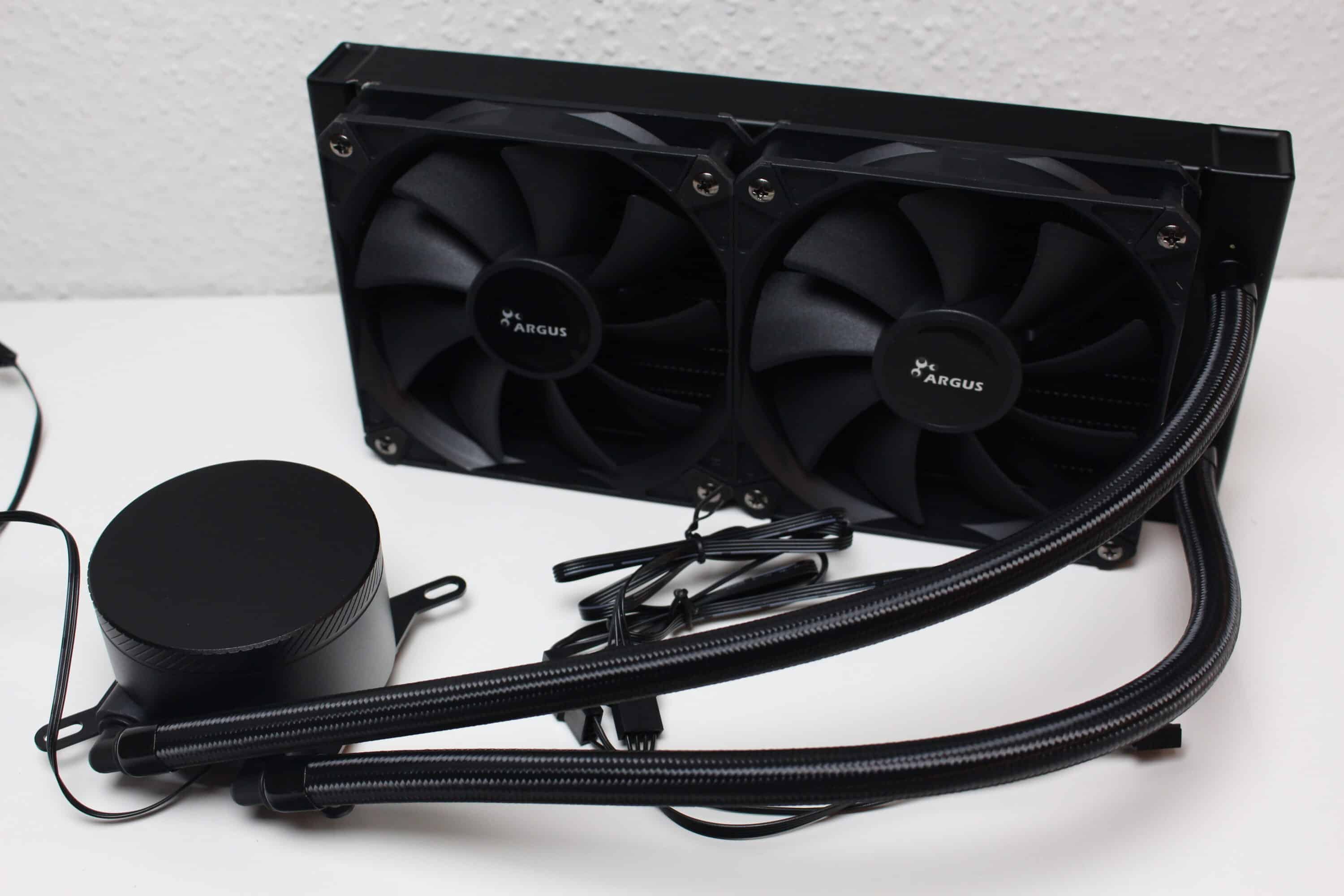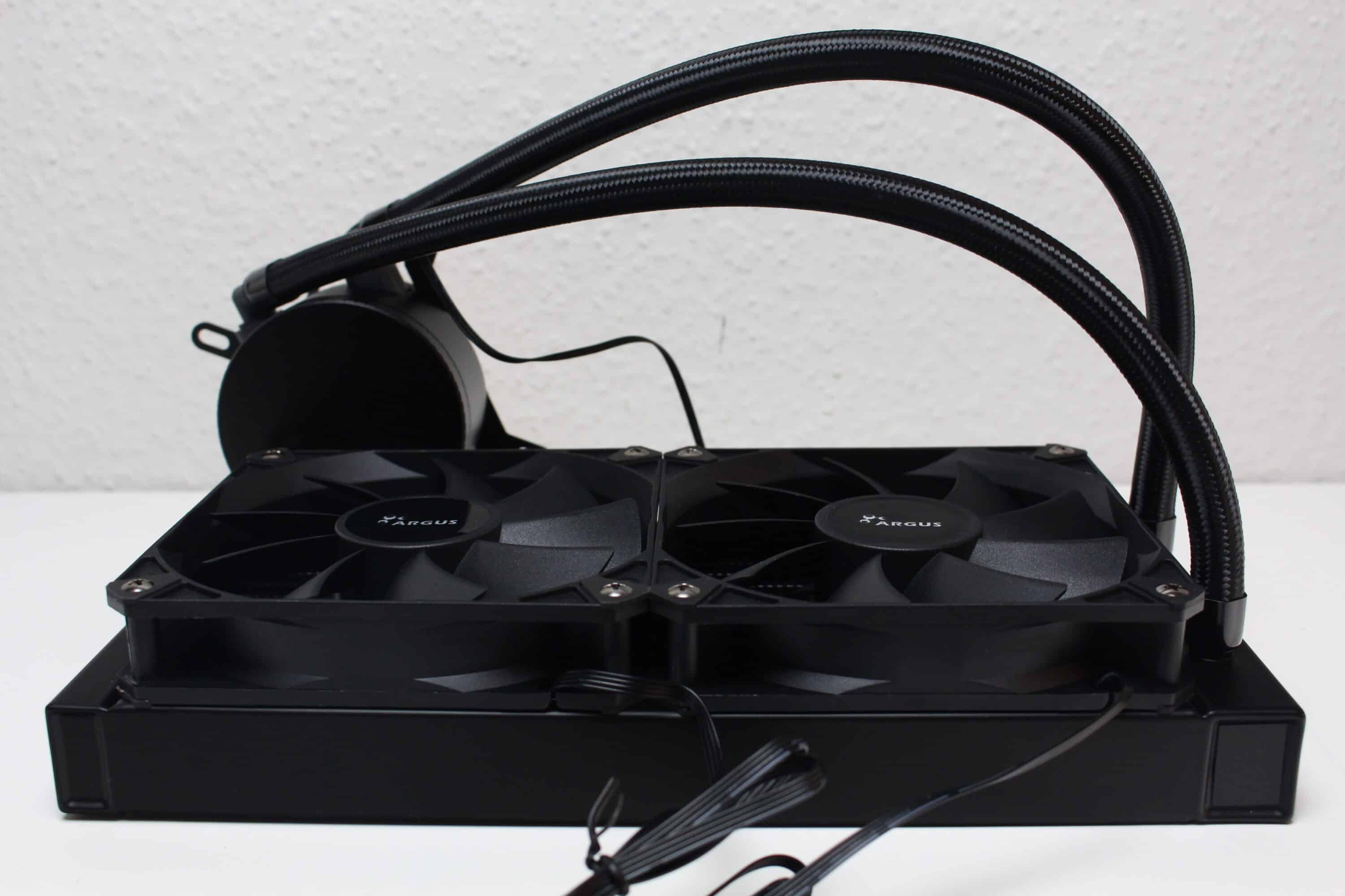 Zwischen CPU-Block und Radiator fließt das Wasser durch zwei 350 Millimeter lange Schläuche, die für größere Gehäuse bereits etwas zu kurz sein könnten. Damit die einfachen Gummischläuche nicht die Optik zerstören, hat Argus diese mit einem engmaschigem Nylon-Gewebe ummantelt und sowohl am Radiator als auch am CPU-Block sind diese fest in Metallmuffen gepresst, wodurch die Kompaktwasserkühlung nicht erweiterbar ist. Die drehbaren Schlauchgelenke am CPU-Block ermöglichen darüber hinaus eine flexible Orientierung der Kompaktwasserkühlung.