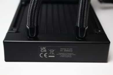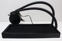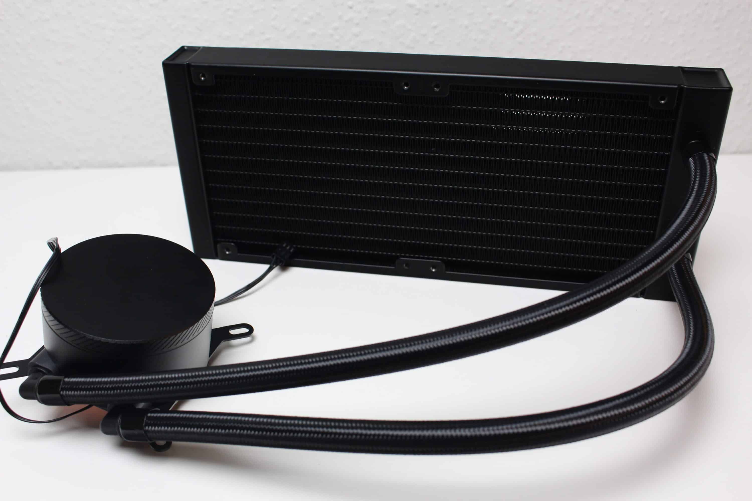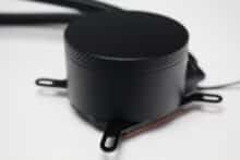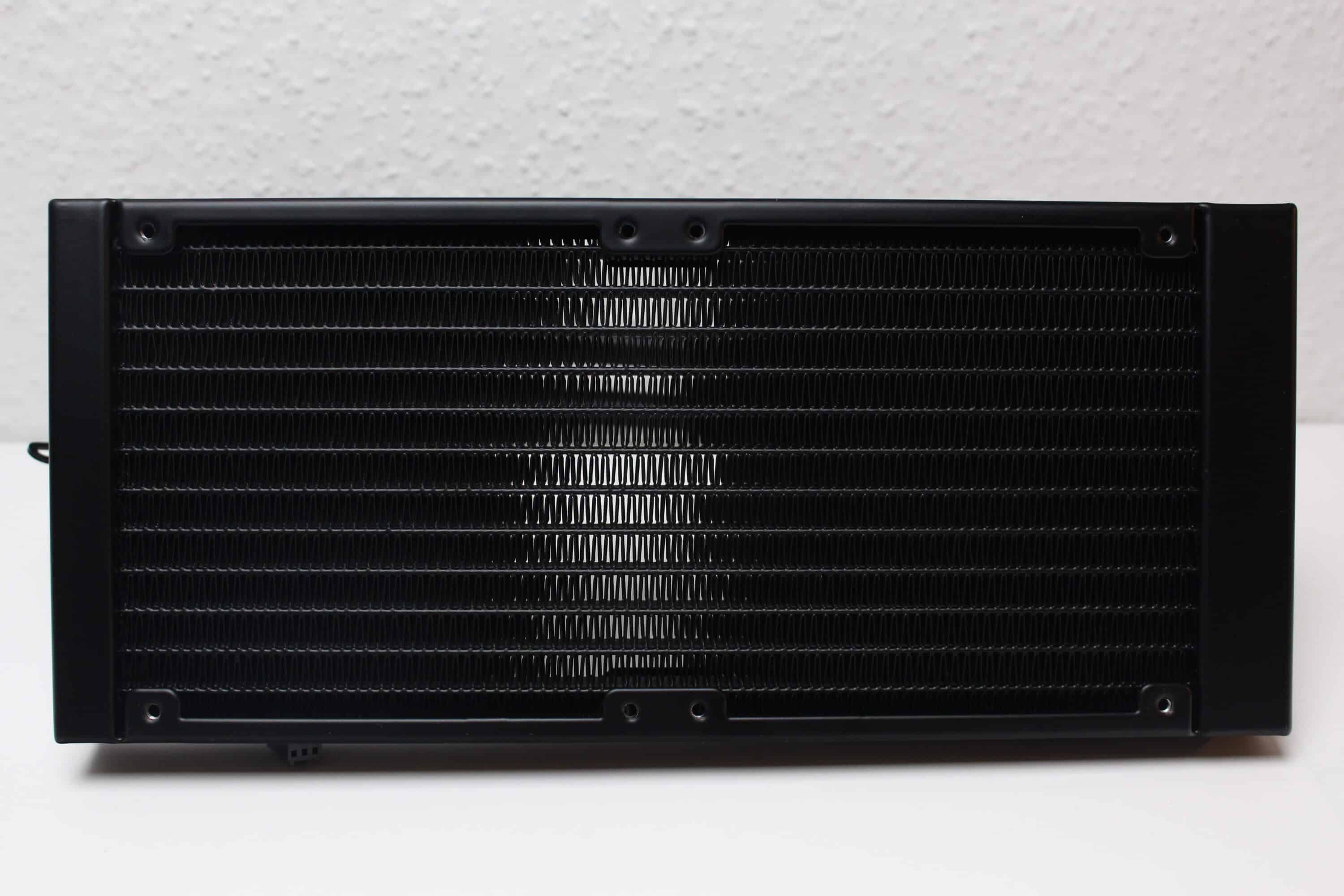 Der Hersteller gestaltet den aus Aluminium gefertigten Radiator der Iceman B-240 unaufdringlich und lackiert alle Lamellen und Abdeckungen in schwarzer Farbe. Darüber hinaus implementiert Argus weder eine Beleuchtung noch Schriftzüge oder sonstige auffällige Akzente am Radiator. Mit einer Tiefe von 27 Millimetern liegt er außerdem im typischen Durchschnitt für Kompaktwasserkühlungen und auch bei der 240er-Variante fließt die Kühlflüssigkeit durch 14 Kanäle.