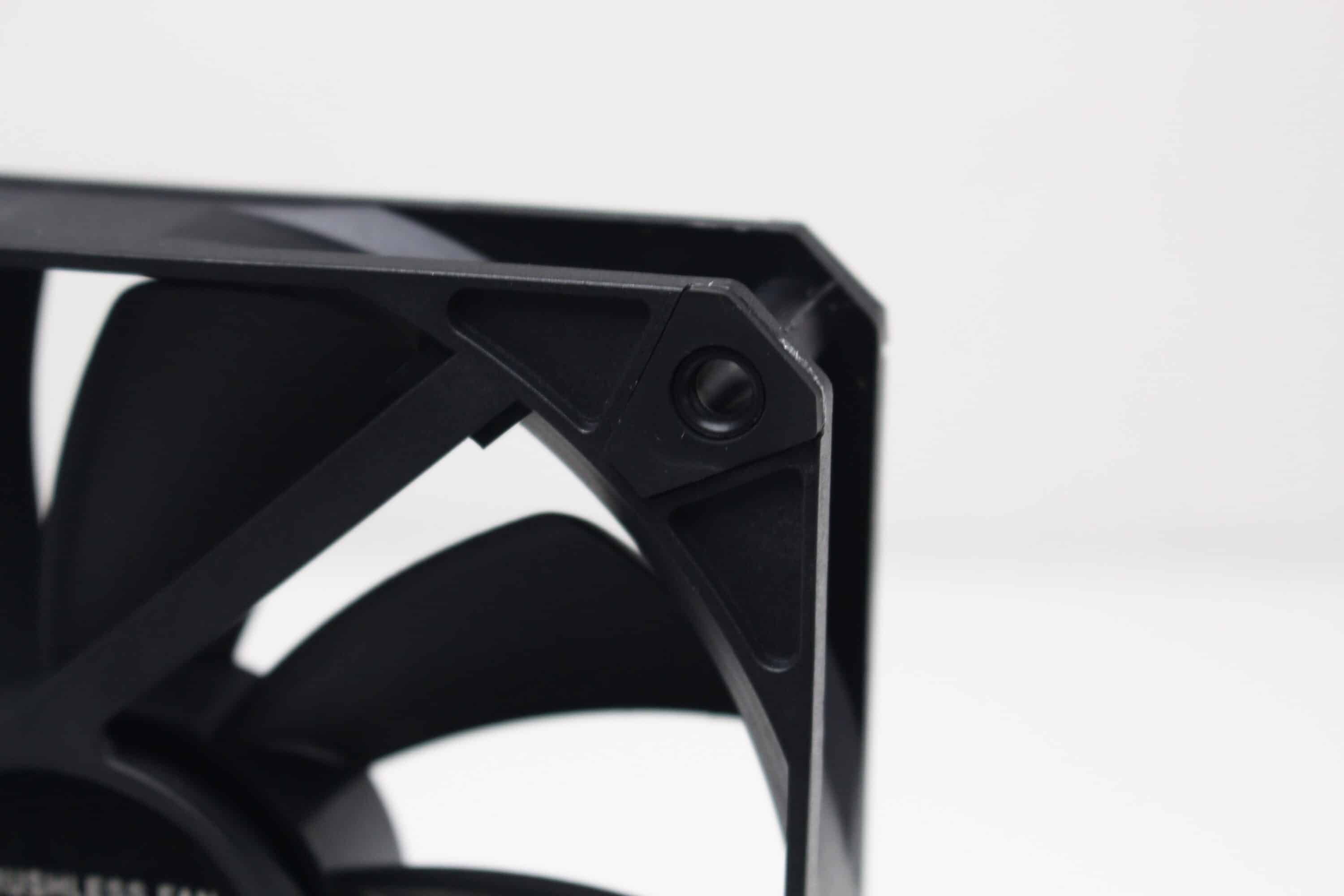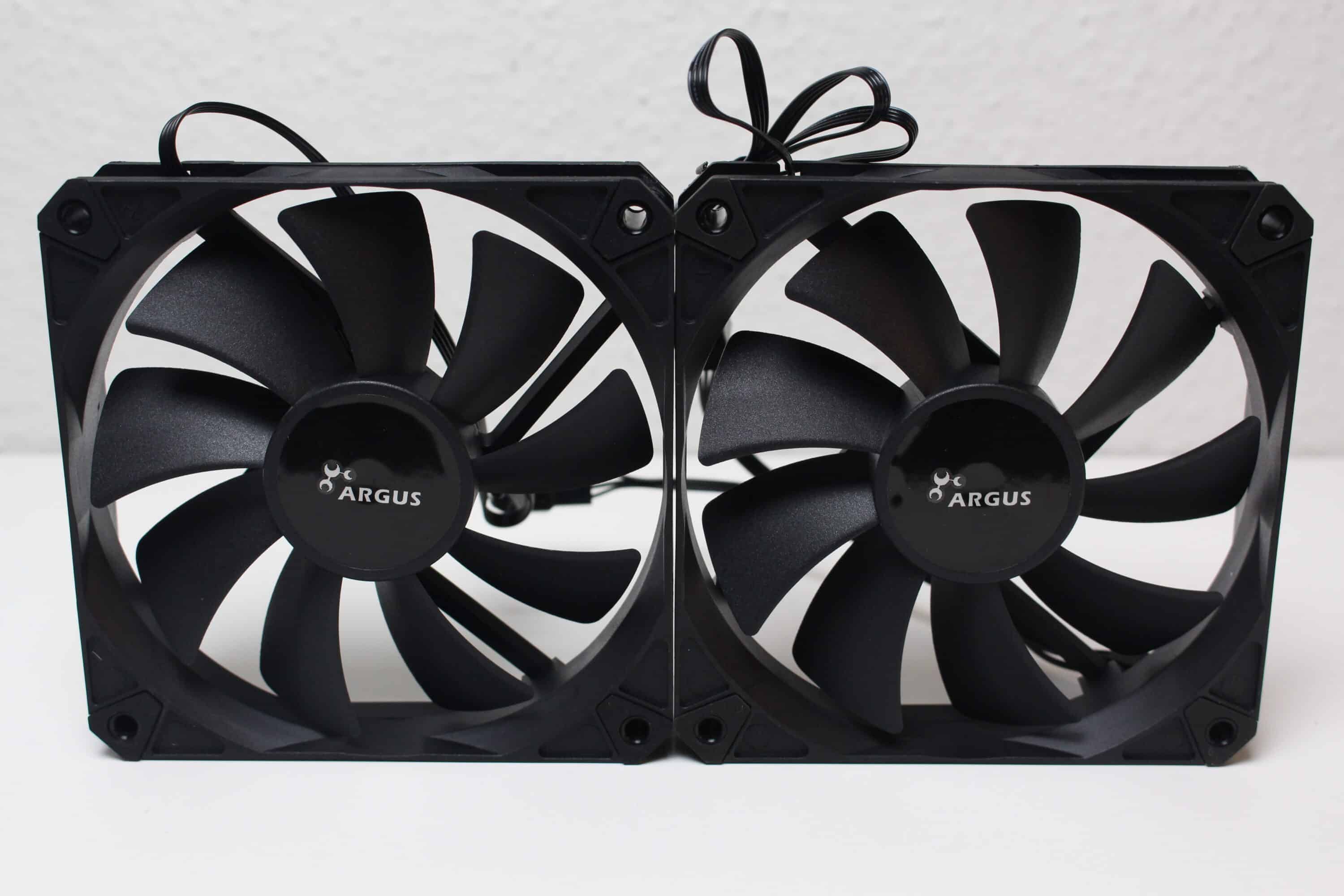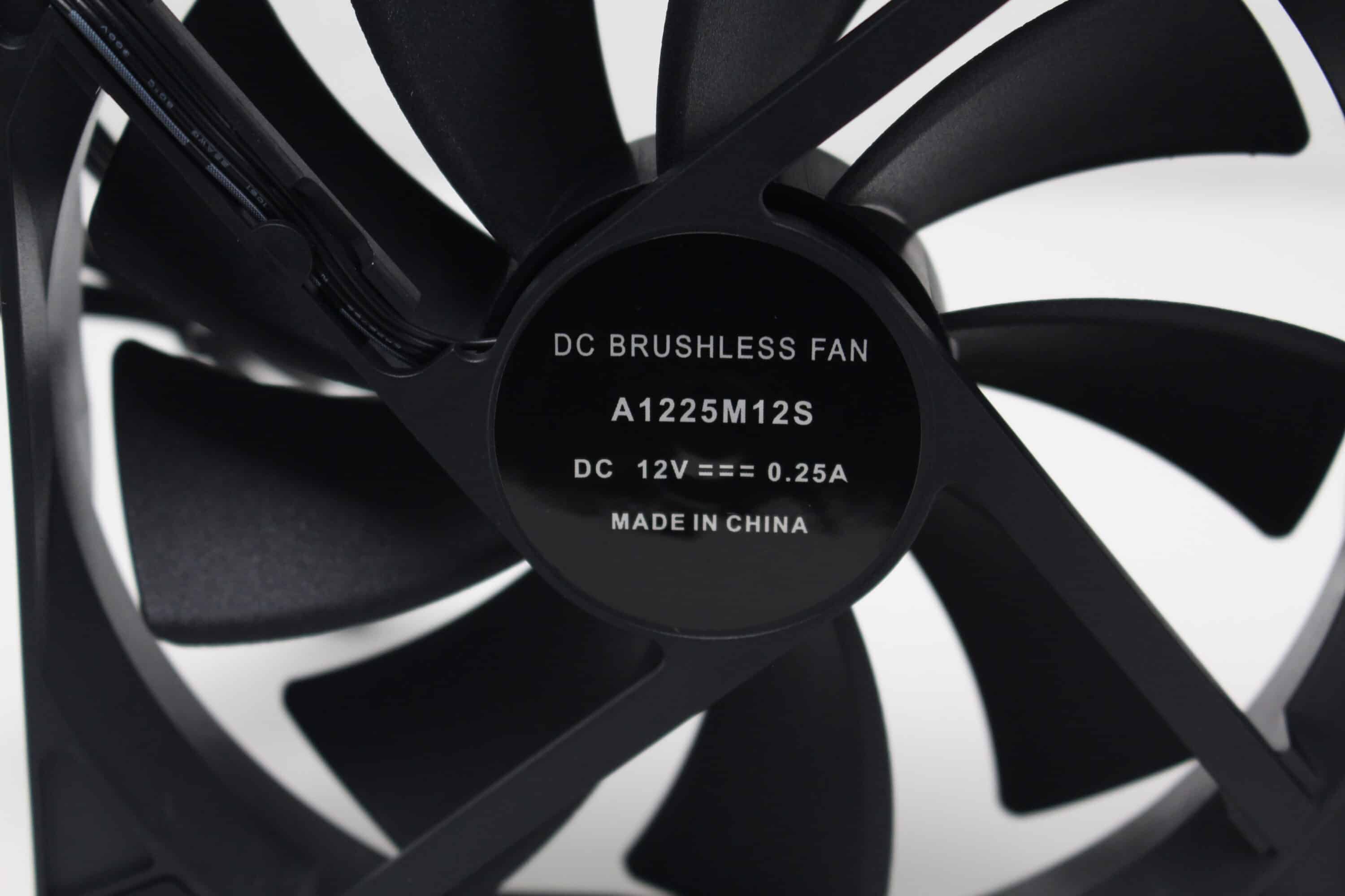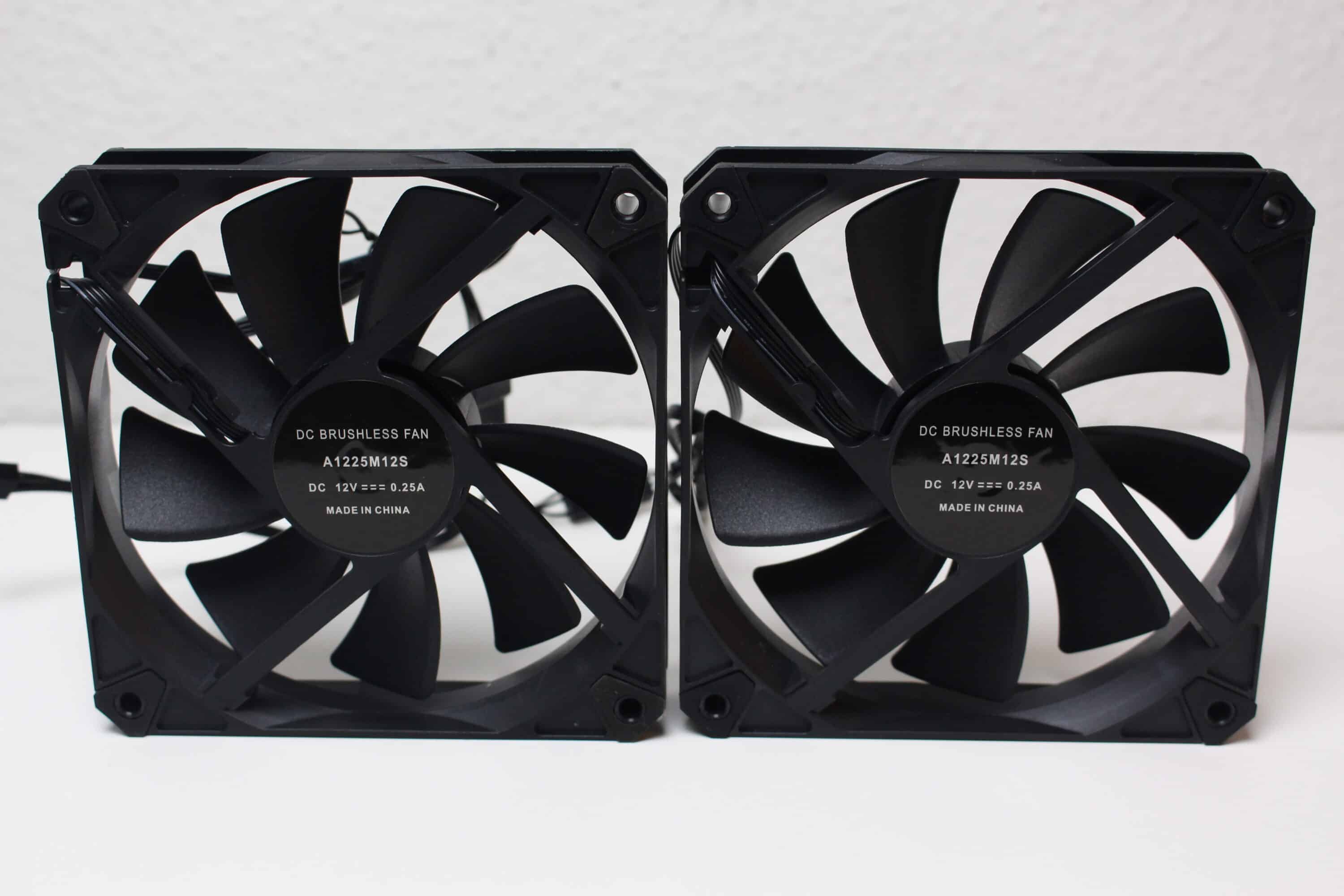 Die zwei mitgelieferten Lüfter vom Typ A1225M12S haben eine Rahmenbreite von 120 Millimetern und setzen sich aus einem schwarzen Lüfterrahmen sowie einem schwarzem Rotor mit neun Blättern zusammen. Die Ansteuerung erfolgt jeweils über einen 4-Pin PWM-Stecker und ermöglicht Drehzahlen zwischen 900 und 1800 Umdrehungen pro Minute. Zudem stattet der Hersteller die Lüfter an allen acht Ecken mit gummierten Flächen zu Entkopplungszwecken aus und legt eine Y-Weiche zum Anschluss der Lüfter bei.