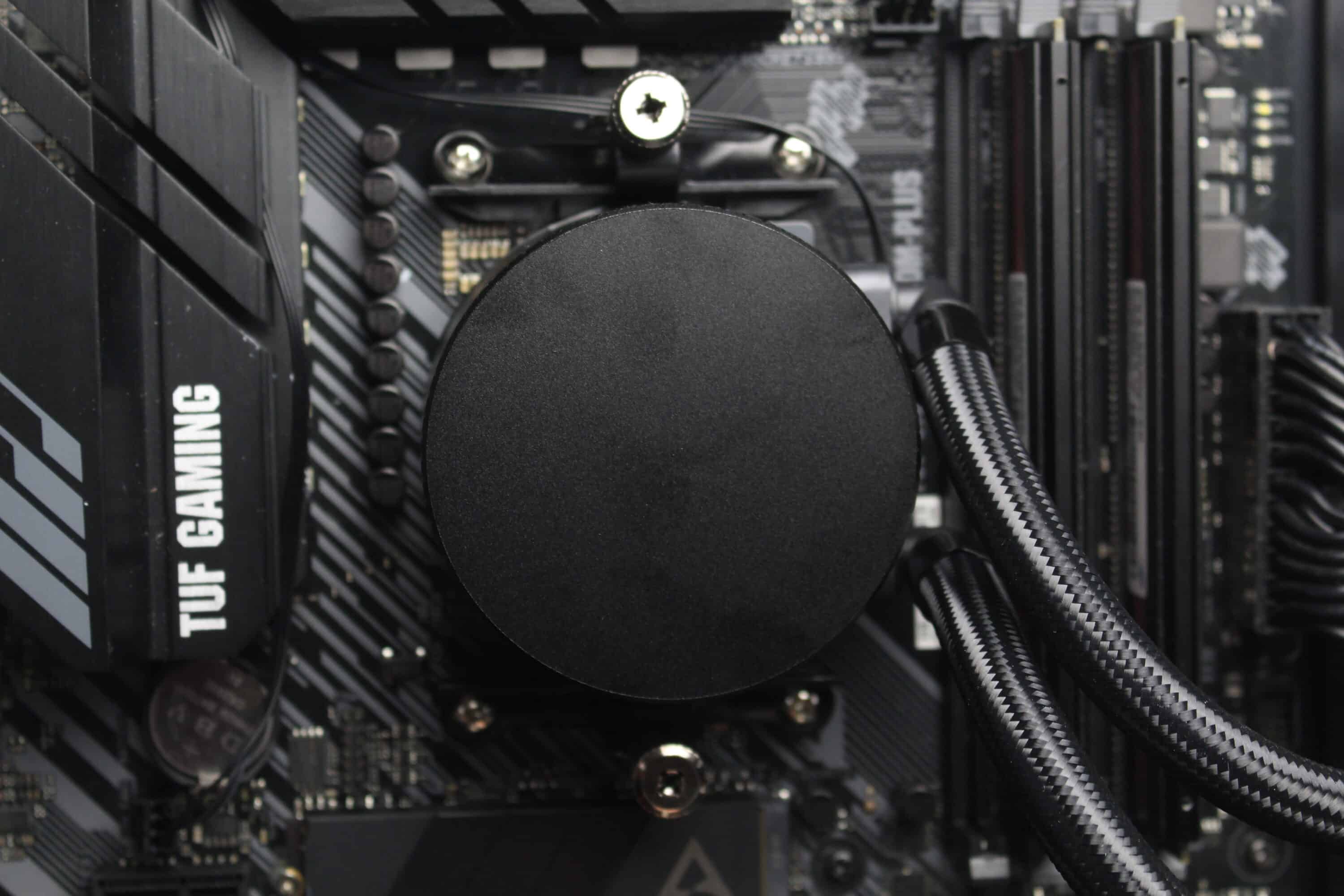 Bei Intel erfolgt die Montage des CPU-Blocks über eine mitgelieferte Backplate aus Kunststoff sowie entsprechende Abstandshalter mit welchen die Backplate an das Mainboard geschraubt wird. Der Rahmen am CPU-Block wird anschließend mit den Abstandshaltern verbunden.