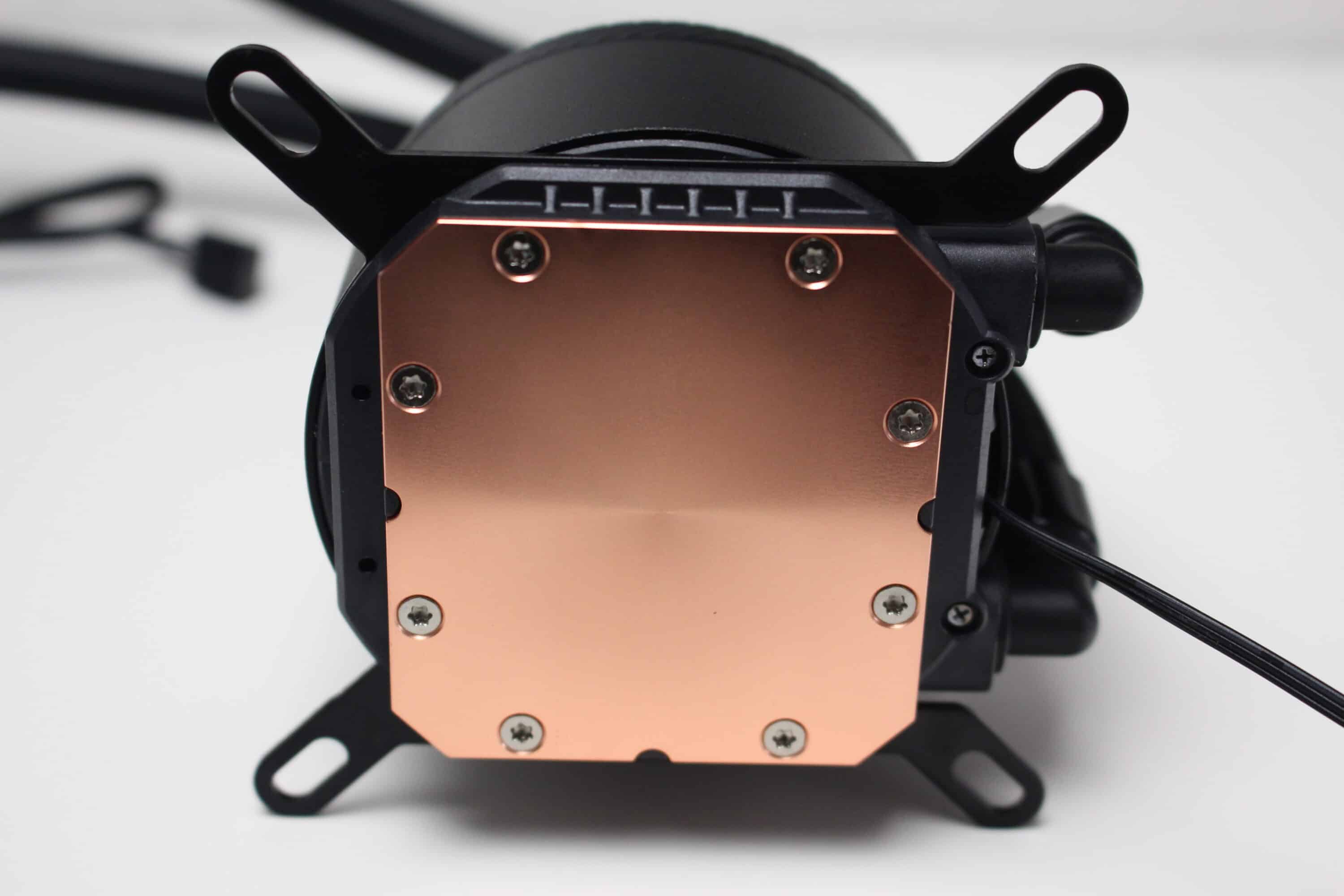 Das Pumpengehäuse der Argus Iceman B-240 ist rund und besteht aus Metall. Auch beim CPU-Block verzichtet Argus auf eine Beleuchtung, hält alles in einem schlichten Schwarz und verzichtet sogar komplett auf ein Logo. Im Inneren des Blocks sorgt eine Pumpe mit Keramiklager und einer maximalen Umdrehungszahl von 2500 Umdrehungen pro Minute für eine stabile Fließrate. Die Aufnahme der CPU-Wärme gewährleistet eine verschraubte Kupferplatte, die ab Werk mit einer Schutzfolie beklebt wurde.