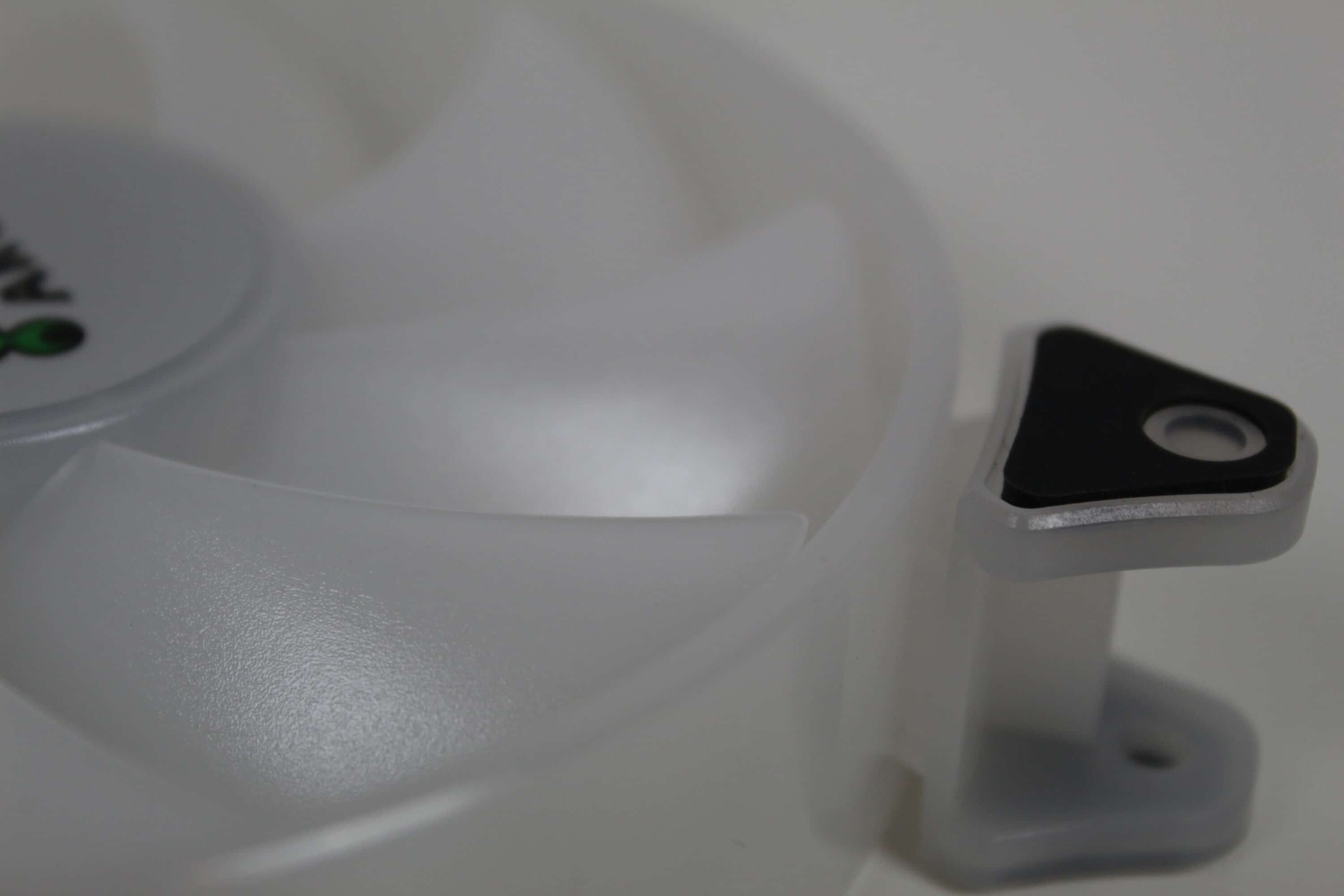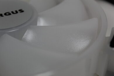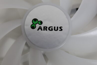Die Lüfter sind in glänzendem weiß gehalten – sowohl der Korpus als auch die Rotorblätter. In der Mitte des Lüfters befindet sich ein Aufkleber mit dem ARGUS-Logo. Dieser ist leider nicht immer perfekt mittig aufgetragen, sodass dieser minimal „eiert“. Grundsätzlich ist die Verarbeitung solide – aufgrund der Materialwahl und der Form kann man diesen jedoch minimal verbiegen – im Alltagsgebrauch sollte dies aber nicht stören. Betrachtet man jedoch die Qualität im Bezug zum Preis, ist diese sehr gut. Die LEDs, die später für die Beleuchtung sorgen, befinden sich versteckt in der Mitte. Diese beleuchten den Lüfter, durch das weiße Material leuchten somit die gesamten Rotorenblätter und minimal ebenfalls der Außenring.