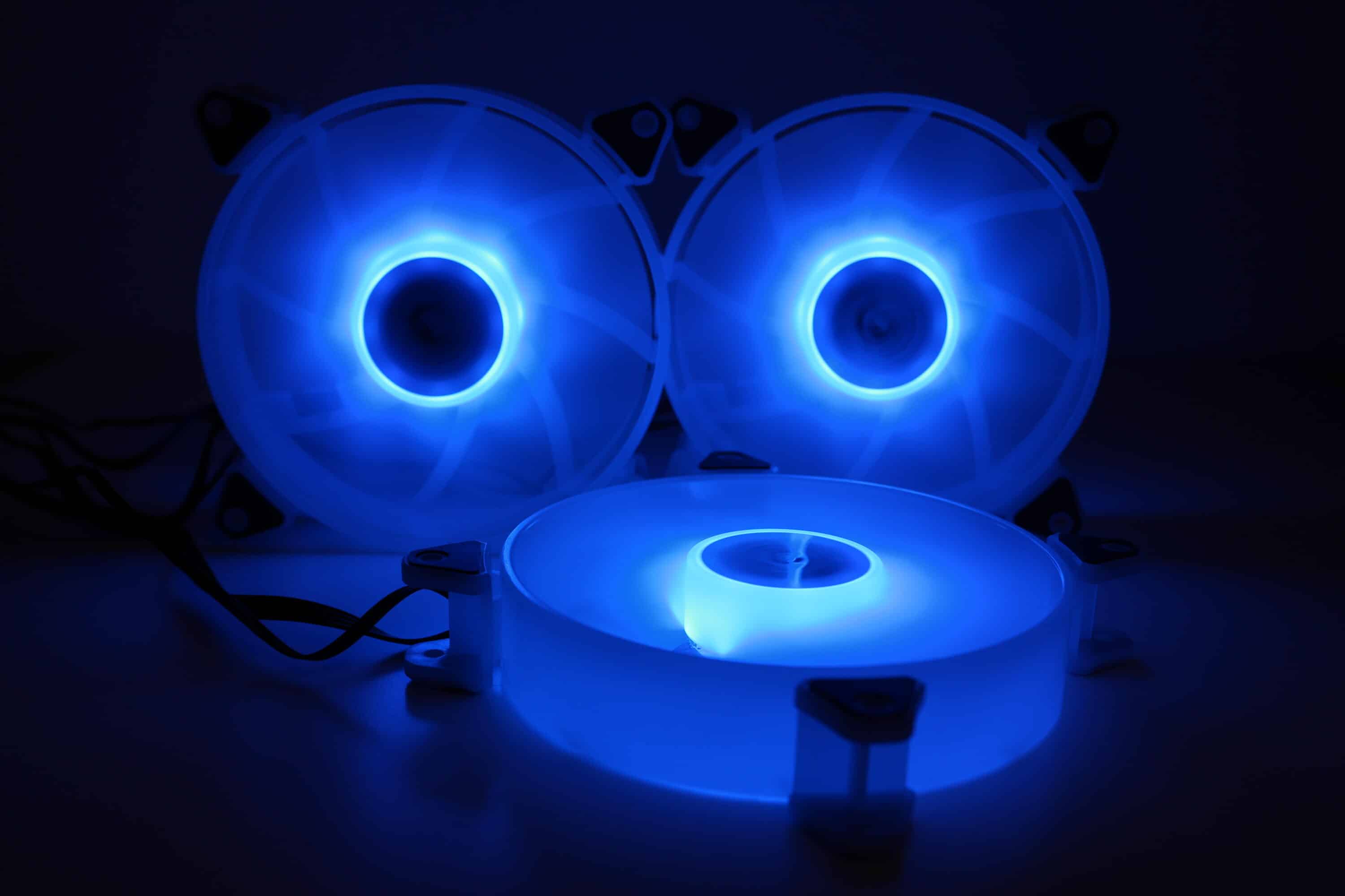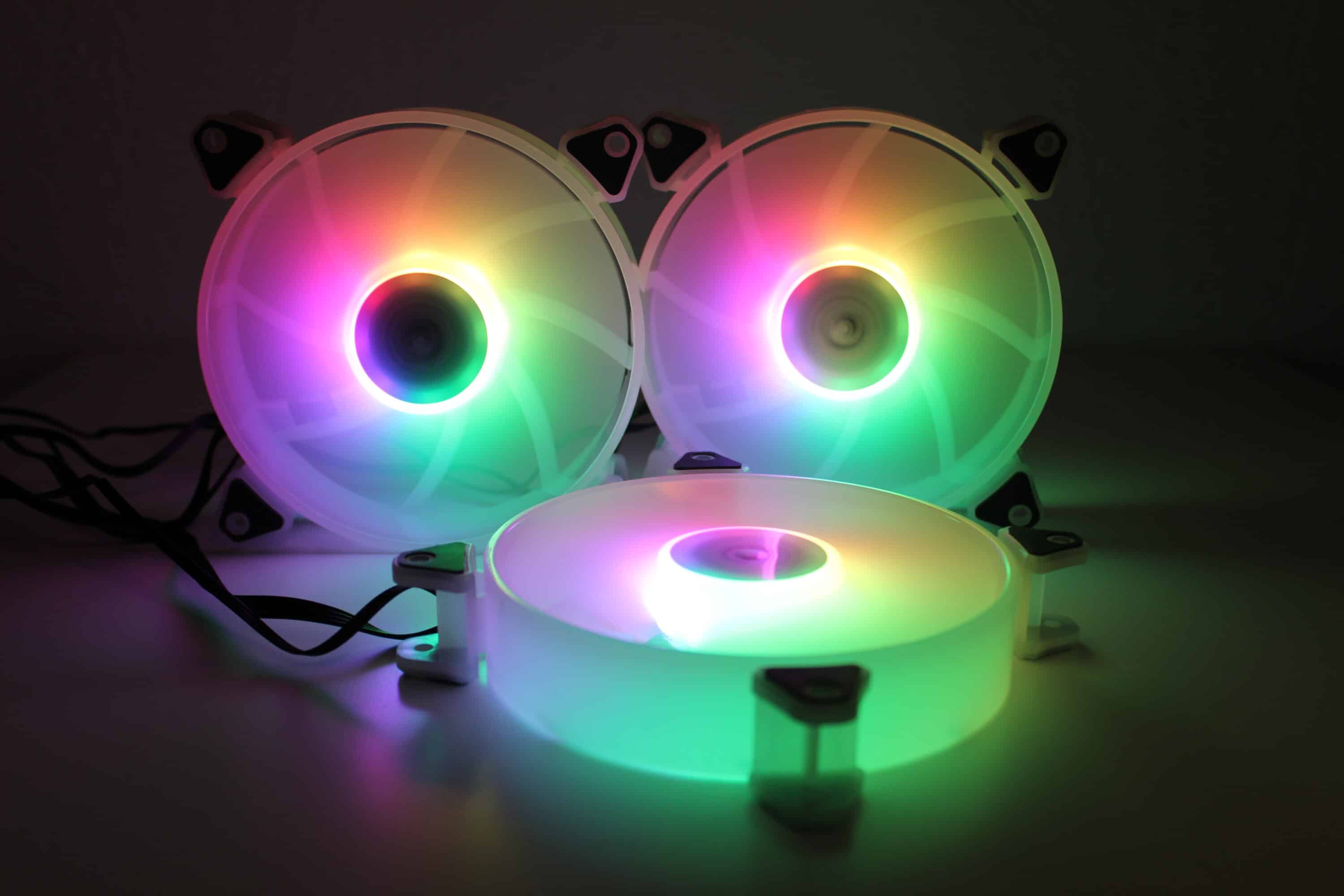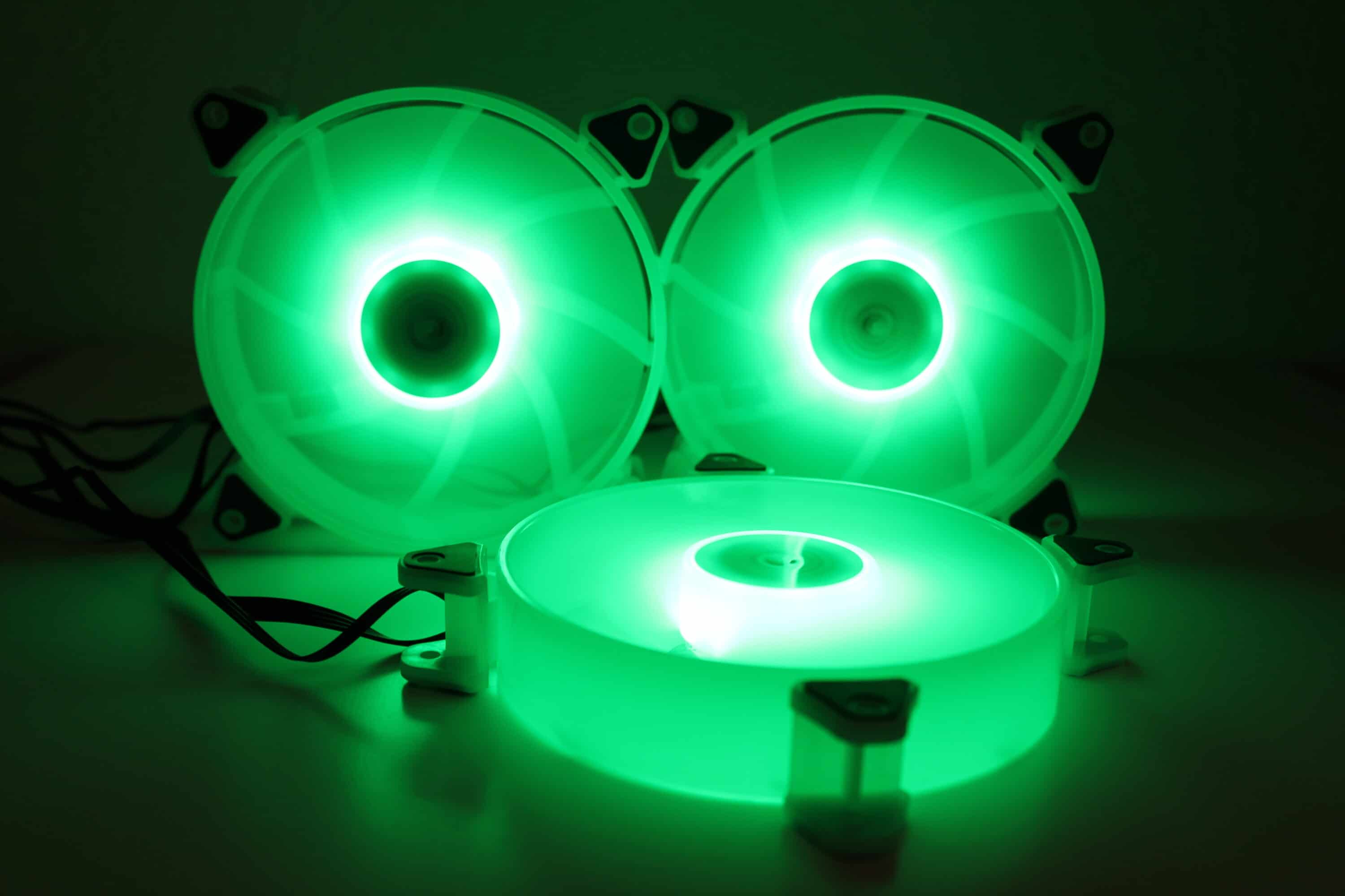 Das generelle Beleuchtungsbild der Lüfter ist in Ordnung. Die offiziellen Produktbilder wirken jedoch deutlich intensiver, besonders bei Tageslicht sind die Lüfter etwas blass – dazu wirkt es, als seien auf den Bildern die Lüfter nahezu durchsichtig. Die Farben werden nach außen hin blasser, der äußere Ring leuchtet nicht so extrem, wie es hier dargestellt wird. Dies ist in gewisser Hinsicht schade, denn die Optik der Lüfter ist sehr ansprechend – etwas realistischere Produktbilder würden nicht schaden. Dazu sei aber auch zusagen, dass unsere Bilder relativ „extrem“ wirken – in echt wirkt die Beleuchtung etwas blasser.