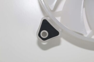 Der Mittelpunkt ist auf der Rückseite über acht Streben mit dem Rest des Lüfters verbunden. Die acht Streben sorgen für eine solide Grundstabilität. Außerdem werden hier die Kabel nach außen geführt. Neben dem üblichen 4-Pin-PWM-Kabel zur Ansteuerung des eigentlichen Lüfters, wird hier auf ein proprietäres RGB-Kabel gesetzt. Die Kabel sind schwarz und auf einen zusätzlichen Sleeve wird verzichtet.