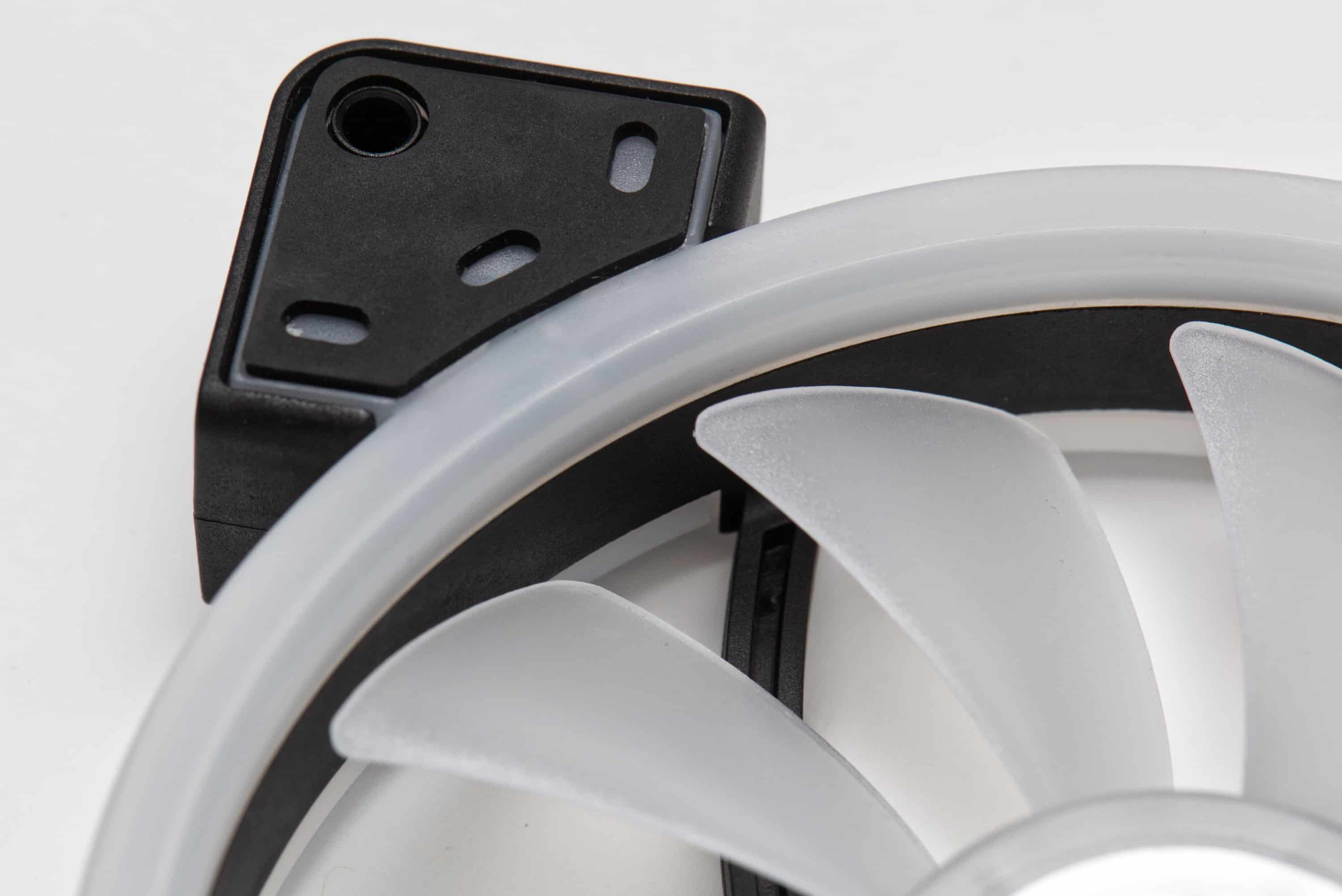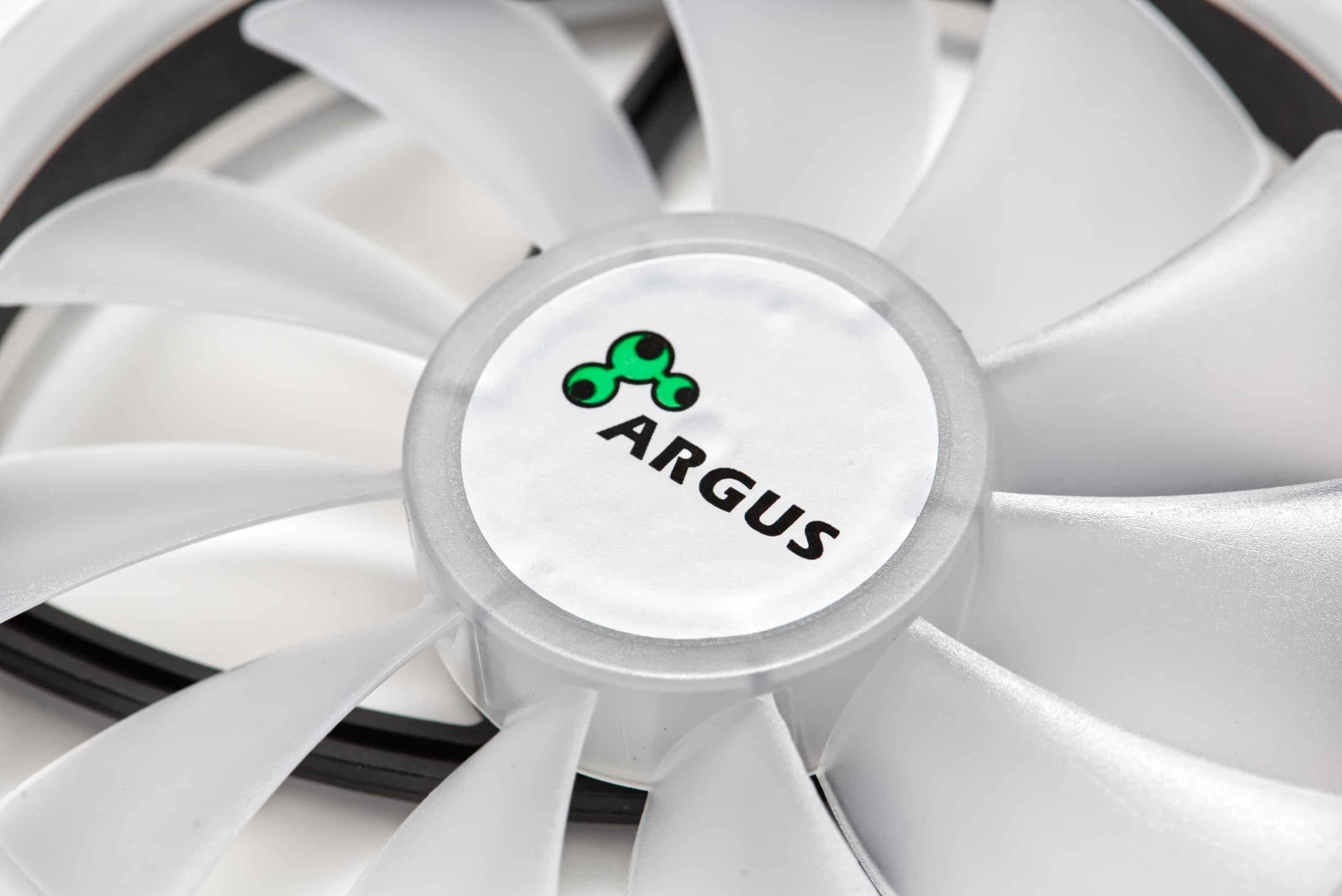 Die Inter-Tech Argus RS-14 sind schon recht große Lüfter mit ihren 140 mm in Höhe und Breite. Durch die Breite des Rahmens sind die Lüfterblätter der Argus RS-14 allerdings etwas kleiner als bei manchen anderen 140-mm-Lüftern. Alle beleuchteten Teile des Rahmens und der Lüfterblätter sind in einem milchigen Weiß gehalten. Dagegen stehen die strukturellen Teile des Rahmens in einem starken Kontrast durch ihre schwarze Farbe.