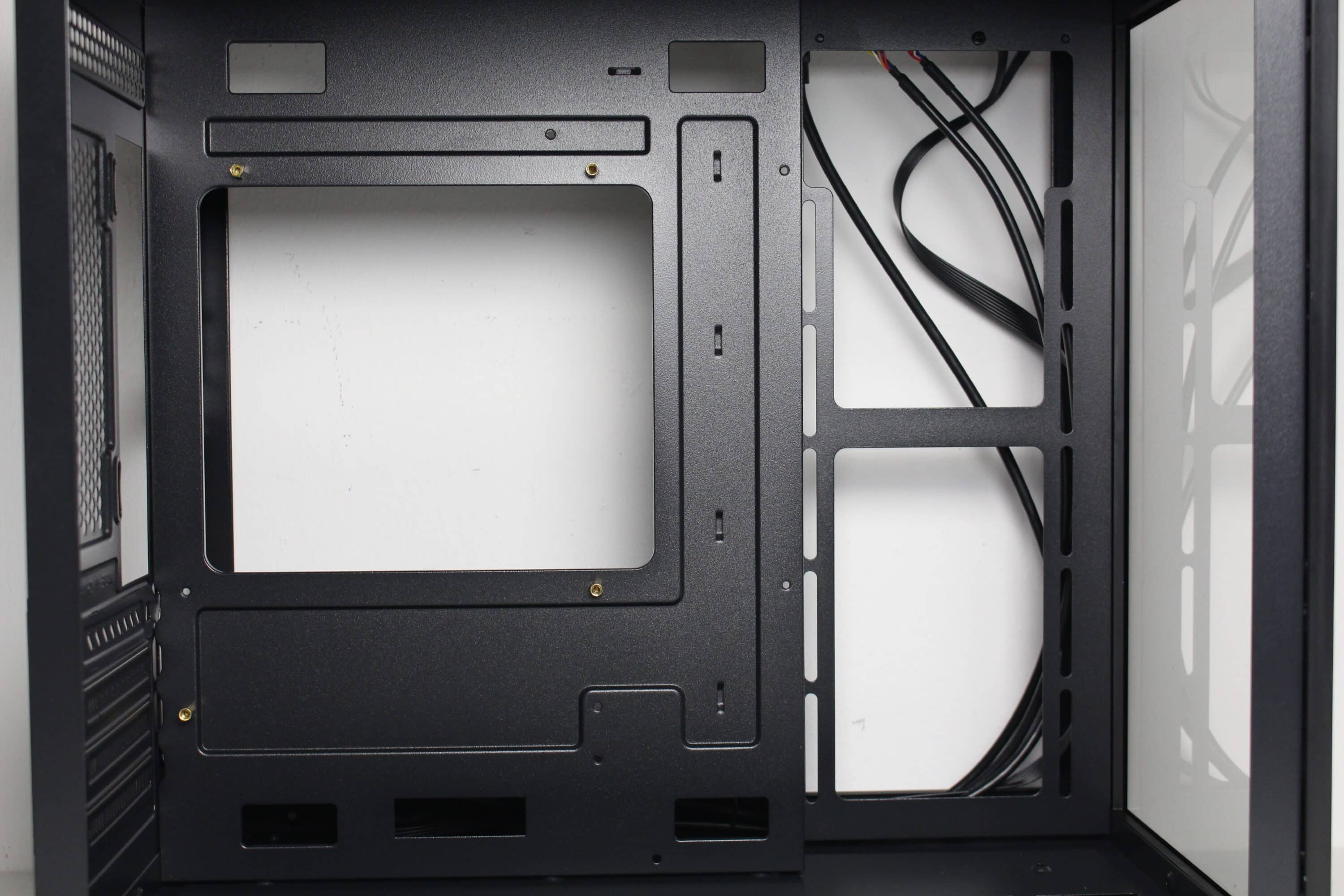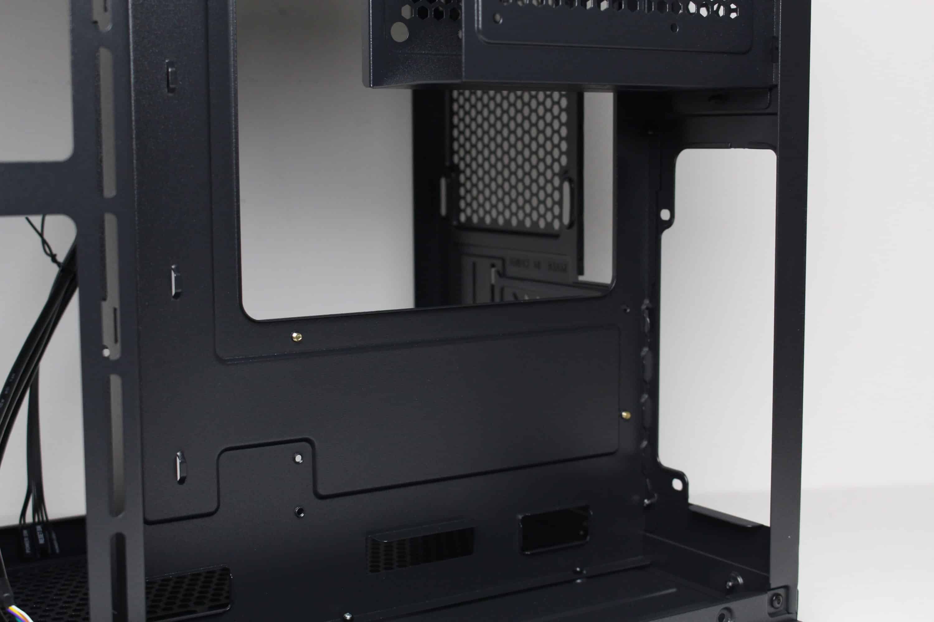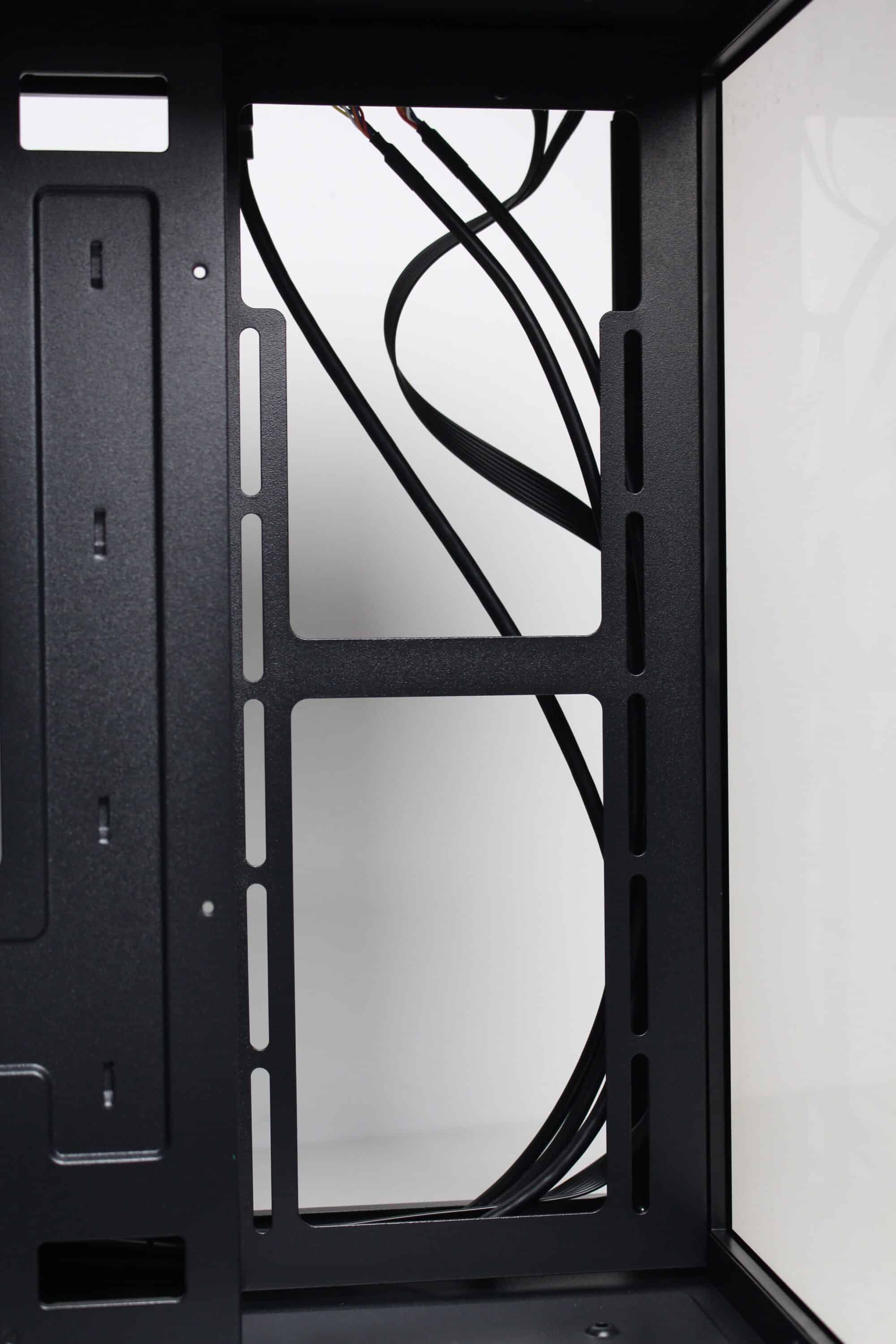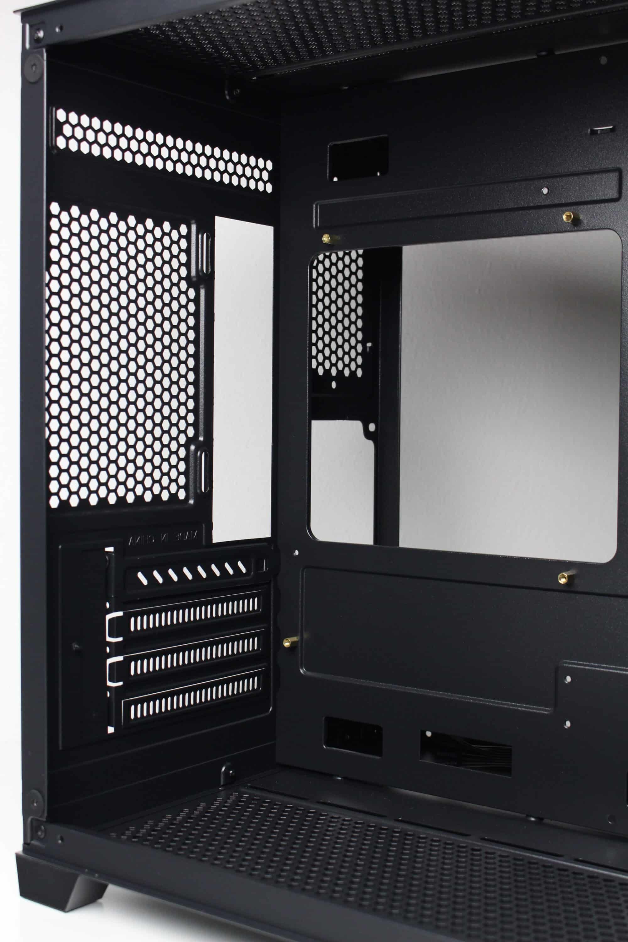 Wie bereits vermutet, besteht der Innenraum des C-501 aus zwei Kammern. Die große Hauptkammer bietet Platz für ein µATX-Mainboard, eine lange Grafikkarte sowie diverse Lüfter unterhalb, oberhalb und seitlich des Mainboards. Im oberen Bereich gibt es zudem soviel Platz, dass hier problemlos eine AiO-Wasserkühlung mit einem dicken 240-mm-Radiator verbaut werden kann. Um die Verkabelung der Komponenten zur erleichtern platziert der Hersteller rund um das Mainboard-Tray zahlreiche Öffnungen. Die Durchführungen an der rechten Seite des Trays sind um 90 Grad abgewinkelt.