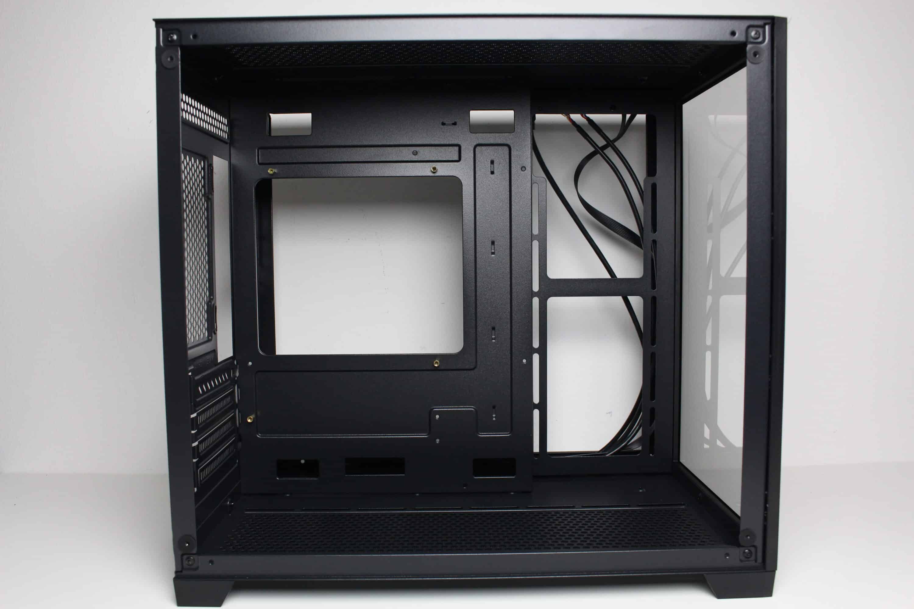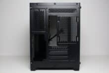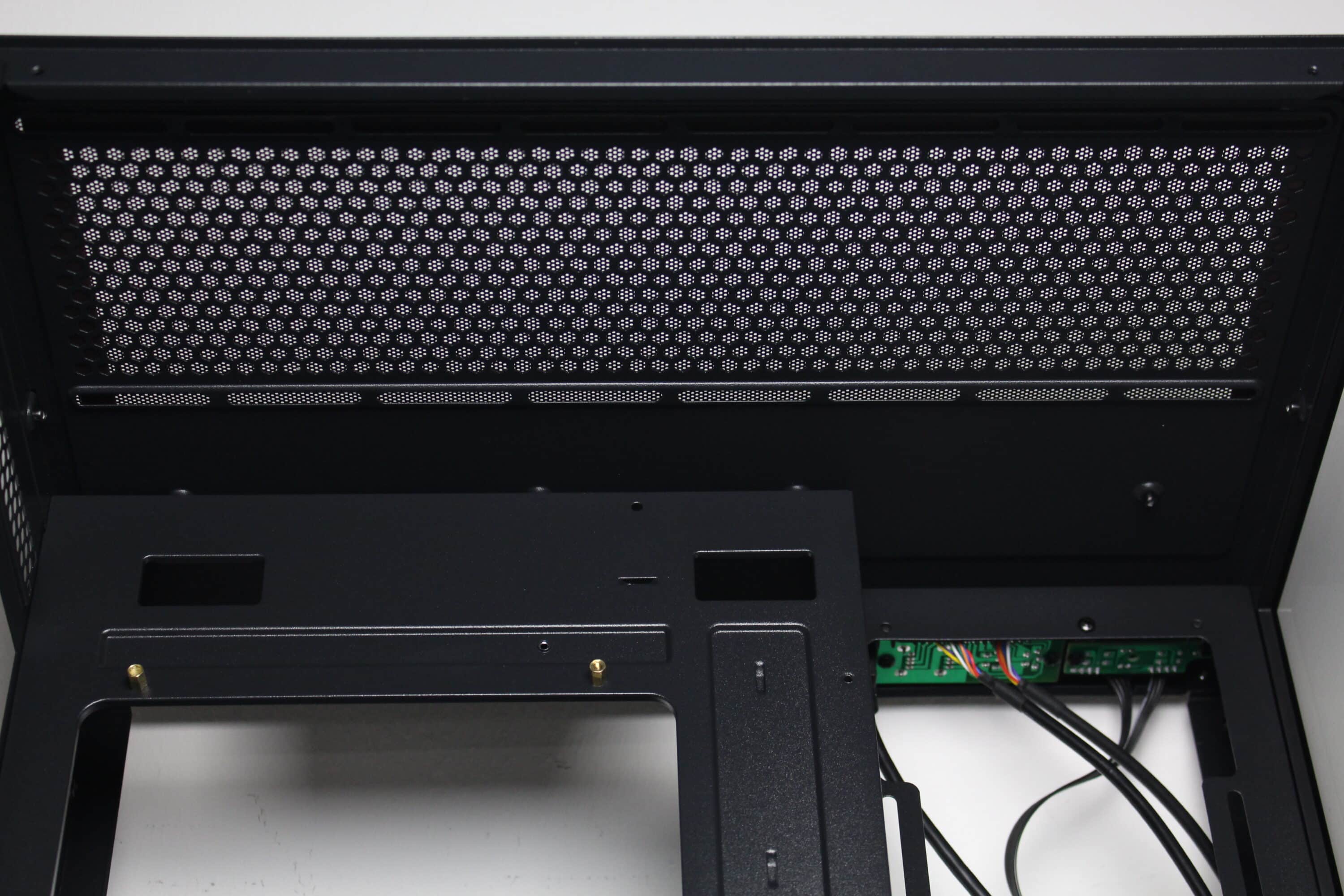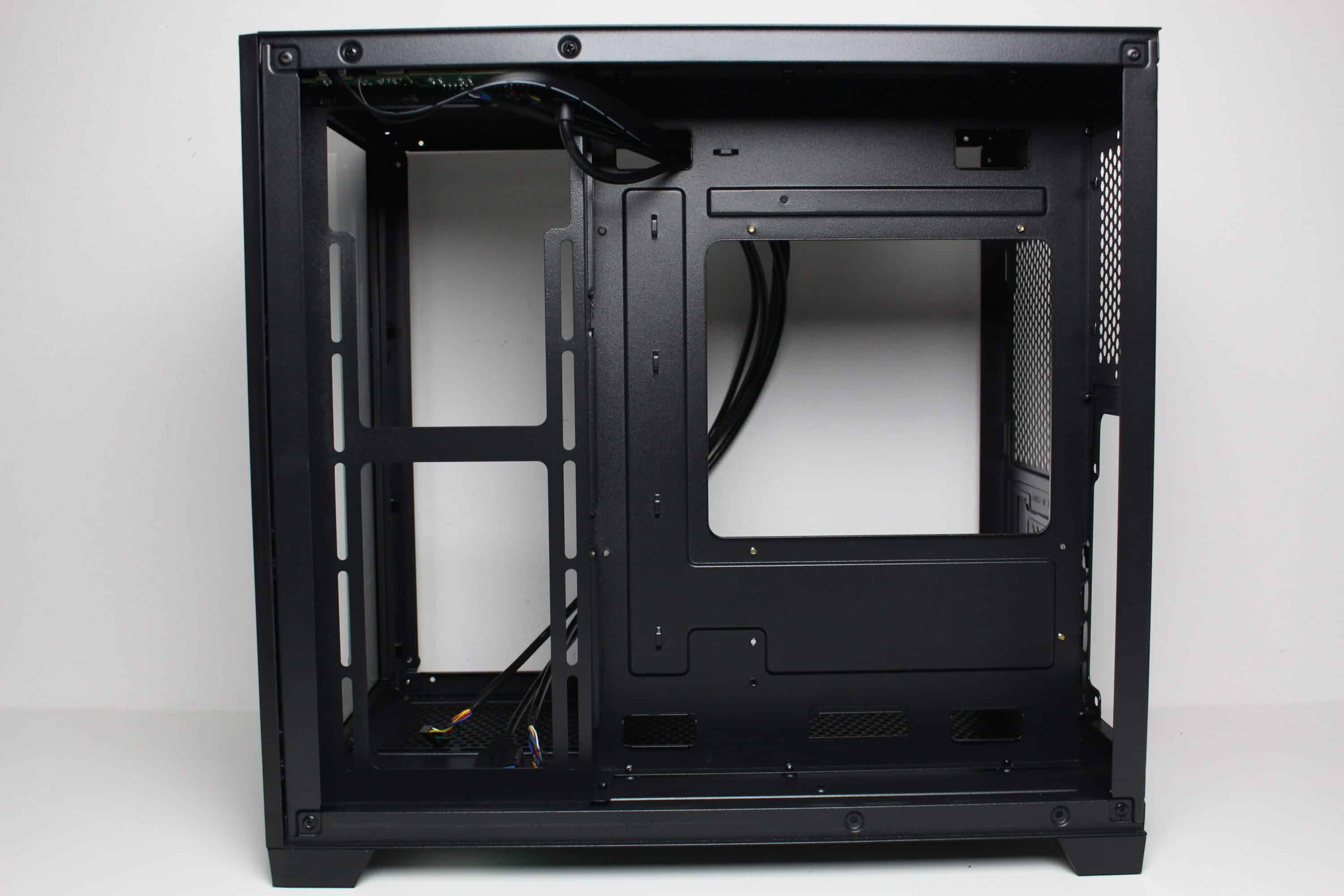 Wie bereits vermutet, besteht der Innenraum des C-501 aus zwei Kammern. Die große Hauptkammer bietet Platz für ein µATX-Mainboard, eine lange Grafikkarte sowie diverse Lüfter unterhalb, oberhalb und seitlich des Mainboards. Im oberen Bereich gibt es zudem soviel Platz, dass hier problemlos eine AiO-Wasserkühlung mit einem dicken 240-mm-Radiator verbaut werden kann. Um die Verkabelung der Komponenten zur erleichtern platziert der Hersteller rund um das Mainboard-Tray zahlreiche Öffnungen. Die Durchführungen an der rechten Seite des Trays sind um 90 Grad abgewinkelt.