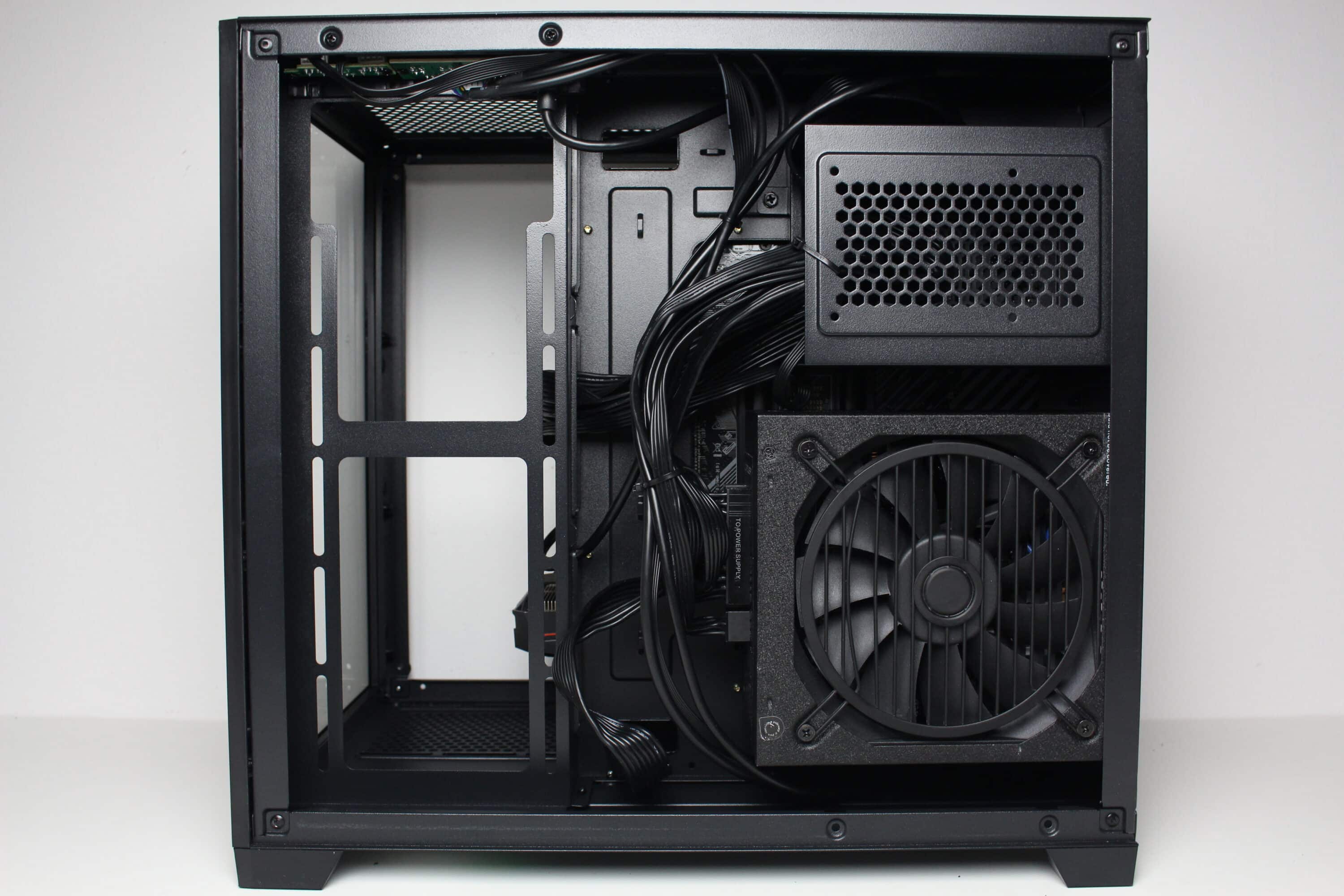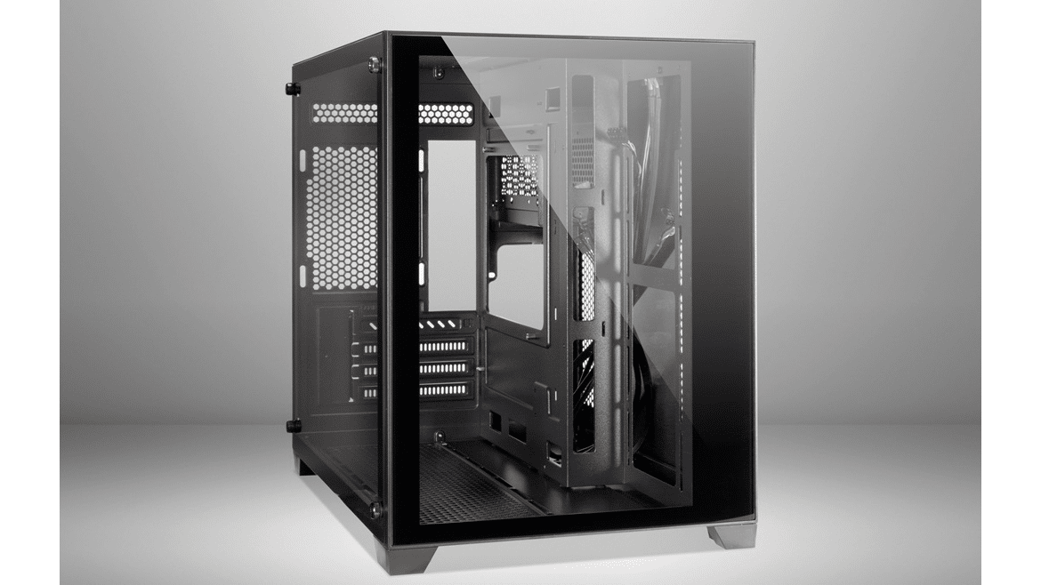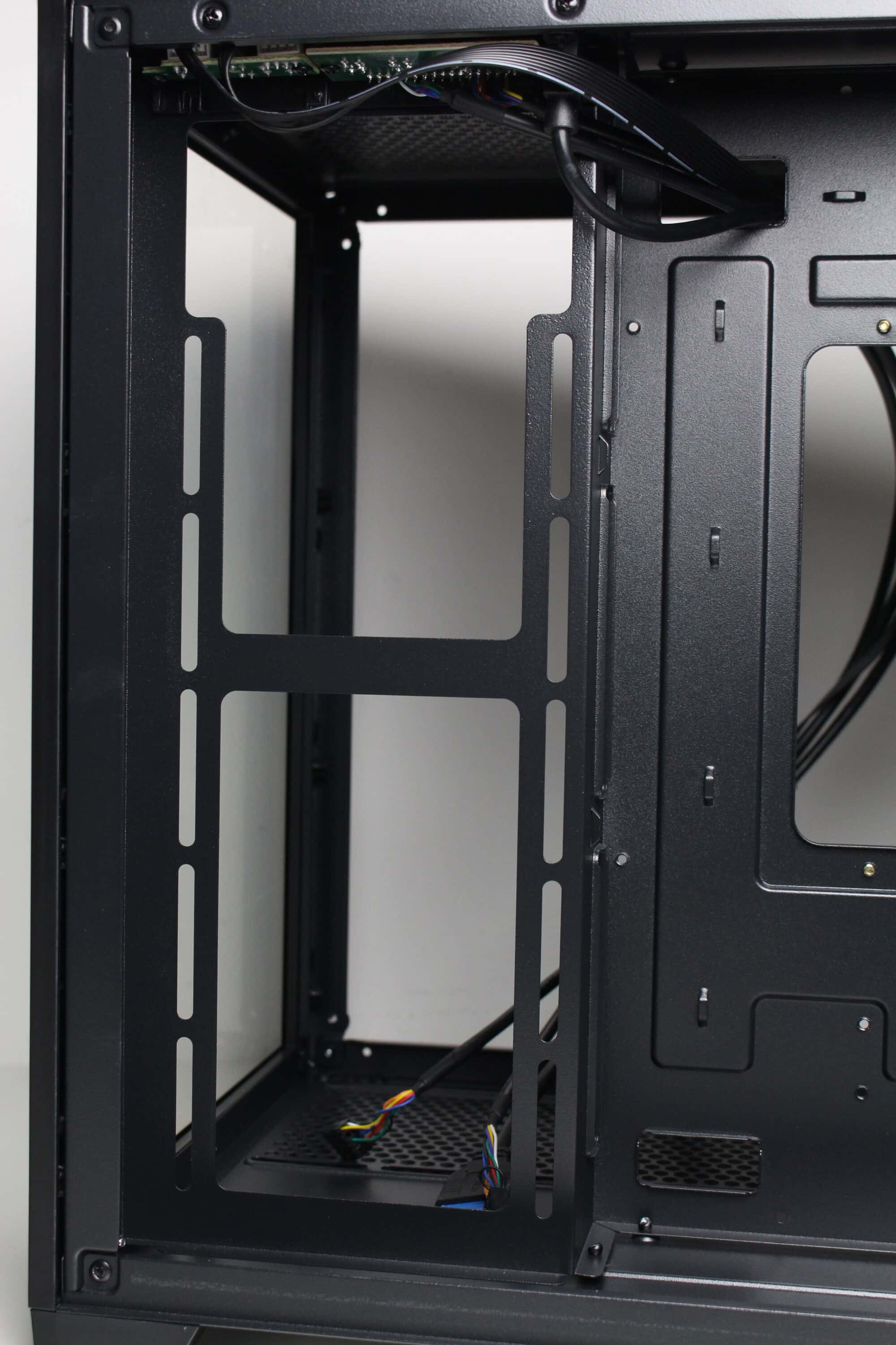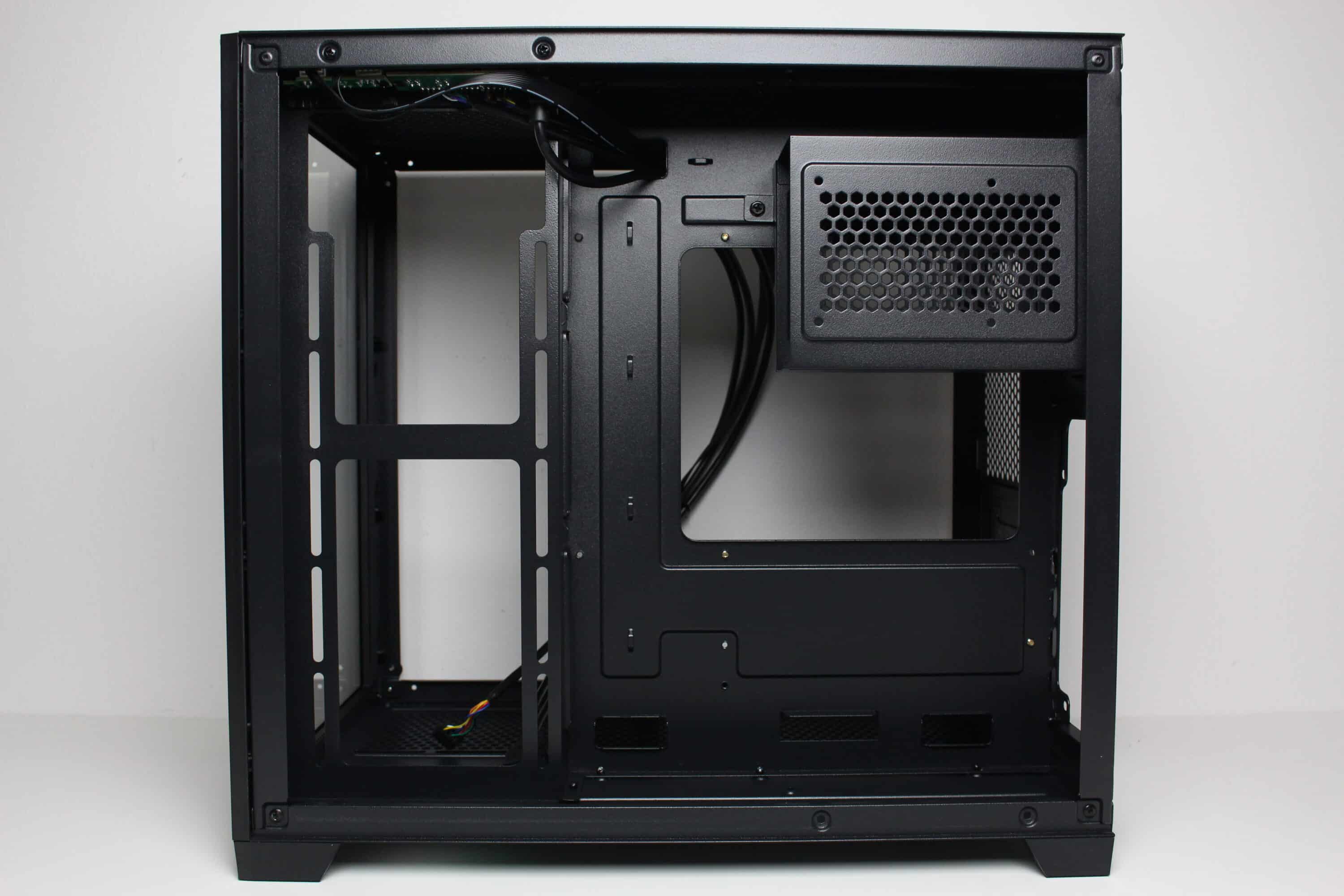 Wie bereits vermutet, besteht der Innenraum des C-501 aus zwei Kammern. Die große Hauptkammer bietet Platz für ein µATX-Mainboard, eine lange Grafikkarte sowie diverse Lüfter unterhalb, oberhalb und seitlich des Mainboards. Im oberen Bereich gibt es zudem soviel Platz, dass hier problemlos eine AiO-Wasserkühlung mit einem dicken 240-mm-Radiator verbaut werden kann. Um die Verkabelung der Komponenten zur erleichtern platziert der Hersteller rund um das Mainboard-Tray zahlreiche Öffnungen. Die Durchführungen an der rechten Seite des Trays sind um 90 Grad abgewinkelt.