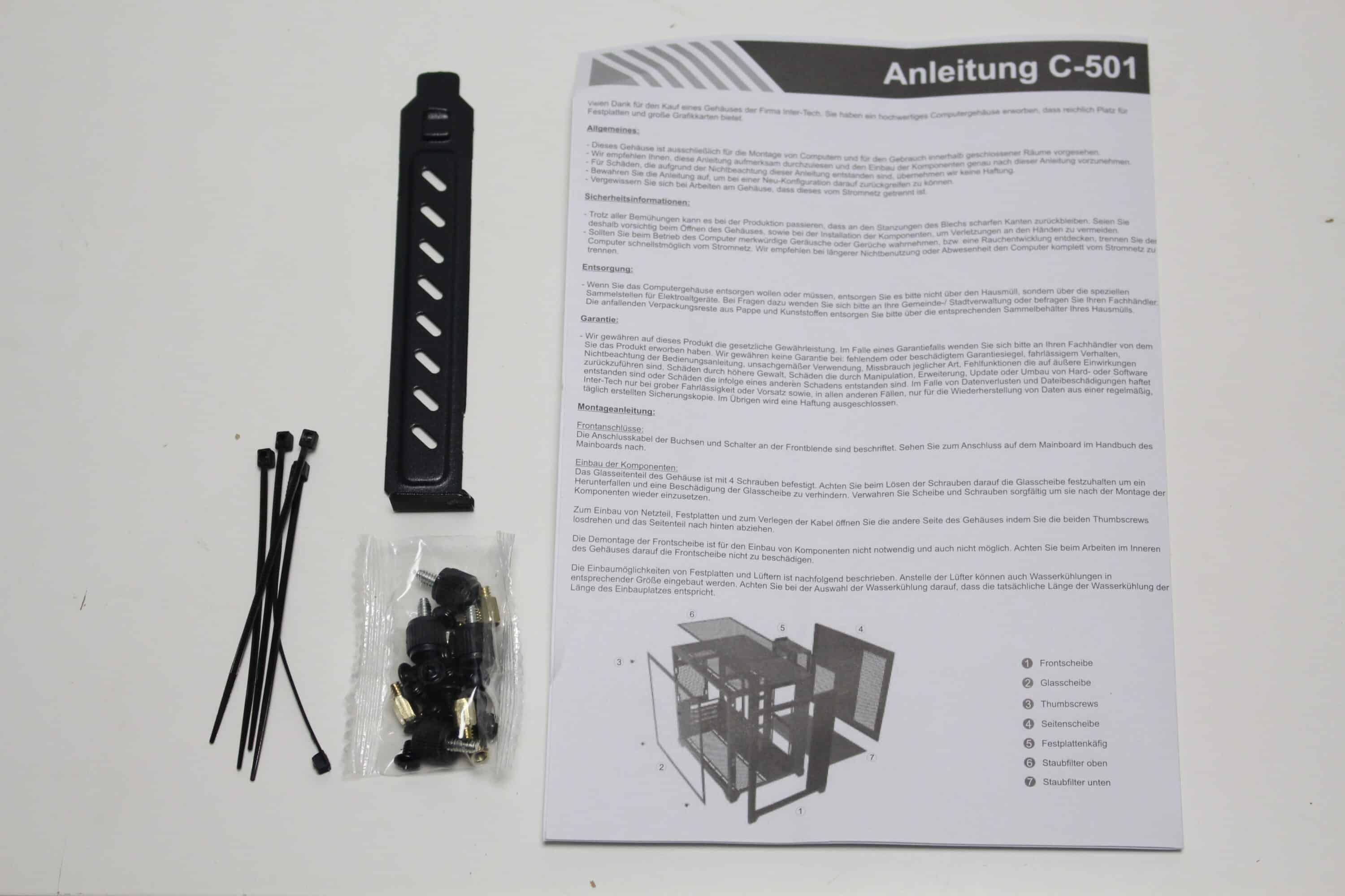 Im Inneren der Verpackung umhüllt der Hersteller das C-501 Aspect mit zwei dünnen Blöcken aus herkömmlichen Styropor um Stöße beim Transport abzufangen sowie mit einer Folie aus Kunststoff um Kratzer zu verhindern. Die Styroporblöcke sind aus unserer Sicht aber etwas zu dünn geraten. Das Montagezubehör befindet sich in einem kleinen Kunststoffbeutel und beinhaltet eine Handvoll Kabelbinder, alle notwendigen Montageschrauben, eine Nuss zum Eindrehen der Abstandshalter und eine Ersatzblende für die Erweiterungsslots. Zuletzt legt Inter-Tech dem C-501 Aspect auch noch eine sehr kurze Montageanleitung bei.