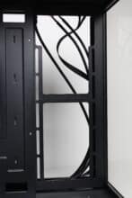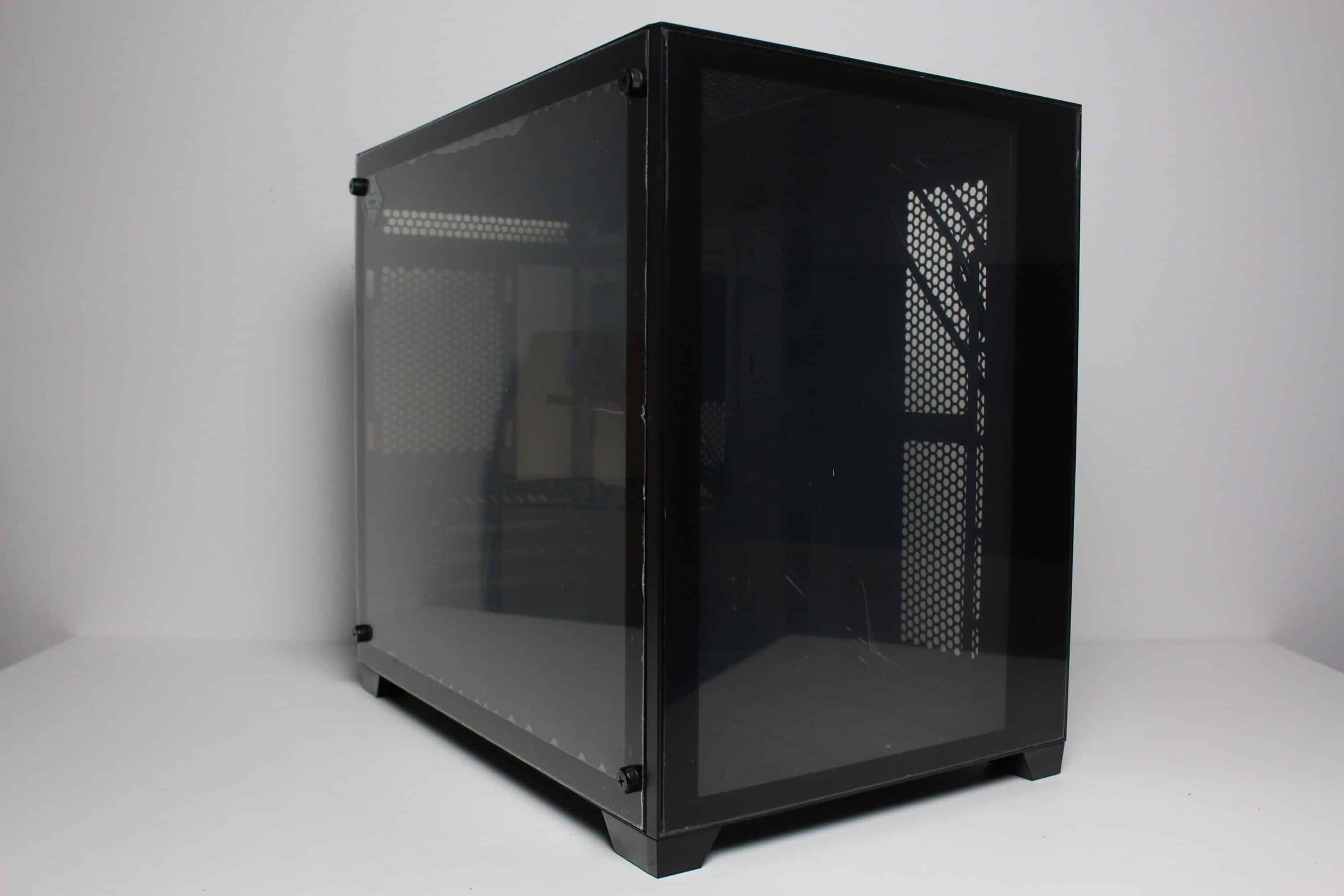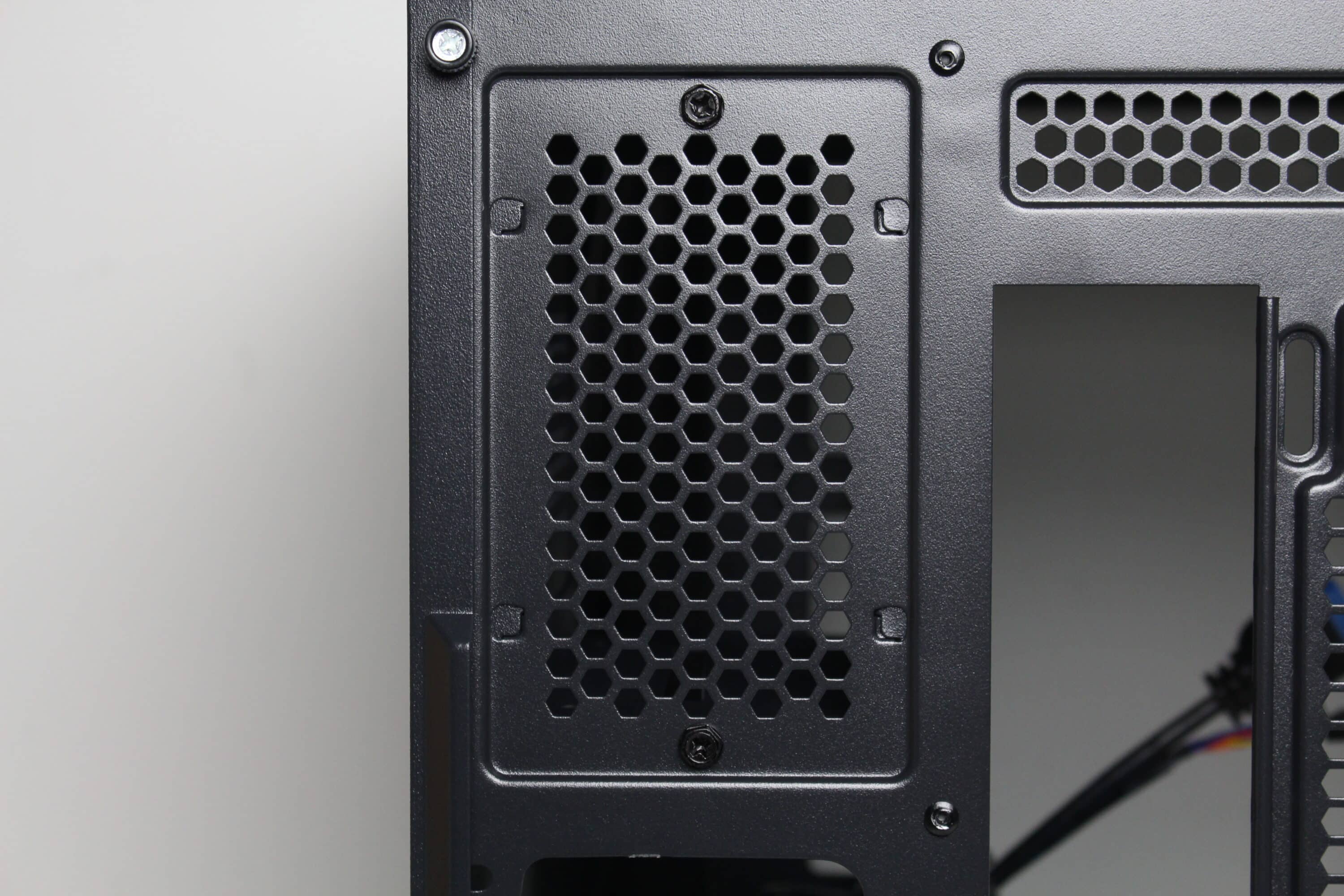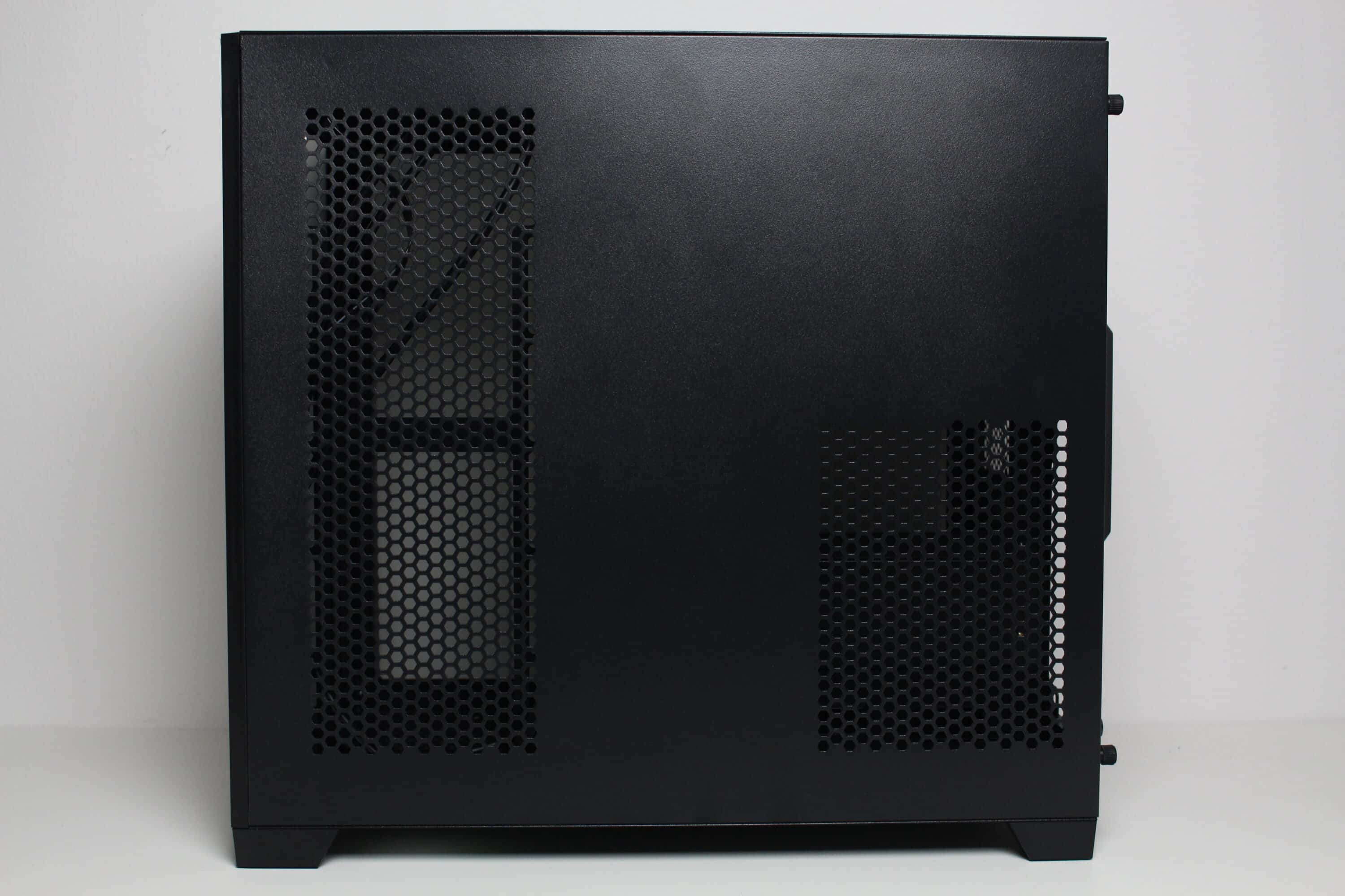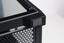 Wie bereits erwähnt, besteht das linke Seitenteil beim Inter-Tech C-501 Aspect aus Tempered Glass. Die Verbindung mit dem Korpus erfolgt eher altmodisch über vier Rändelschrauben, die durch die Glasscheibe geschoben und verschraubt werden. Wie das Frontfenster verfügt auch das Seitenfenster über eine Schutzfolie und eine schwarze Umrandung. Des rechte Seitenteil besteht aus Stahl und besitzt zwei unterschiedlich große und filterlose Belüftungsöffnungen in Honigwaben-Optik. Zur Befestigung am Korpus kommen hier zwei Rändelschrauben mit Kunststoffmantel zum Einsatz und auch eine Griffmulde ist vorhanden. Die gewählte Materialstärke ist grenzwertig.