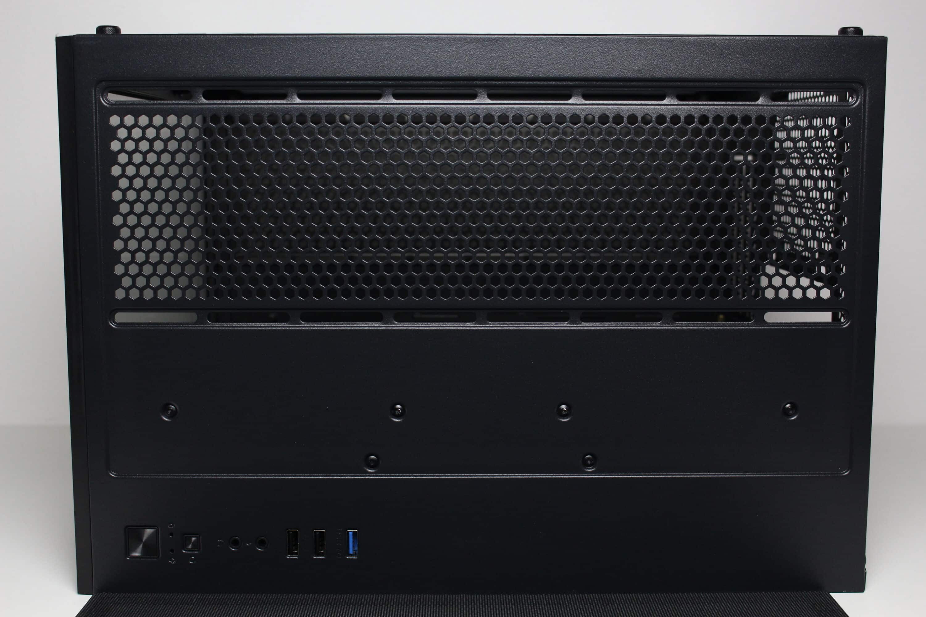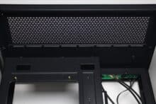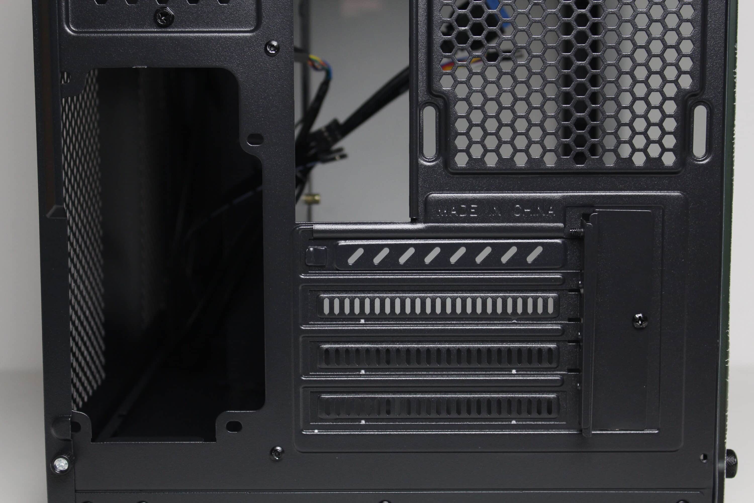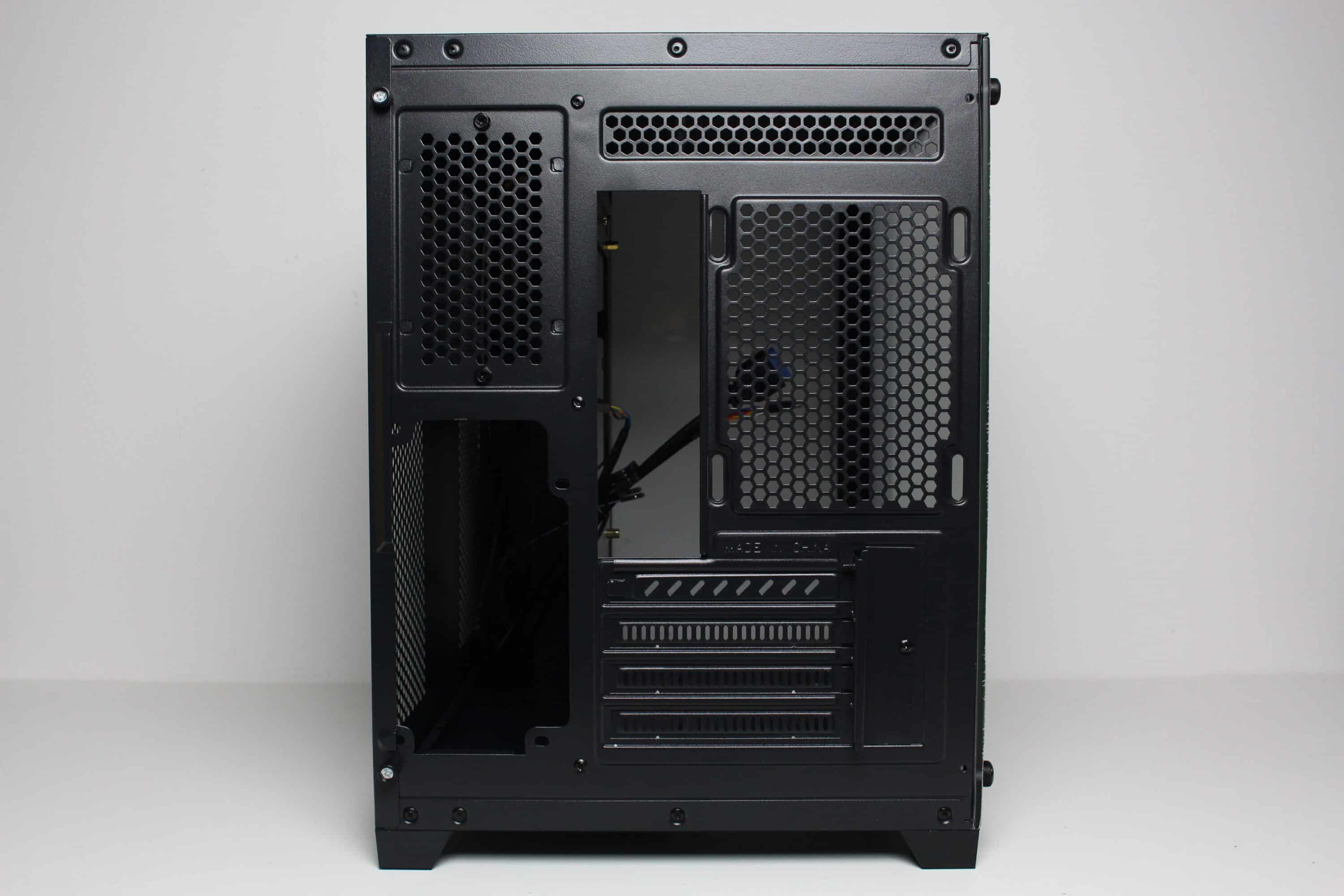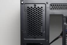 Ein Blick auf die Gehäuserückseite des C-501 Aspect zeigt schnell, dass wir es mit einem Gehäuse zu tun haben, welches über zwei vertikale Kammern im Inneren verfügt. An der rechten Seite werden das Mainboard, ein optionaler 120-mm-Gehäuselüfter sowie die Erweiterungskarten platziert. Die linke Seite bietet eine Montageposition für das vertikal orientierte Netzteil sowie ein Belüftungsgitter für den HDD-Käfig.