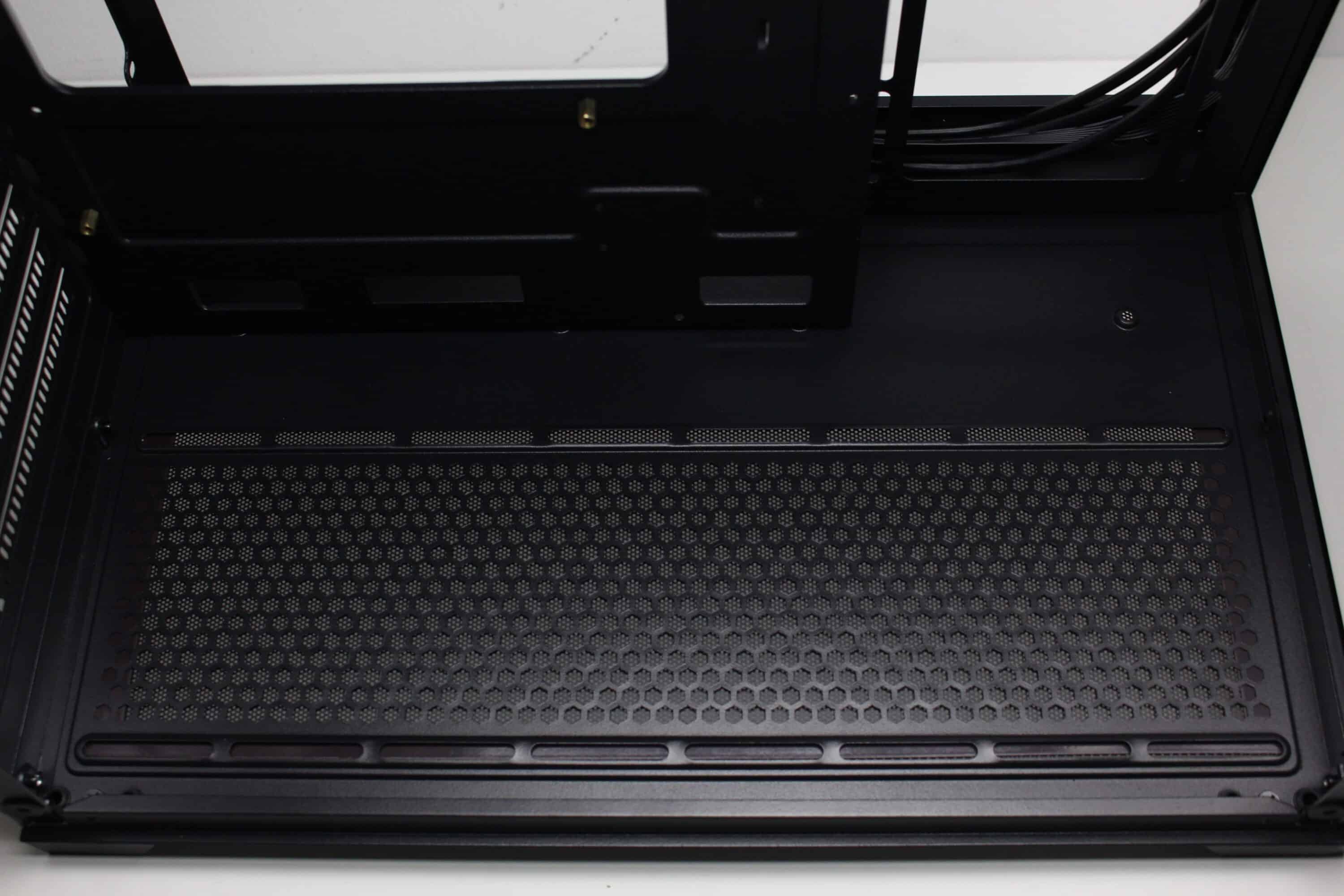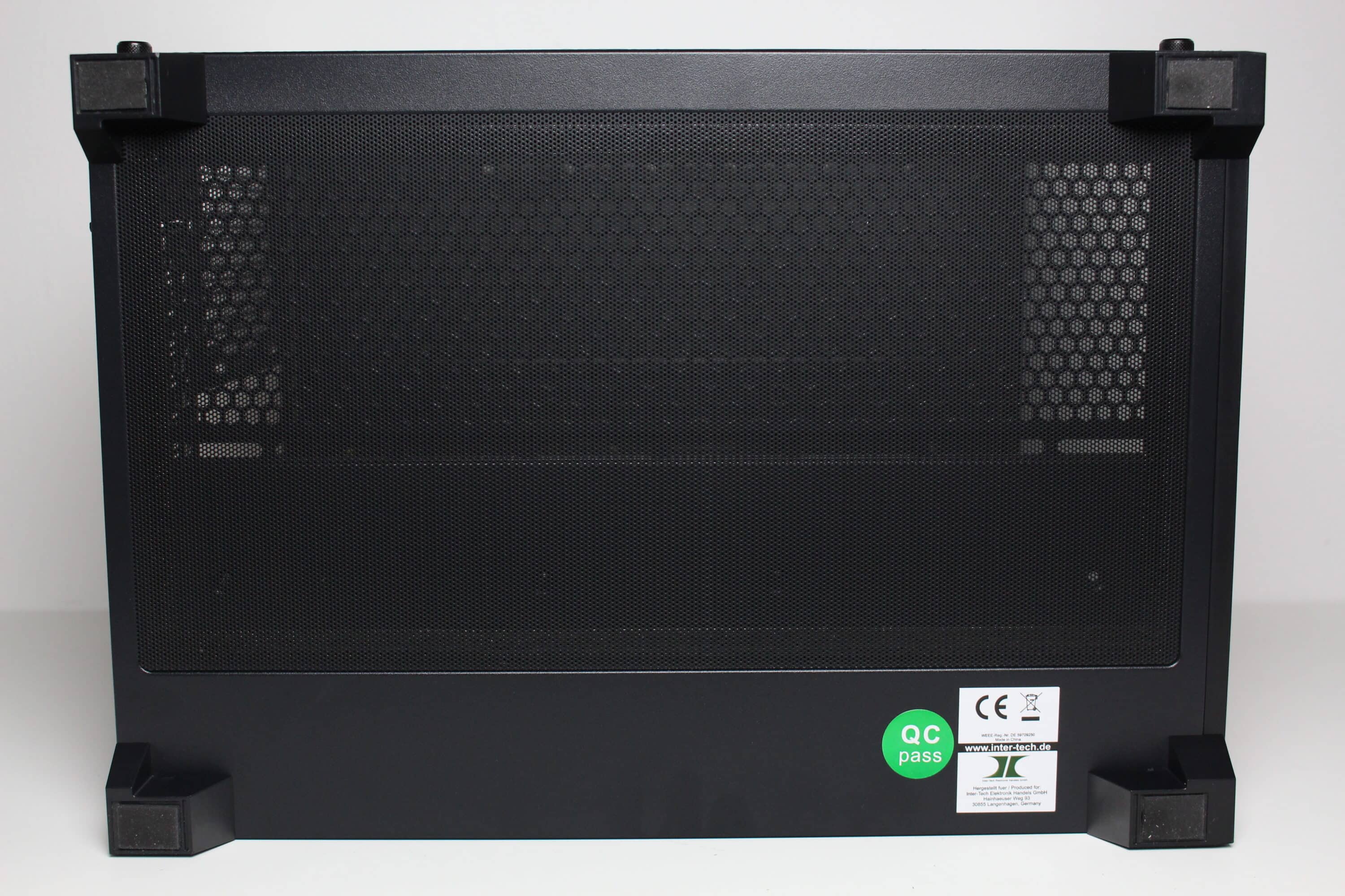 Die Unterseite des Mini-Towers unterscheidet sich optisch und funktional kaum vom Deckel. Einen sicheren Stand ermöglichen vier solide Füße aus schwarzem Kunststoff, die zusätzlich über eine Schicht Gummi verfügen. Analog zum Deckel lässt sich hier zudem ein großes Lüftergitter erkennen, welches Platz für bis zu drei 120-mm-Lüfter bietet. Auch hier implementiert Inter-Tech einen magnetischen Meshfilter zum Schutz vor Staub.