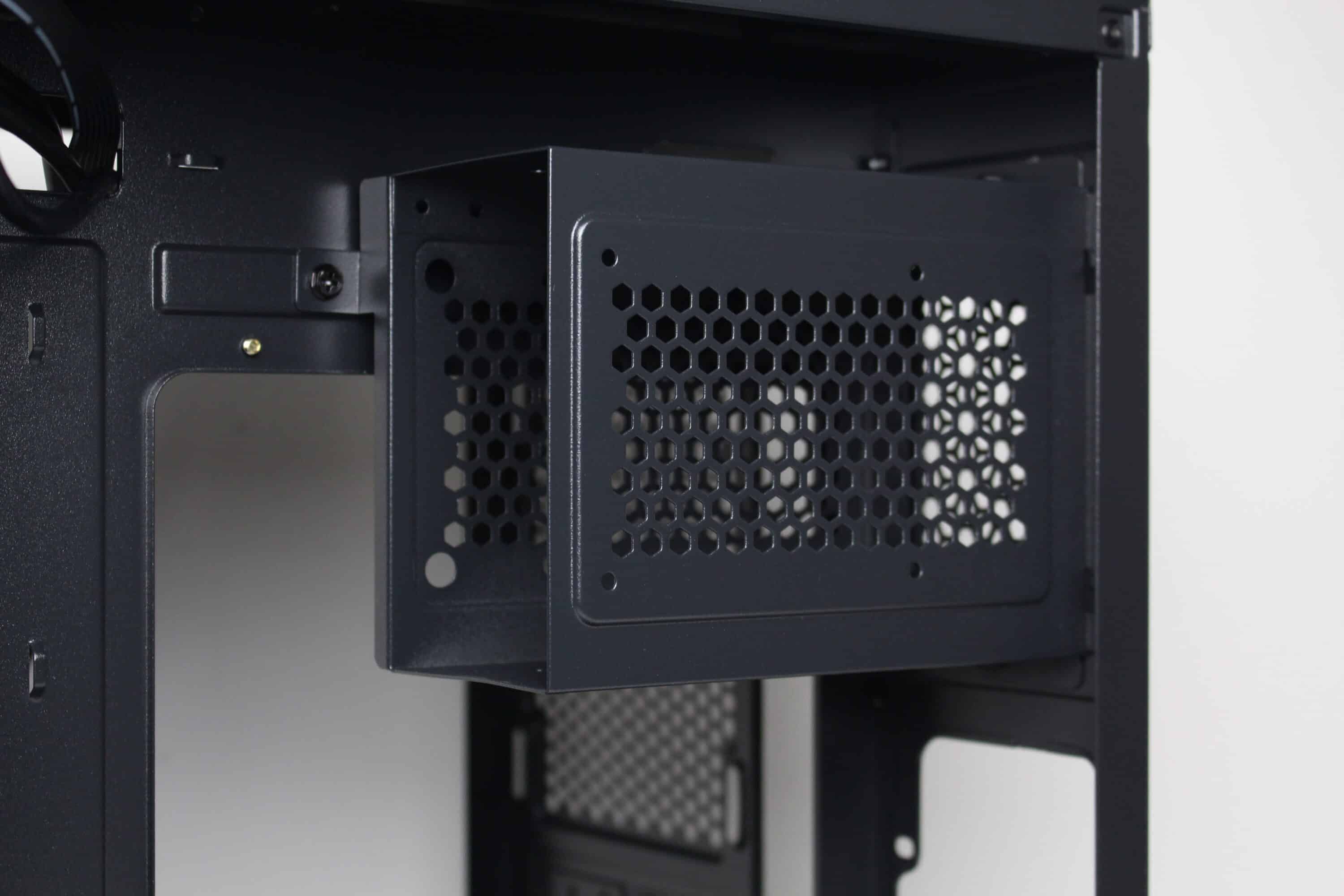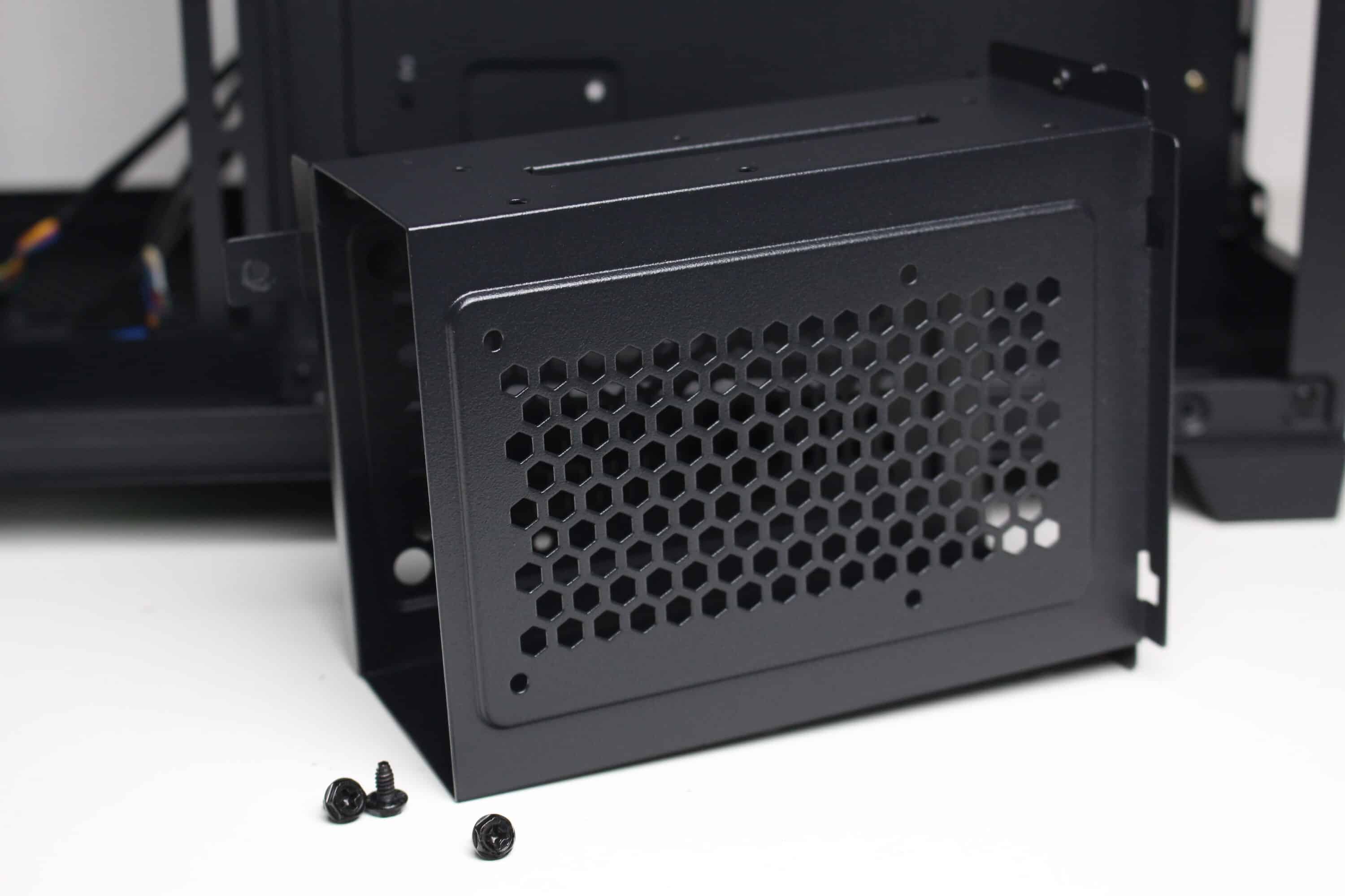 Die Montagemöglichkeiten für Datenträger sind begrenzt. Der modulare HDD-Käfig hinter dem Mainboard-Tray bietet gleichzeitig Platz für zwei 3,5″- und zwei 2,5″-Datenträger. Eine Entkopplung der montierten Festplatten findet nicht statt, da die Befestigung nur mittels Schrauben erfolgt.