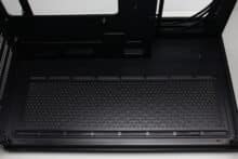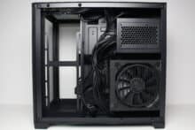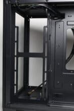 Die zweite Kammer befindet sich hinter dem Mainboard-Tray, bietet Platz für ein ATX-Netzteil und verfügt über einen modularen HDD-Käfig. Des Weiteren gibt es an dieser Stelle durch die bis zu 88 Millimeter breite Kammer viel Stauraum für die Netzteilkabel. Der Platz zwischen den seitlichen Montageschienen und dem Seitenteil betrifft zudem mehr als 27 Millimeter. Im Zusammenspiel mit dem großzügigen Ausschnitt oberhalb der Montageschienen könnte hier also eventuell ein zweiter Radiator befestigt werden.