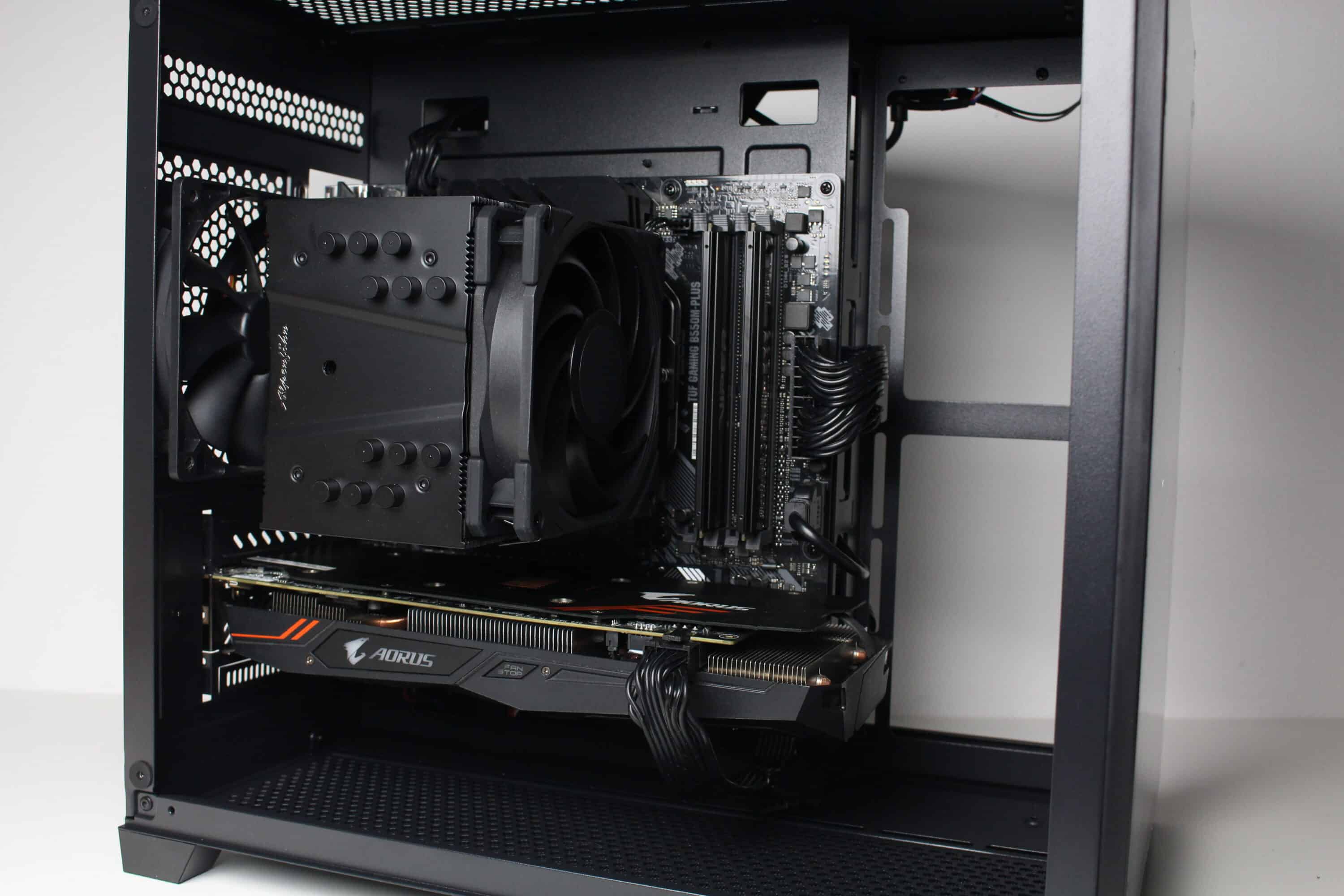 Nun kommen wir zum Systemeinbau beim Inter-Tech C-501 Aspect Test. Als Hardware verwenden wir einen AMD Ryzen 5 1400* auf einem ASUS TUF Gaming B550M-Plus* mit 16GB Crucial Ballistix Sport LT grau DDR4-2666*. Der Ryzen wird von einem Alpenföhn Brocken 4* gekühlt und ist auf 3,8 GHz (1,175 V) übertaktet. Für die Bildausgabe ist eine Gigabyte AORUS GTX 1060 6GB zuständig. Die Stromversorgung erledigt das vollmodulare LC-Power LC550 V2.31 Platinum*.