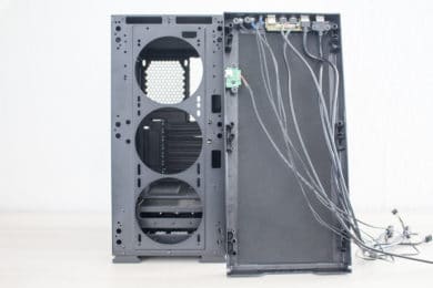 Auf der Rückseite stehen ca. 20 mm Platz zur Verfügung, um zahlreiche Kabel zu verstauen. Im Zusammenspiel mit der Netzteilabdeckung lässt sich ein ordentlich Gesamtergebnis erzielen. Selbst die zusätzlichen Kabelverlängerungen lassen sich gut unter der Abdeckung verstauen und verhindern nicht, dass das Seitenteil am Ende wieder angebracht werden kann. Etwas schwieriger wird es jedoch, wenn die SSD-Plätze am Mainboard-Tray beide belegt sind. Dadurch werden die Kabeldurchführungen nämlich teilweise blockiert.
