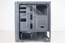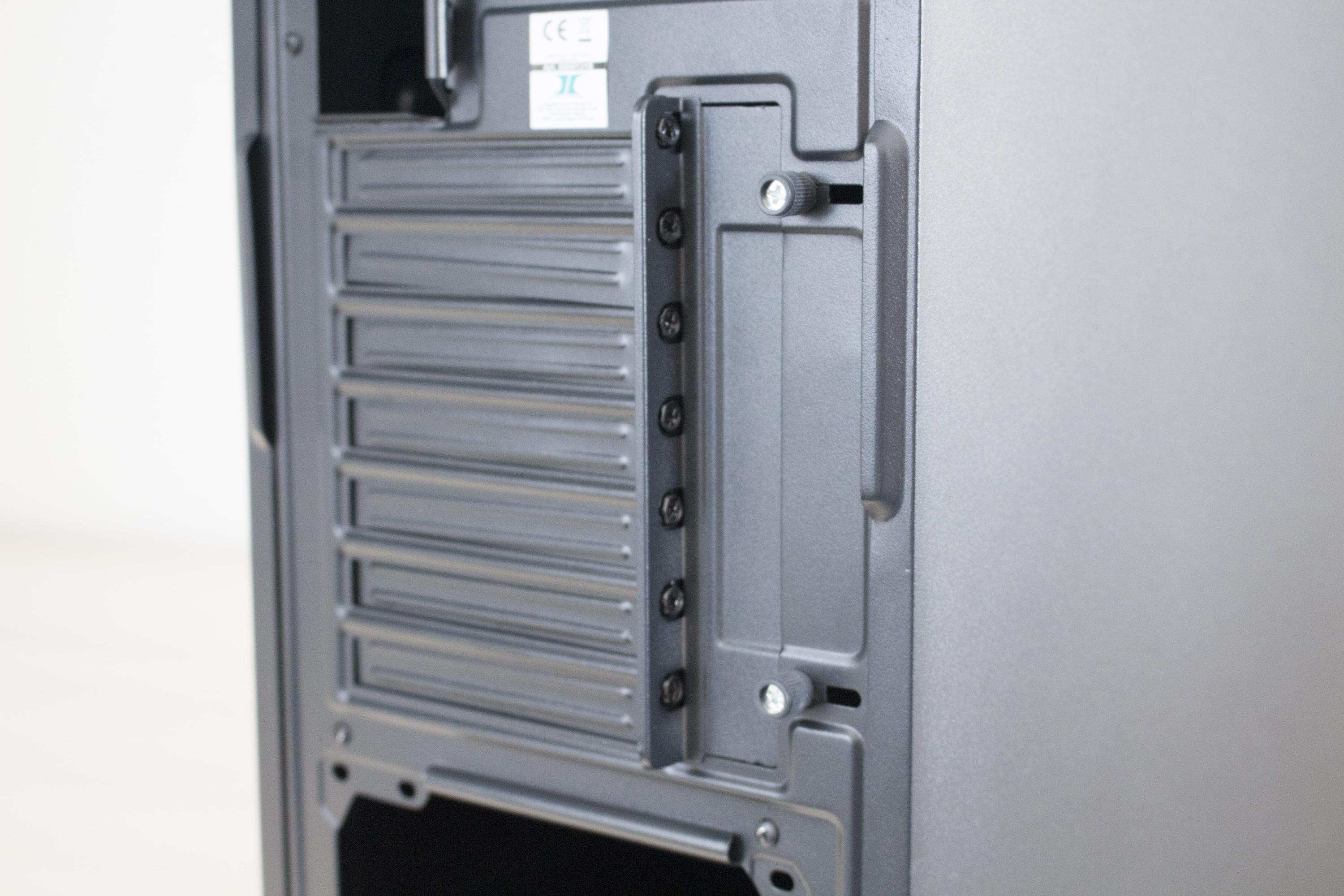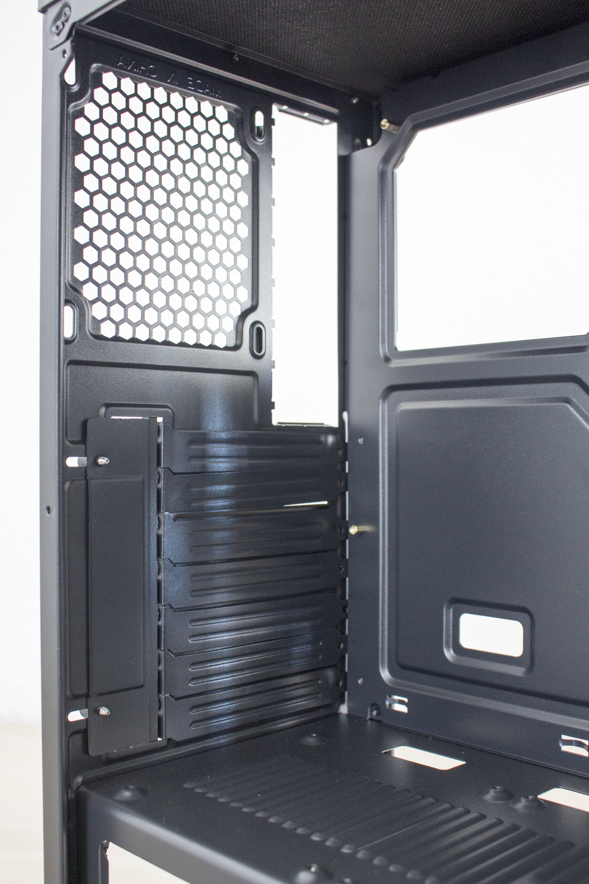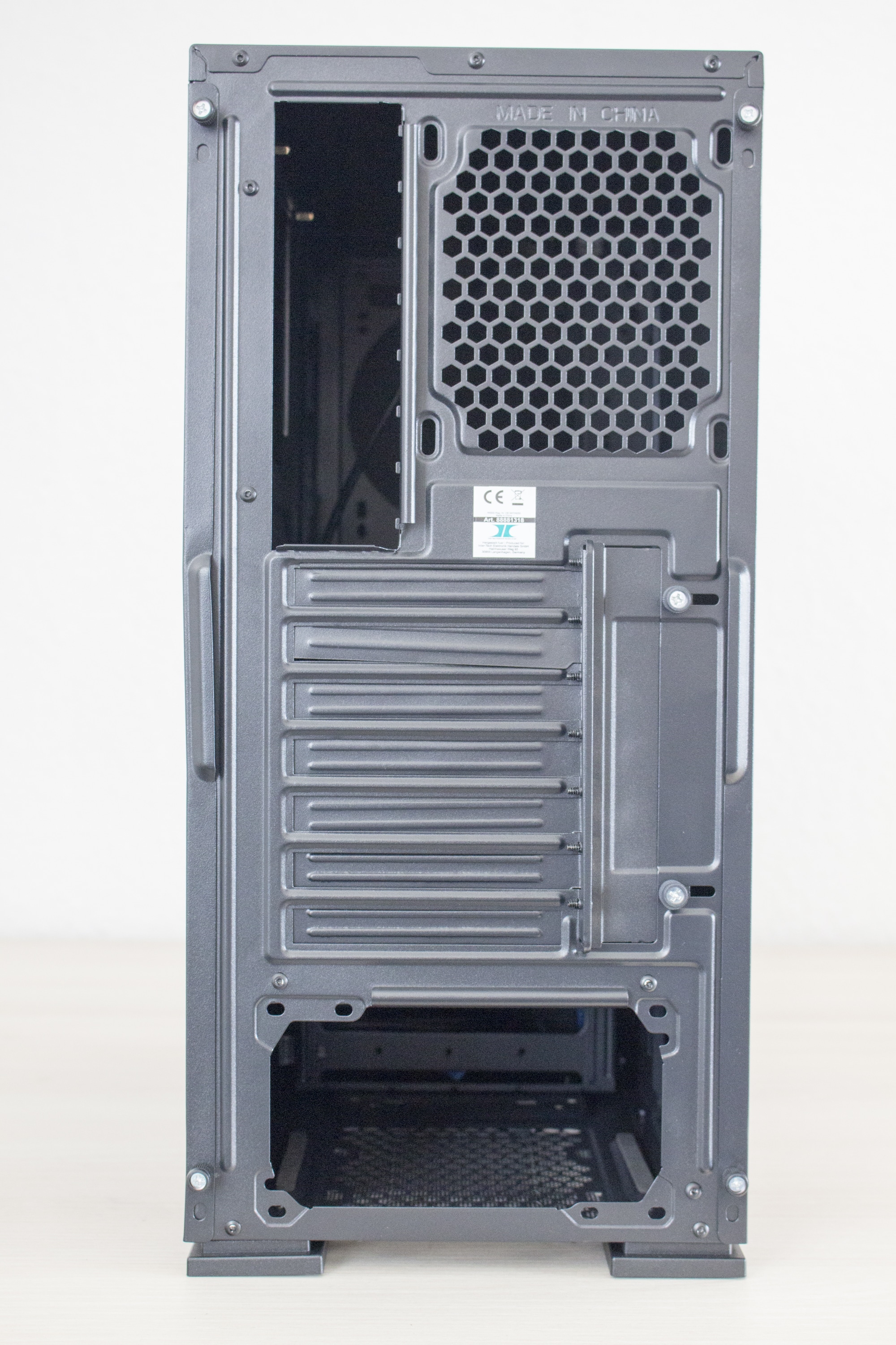 Die Rückseite entspricht dem üblichen Standard von aktuellen Midi-Towern. Das Netzteil wird unten montiert, darüber finden sich sieben Slots für PCI-Erweiterungskarten. Diese werden von außen verschraubt und sind wiederverwendbar. Um die warme Abluft aus dem Gehäuse befördern zu können, lässt sich am Heck ein 120 mm Lüfter anbringen. Diesen muss man allerdings nachkaufen da der Hersteller auf vorinstallierte Lüfter verzichtet.
