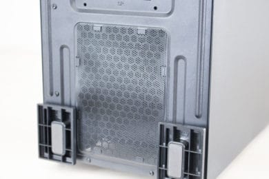 Wenden wir uns nun der Rückseite und der unteren Kammer zu. In dieser werden das Netzteil und zwei weitere Festplatten untergebracht. Dazu hat der Hersteller links neben dem Netzteilbereich einen Festplattenkäfig verbaut. In diesem Käfig können entweder zwei 3,5″-HDDs werkzeuglos oder zwei 2,5″-SSDs mit vier Schrauben befestigt werden. Wird der Platz unterhalb der Abdeckung für ein größeres Netzteil benötigt, kann der Käfig auch komplett ausgebaut werden. Das Netzteil sitzt rechts neben dem HDD-Käfig und liegt auf Stahlelementen, die zur Entkopplung mit Streifen aus Moosgummi beklebt wurden.