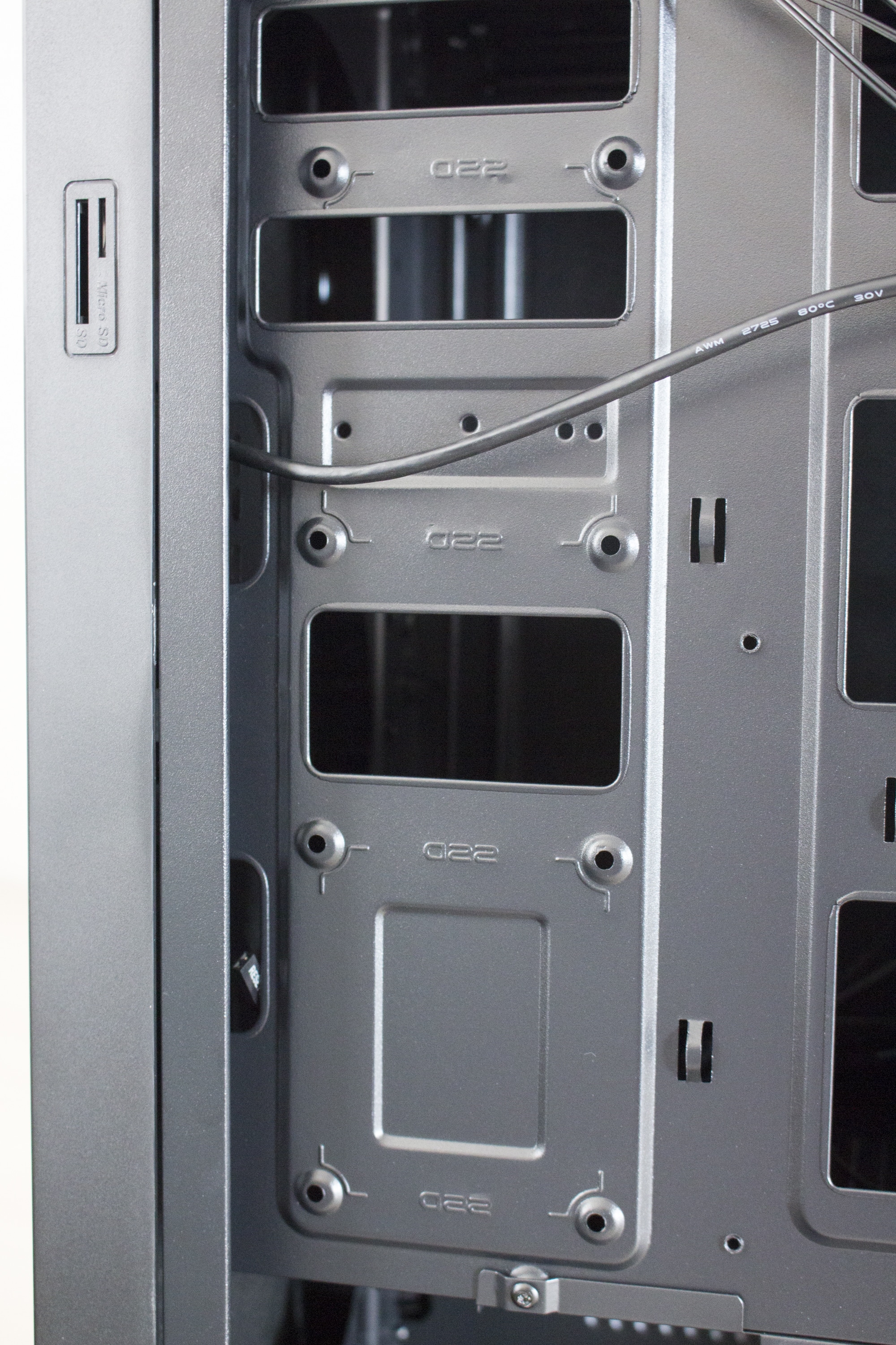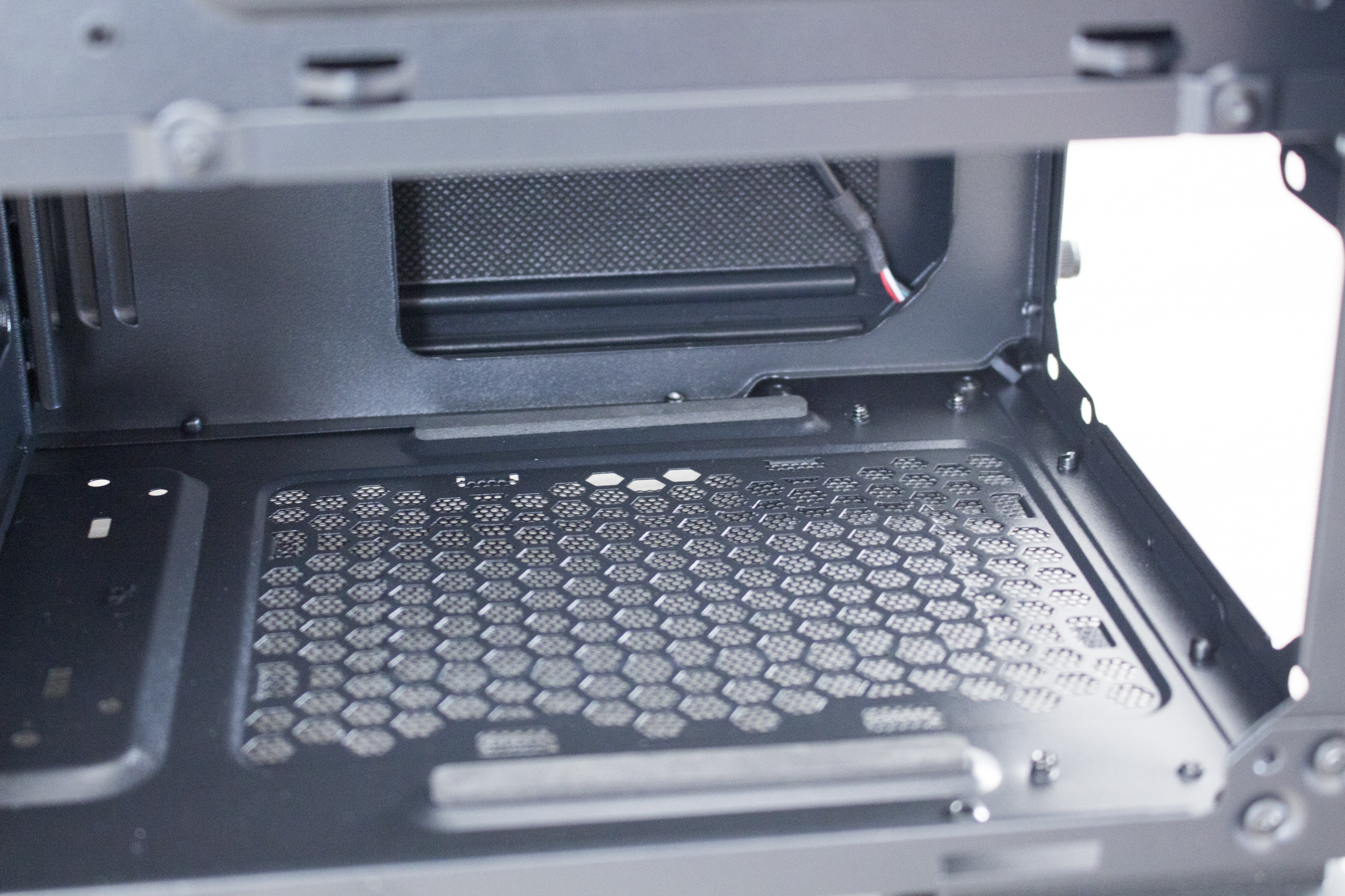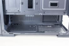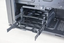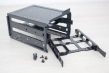 Die Montage von Datenträger erfordert im Falle von 3,5″-Geräten kein Werkzeug und ist denkbar einfach. Hierzu muss man die Festplatten nur in den dafür vorgesehenen Rahmen aus Kunststoff klemmen und wieder in den Käfig schieben. SSD im 2,5″-Format benötigen zur Befestigung hingegen vier herkömmliche Schrauben. Eine Entkopplung der Datenträger findet über die Rahmen oder den Käfig nicht statt. Benötigt man den Käfig nicht oder soll in der Front Platz für einen Radiator geschaffen werden, kann diese über eine Rändelschrauben gelöst und verschoben bzw. komplett entfernt werden. Durch das Verschieben reduziert sich allerdings die maximal möglich Länge des Netzteils.
