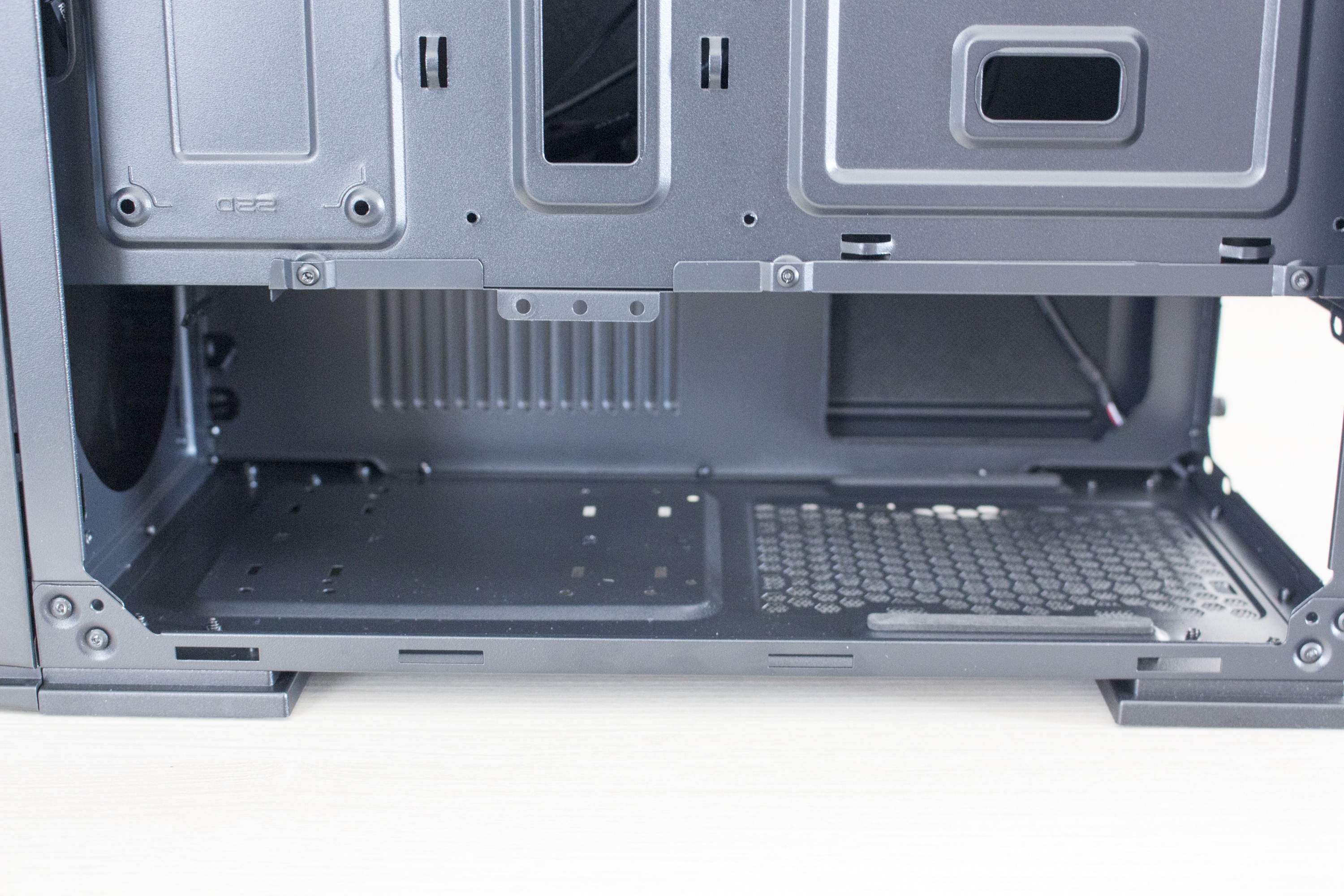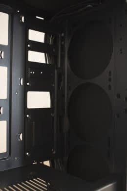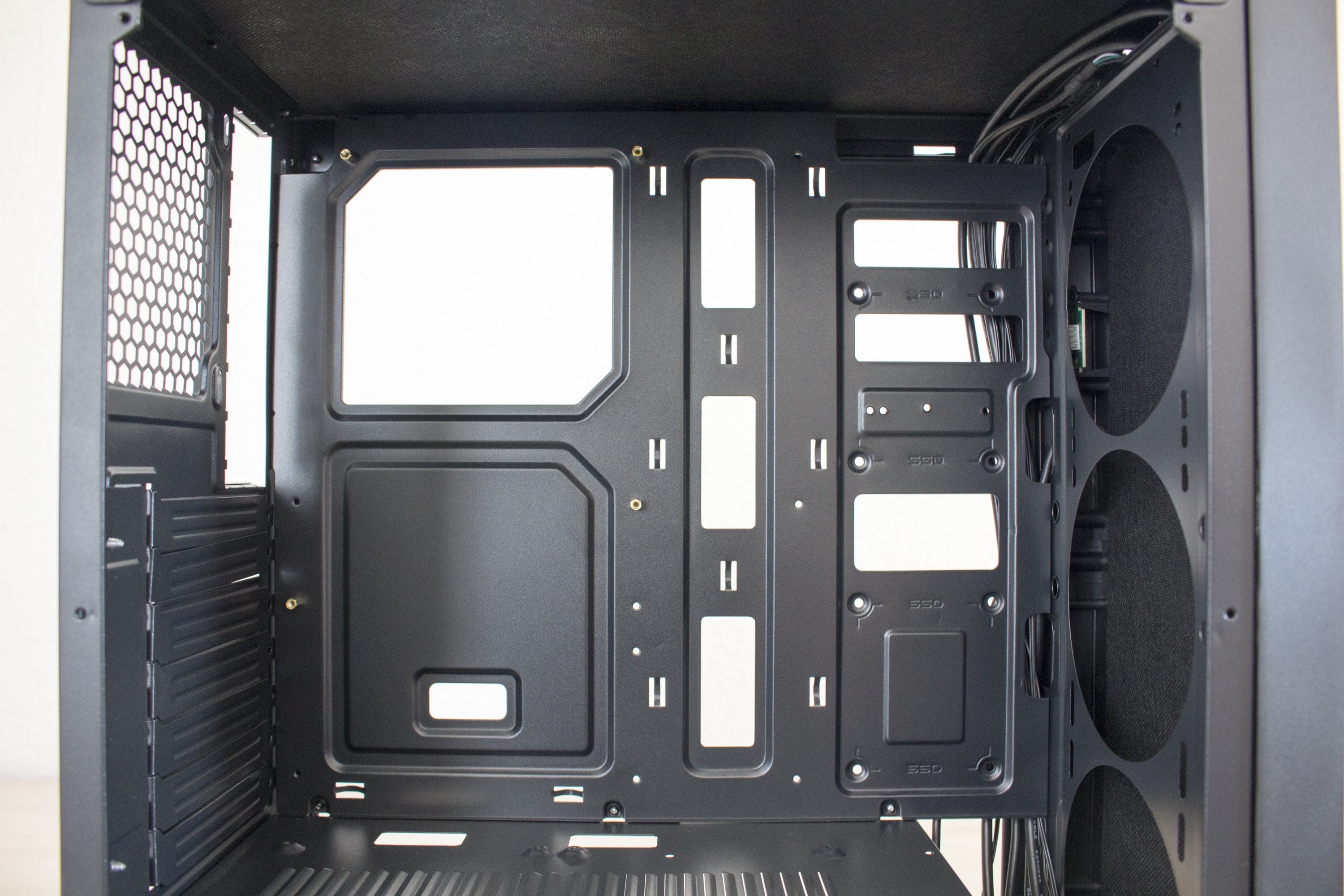 Auch Inter-Tech folgt schon seit längerem dem aktuellen Trend und gestaltet den Innenraum sehr offen und unterteilt diesen durch einen Netzteilabdeckung in zwei Kammern. Der Bereich oberhalb des Netzteiltunnels ist sehr offen gestaltet und verfügt über diverse Öffnungen zur besseren Verlegung von Kabeln. Rechts neben dem Mainboard-Tray gibt es neben den Öffnungen auch noch zwei Montagepunkte für SSDs bzw. 2,5″-Festplatten und Platz für drei 120-mm-Lüfter.