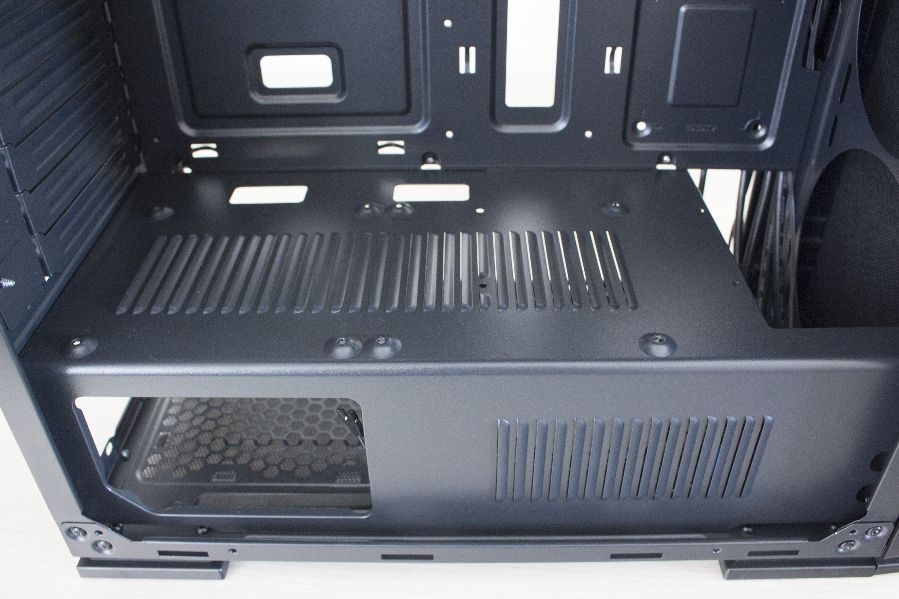 Der Netzteiltunnel verdeckt fast den ganzen unteren Bereich des Midi-Tower. Um aber die Kompatibilität zu AiO-Wasserkühlungen gewährleisten zu können, verfügt die Abdeckung im vorderen Bereich über einen Cut-Out. Zudem können oberhalb der Abdeckung auch zwei weitere 120-mm-Lüfter montiert werden. Den Airflow für diese Lüfter sollen Öffnungen in Kiemenoptik gewährleisten.