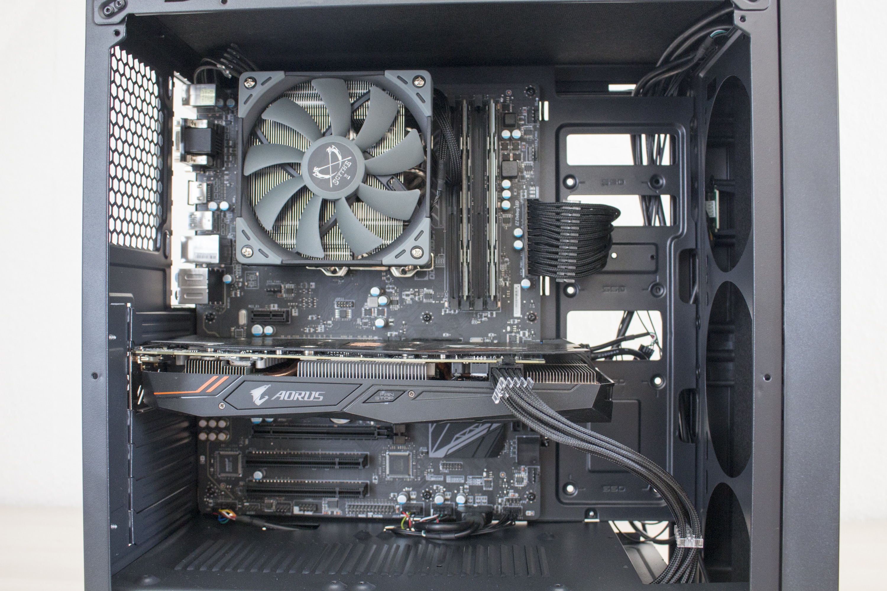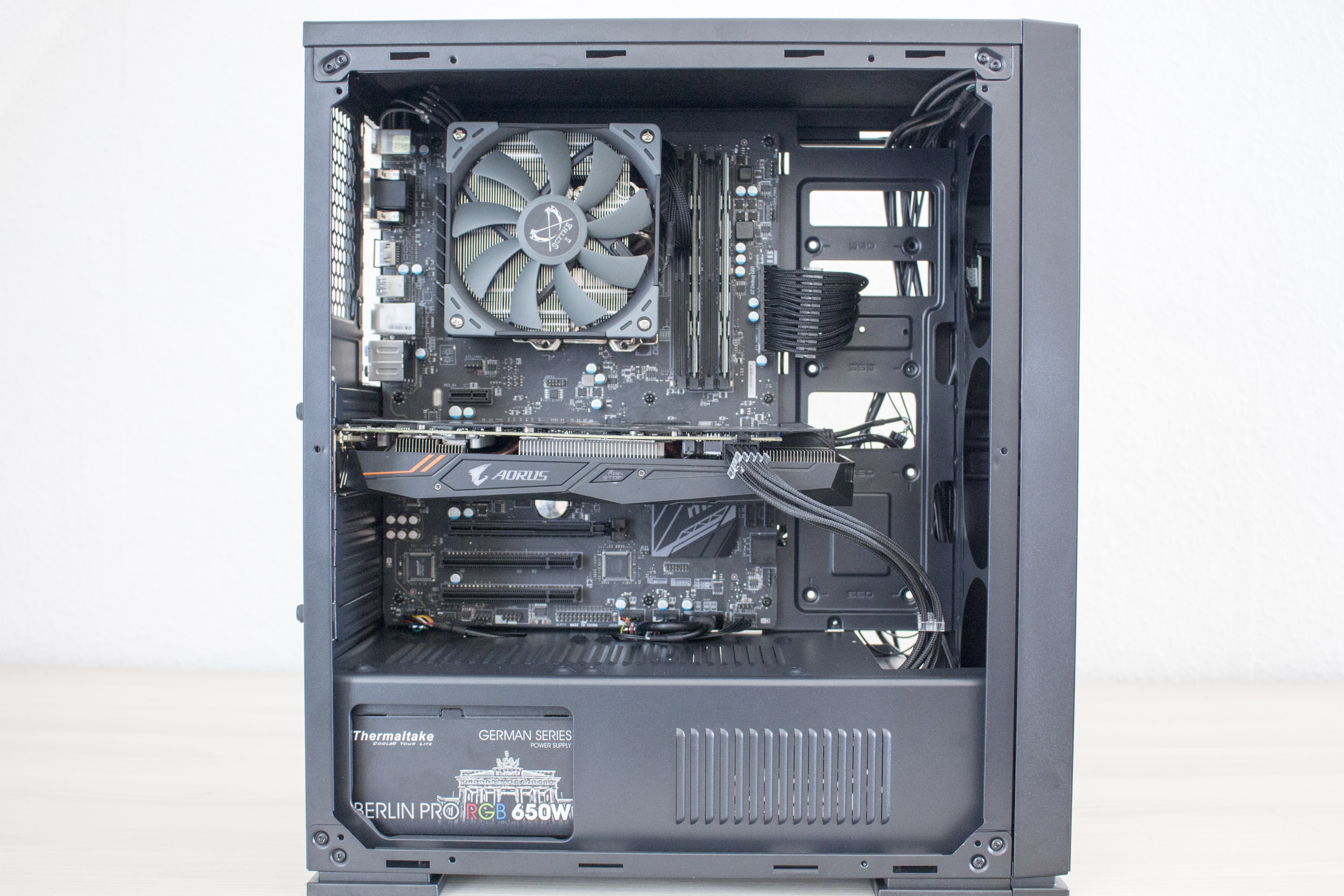 Nun kommen wir zum Systemeinbau. Als Hardware verwenden wir einen AMD Ryzen 5 1400 auf einem MSI B350 PC Mate mit 16GB Crucial Ballistix Sport LT grau DDR4-2666. Die Kühlung des Prozessor übernimmt der Scythe Shuriken 3*. Für die Bildausgabe ist eine GTX 1060 6GB von Gigabte AORUS zuständig. Die Stromversorgung erledigt das nichtmodulare Berlin Pro RGB 650W mit RGB-Lüfter. Um die Verkabelung optisch noch etwas aufzuwerten, wurden zudem einzeln gesleevte Kabelverlängerungen von Phanteks verwendet.