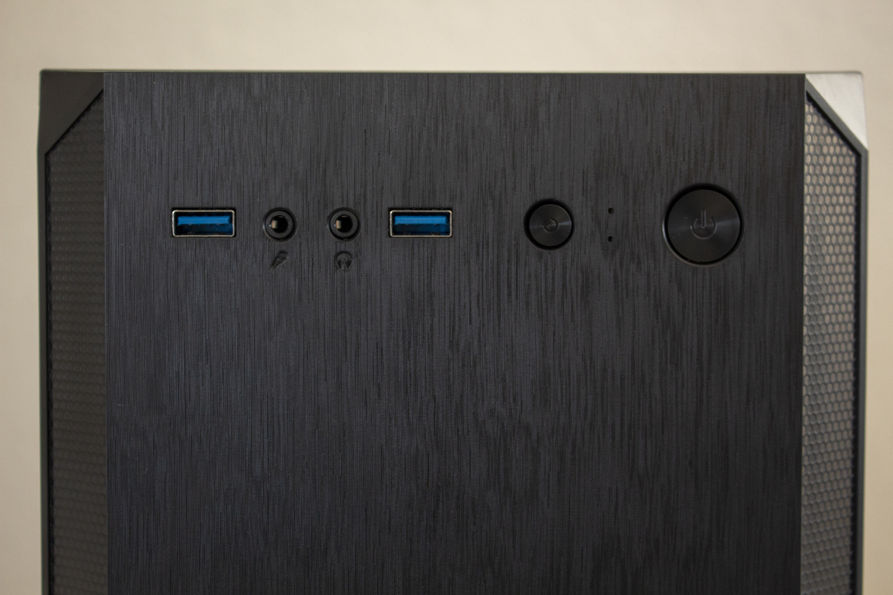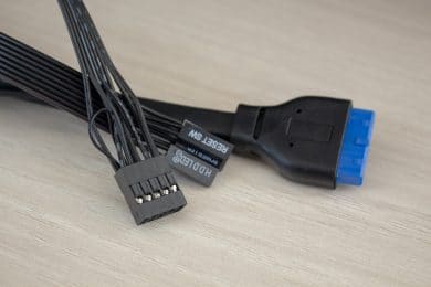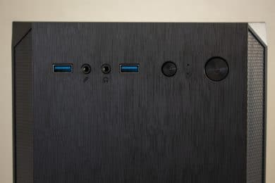 Das I/O-Panel wurde im oberen Teil der Front angebracht. Vorhanden sind hier zwei USB 3.0-Anschlüsse, HD-Audio-Anschlüsse für Kopfhörer und Mikrofon, jeweils ein Taster für Power bzw. Reset und zwei LEDs für Power und die Festplattenaktivität. Da das I/O-Panel direkt am Frontpanel und nicht am Korpus befestigt ist, muss man bei der Demontage etwas Vorsicht walten lassen um keine Kabel abzureißen. Sehr löblich ist hier aber noch, dass alle Kabel komplett schwarz gehalten sind.