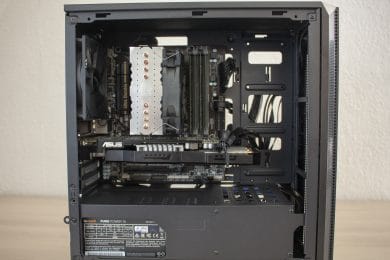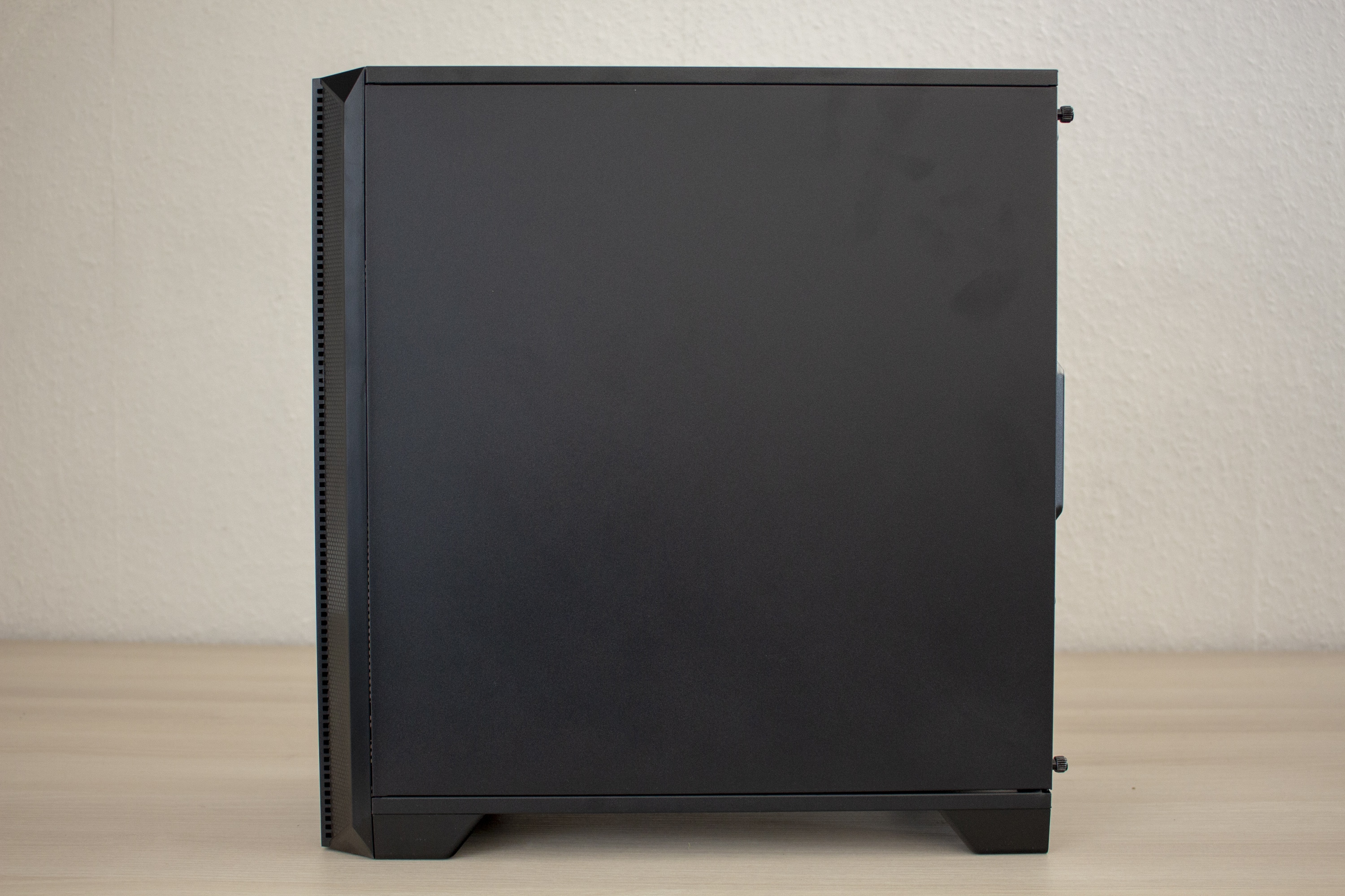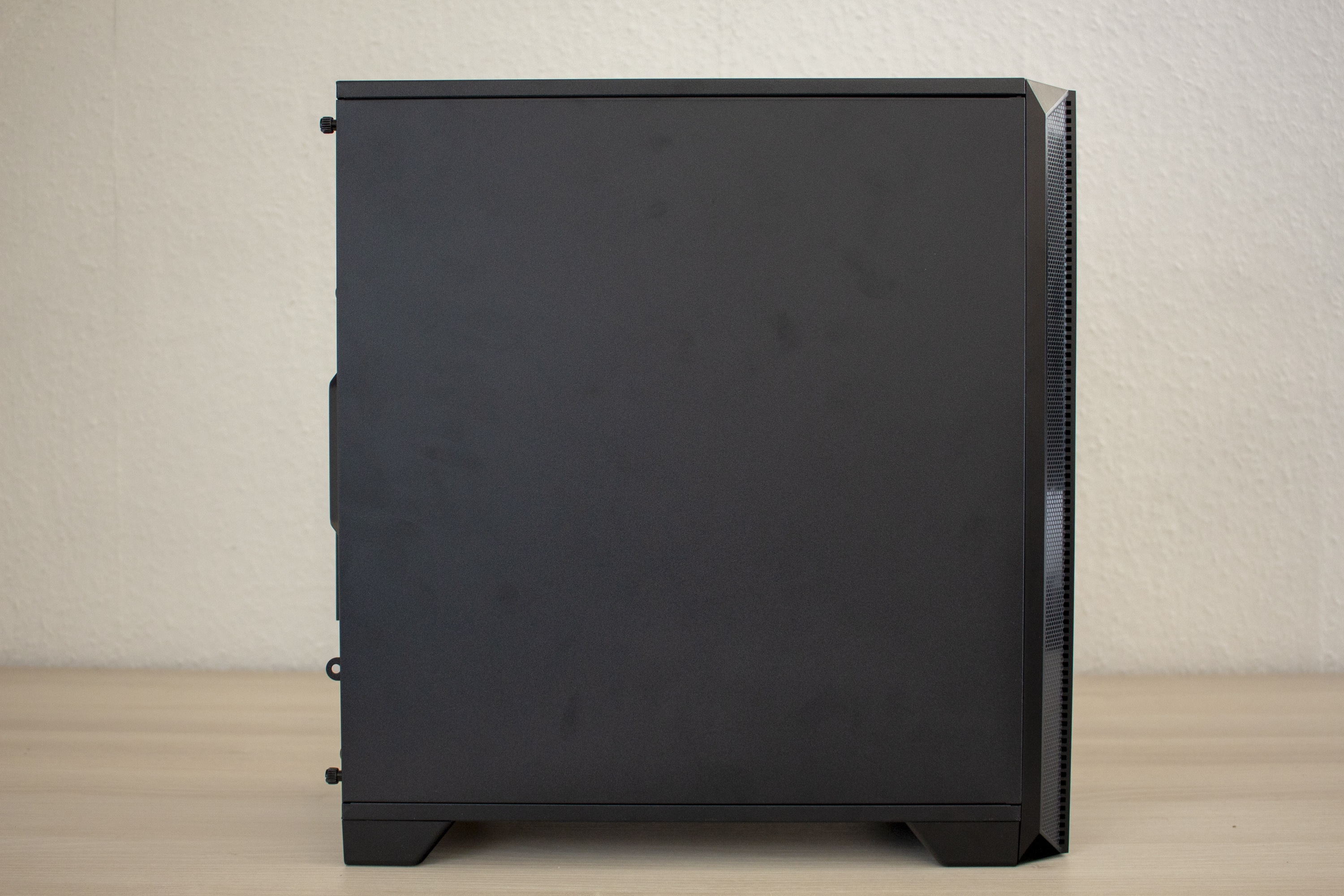 Die beiden Seitenteile folgen dem schlichten und geräuschdämmenden Design. Beide Panels sind ebenfalls komplett geschlossen, wurden mit Dämmmatten ausgekleidet und verfügen über eine Abziehhilfe bzw. Rändelschrauben zur einfachereren Demontage. Das erste Abnehmen der Seitenteile gestaltete sich leider etwas hakelig und war nur mit etwas Kraftaufwand und „Ruckeln“ zu schaffen.