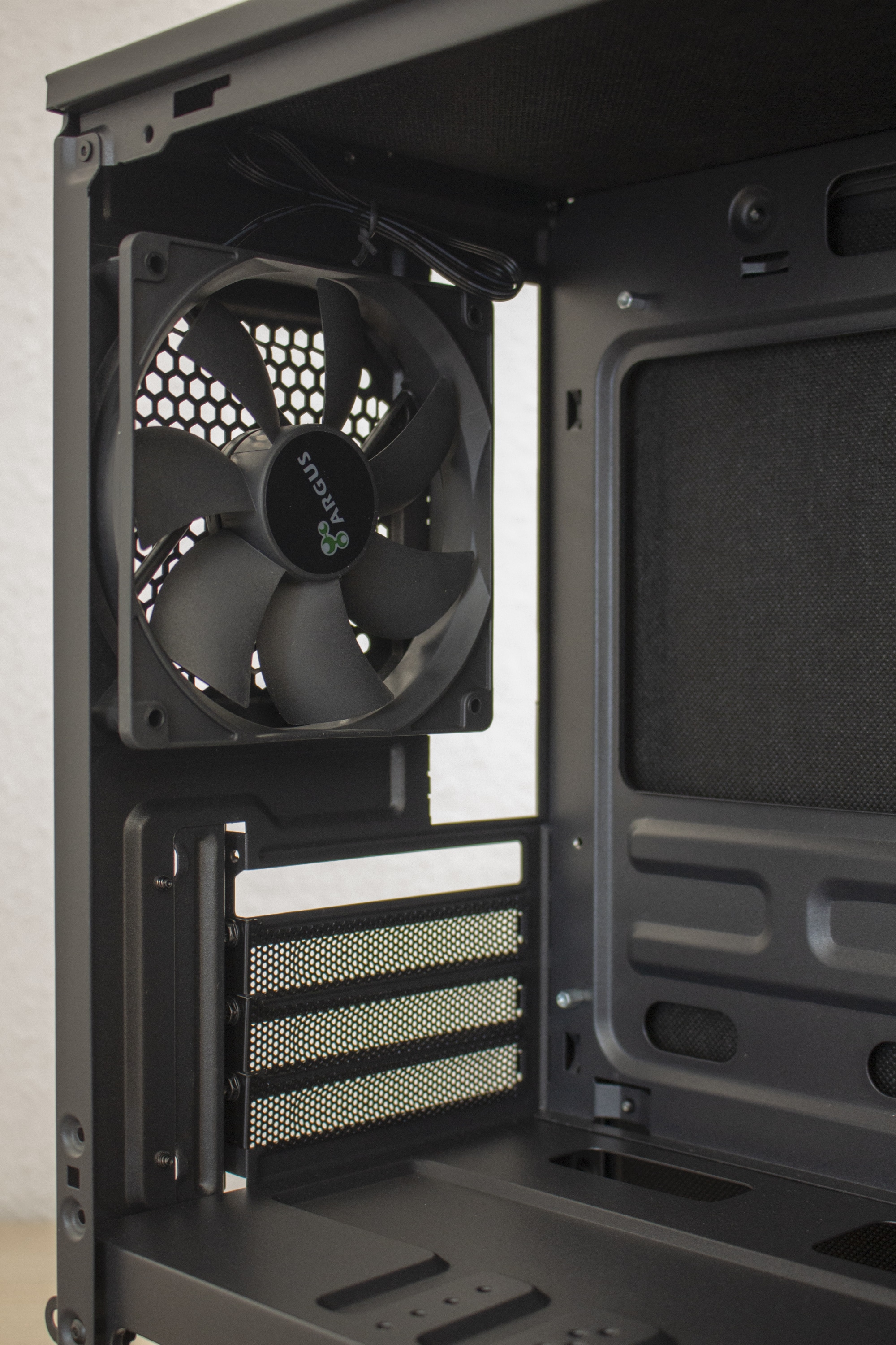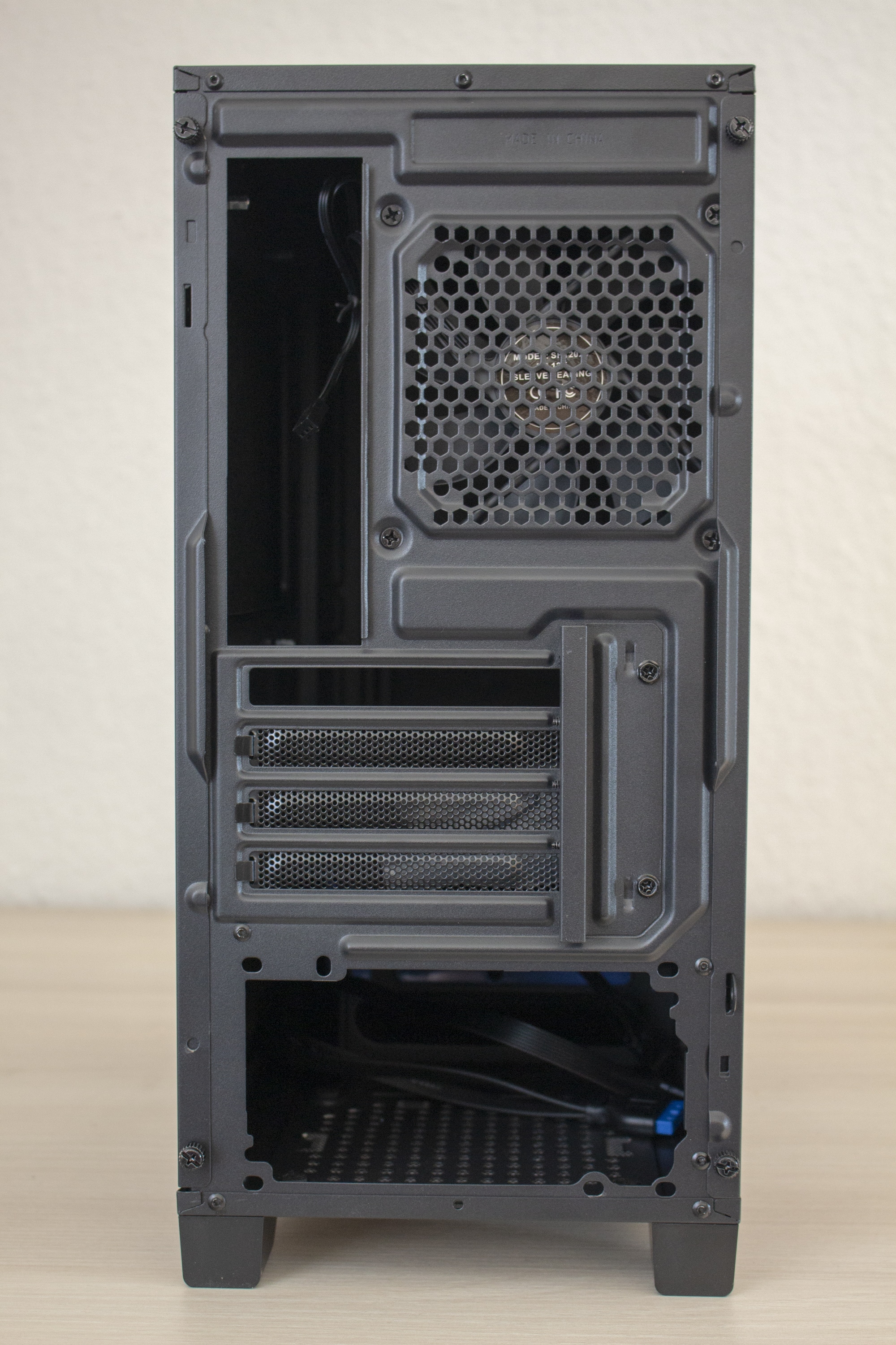 Die Rückseite bietet keine großen Überraschungen. Oberhalb der Montageposition für das Netzteil befinden sich vier wiederverwendbare PCI-Slotblenden und der vorinstallierte Gehäuselüfter mit einer Rahmenbreite von 120 mm. Der Lüfter ist inklusive Kabel komplett schwarz gehalten und wird per 3pin-Anschluss mit Strom versorgt. Die Maximaldrehzahl des Lüfters liegt bei 1200 Umdrehungen pro Minute.