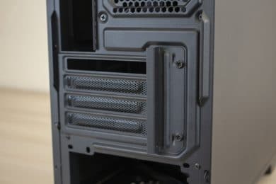 Die Befestigung von Erweiterungskarten erfolgt außerhalb des Gehäuses. Dazu muss man mit einem Schraubendreher zuerst zwei Schrauben lösen um die Abdeckblende zu entfernen. Hier hätten Rändelschrauben die Situation etwas vereinfacht.