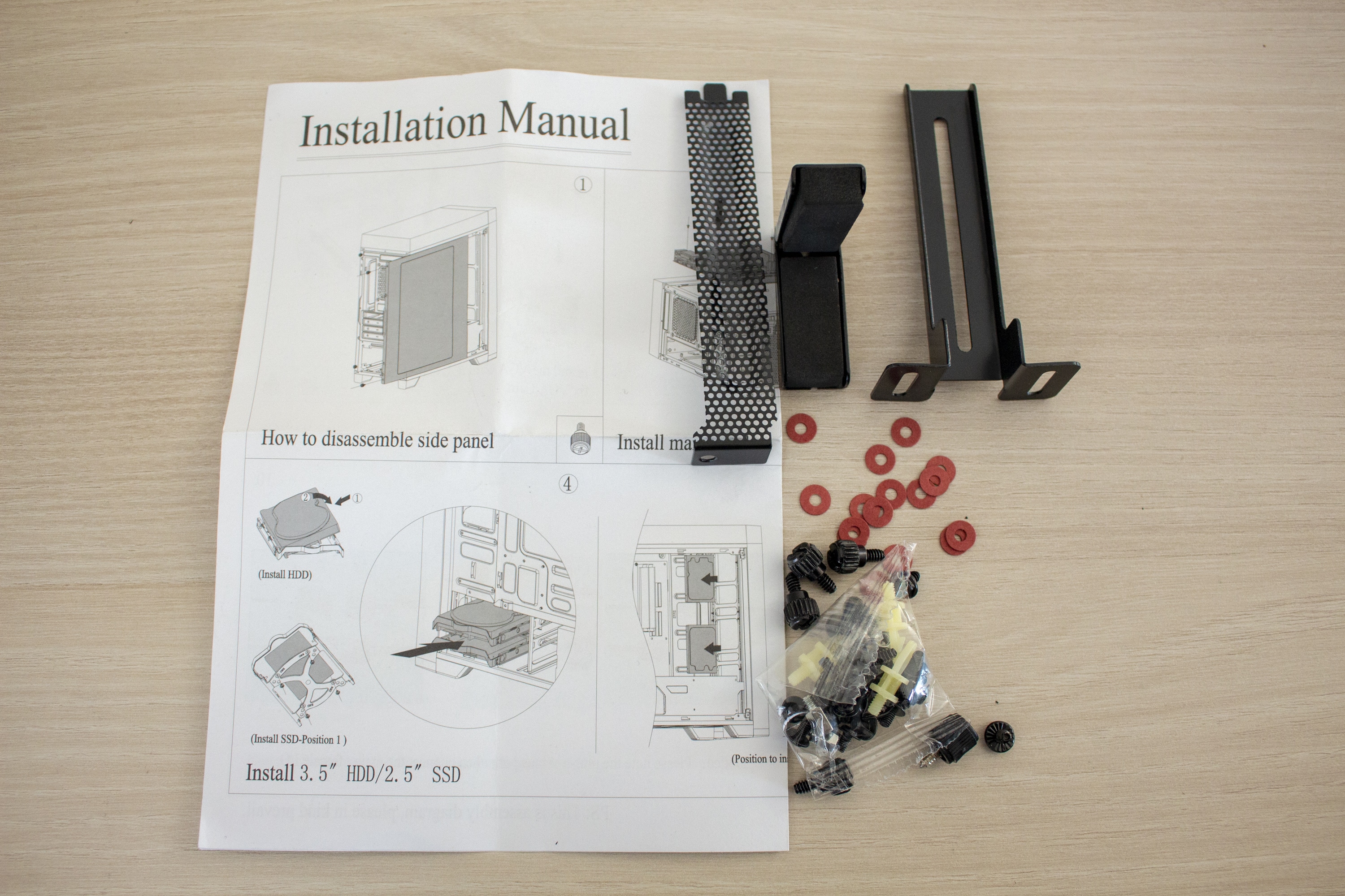 Das Inter-Tech H-606 kommt gut und sicher verpackt in einem braunen Karton mit schwarzer Schrift und ist von harten Styropor-Elementen und einer Kunststofffolie umhüllt. Das mitgelieferte Zubehör wurde in einem durchsichtigen Beutel verstaut und innerhalb des Gehäuses befestigt. Dieser Beutel beinhaltet alle wichtigen Schrauben, zwei schwarze Klett-Kabelbinder, eine PCI-Slotblende, eine Installationsanleitung und einen praktischen Grafikkartenhalter.