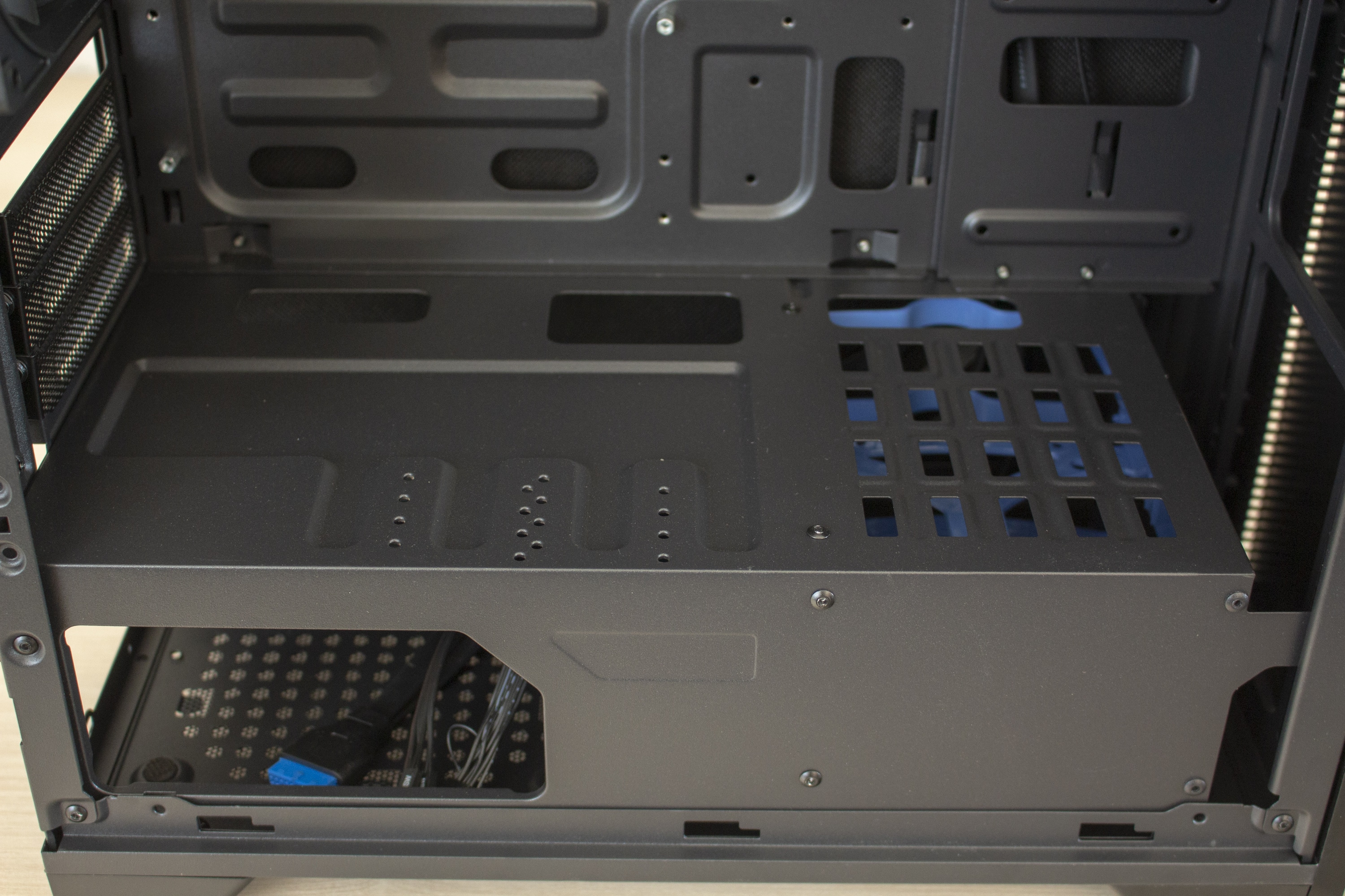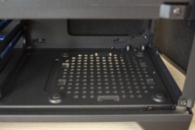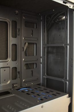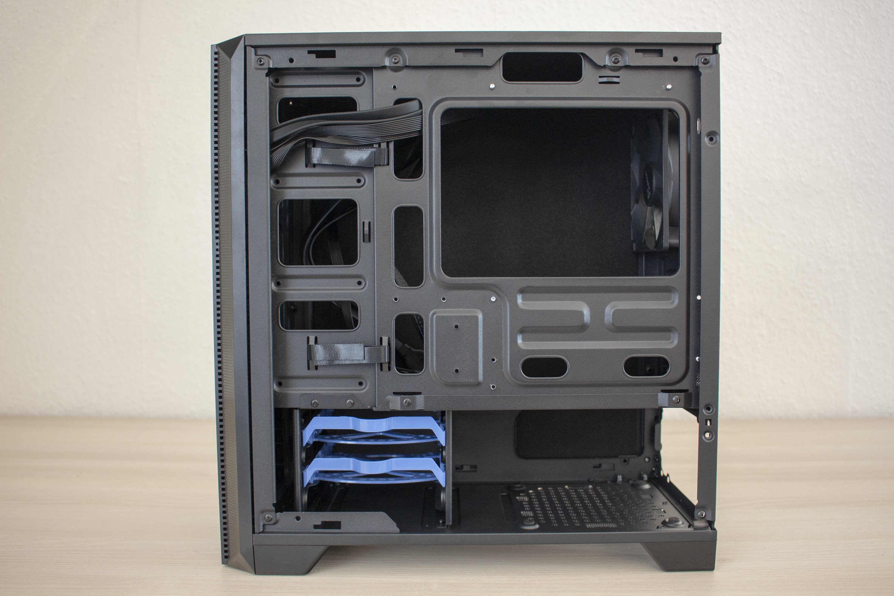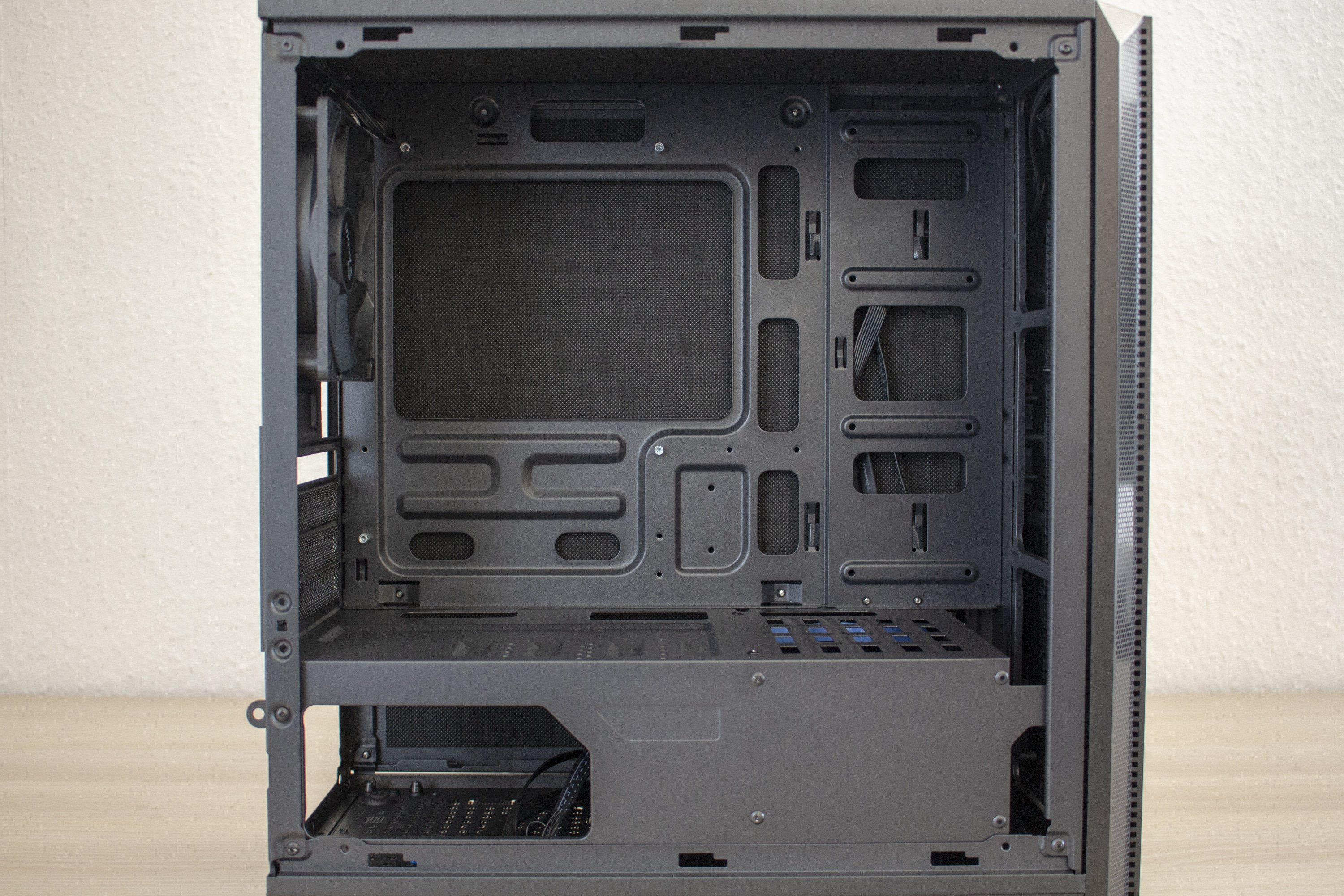 Entfernt man die Seitenteile, wird der Blick auf einen derzeit typisch gestalteten Innenraum frei. Dieser ist durch eine Abdeckung in zwei Bereiche unterteilt. In der oberen Kammer lassen sich das Mainboard und Erweiterungskarten unterbringen. Außerdem verfügt das Mainboard-Tray über einen Ausschnitt für eine CPU-Kühler-Backplate und diverse Öffnungen zur Verlegung der Netzteil-Kabel. Rechts neben dem Mainboard können zwei HDDs oder SSDs im 2,5″-Format montiert werden. Da diese flach auf dem Mainboard-Tray liegen, können die optionalen Frontlüfter ungehindert kalte Luft in den Innenraum befördern. Insgesamt können in der Front bis zu drei Lüfter mit einer Rahmenbreite von 120 mm montiert werden.