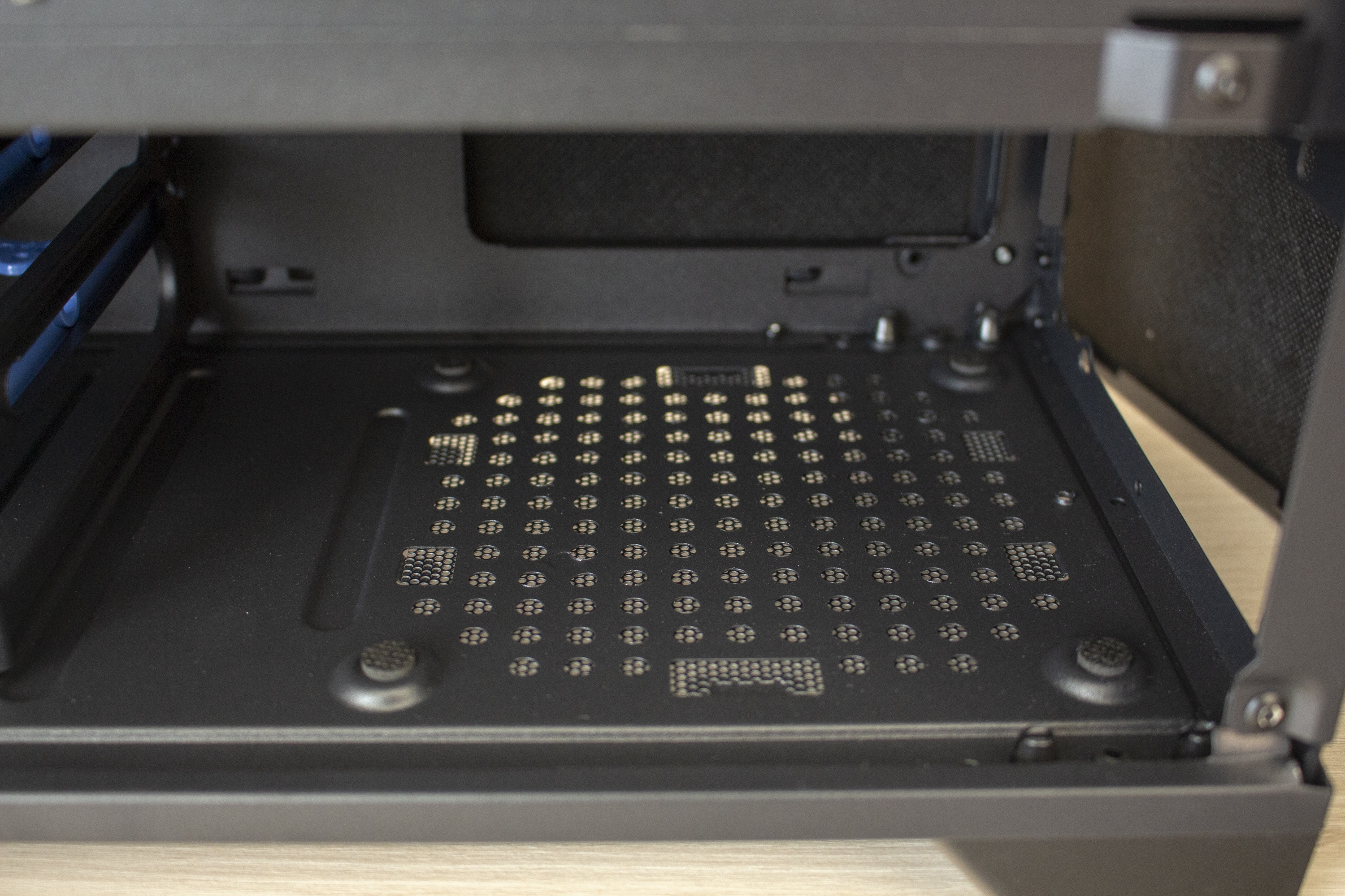 Der Mini-Tower steht auf vier soliden Kunststofffüßen. Auf eine weitere Entkopplung mit Hilfe von dünnen Gummistreifen hat der Hersteller jedoch komplett verzichtet. An der Unterseite befindet sich außerdem der Staubfilter für das Netzteil. Wie in dem Preisbereich üblich, besteht dieser aus Mesh und wird von mehreren Stahllaschen festgehalten.