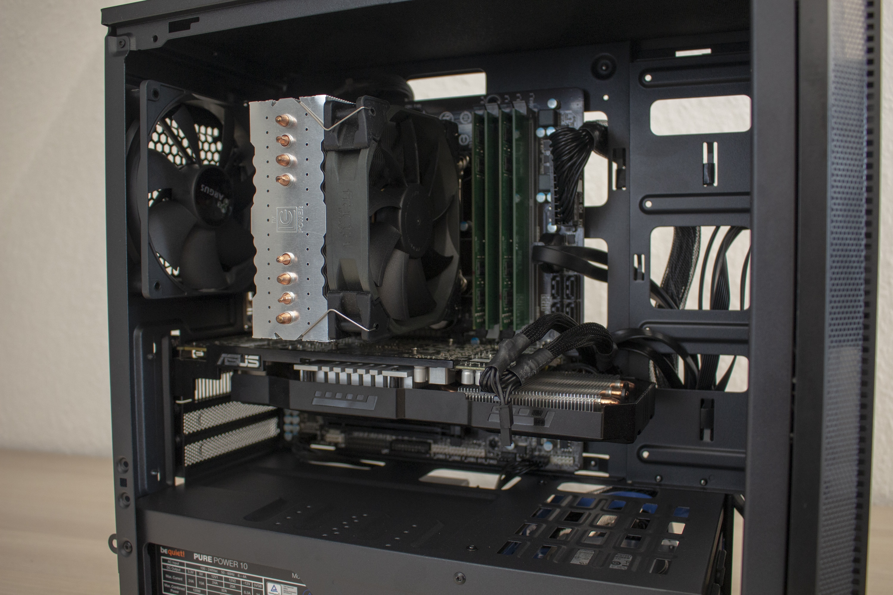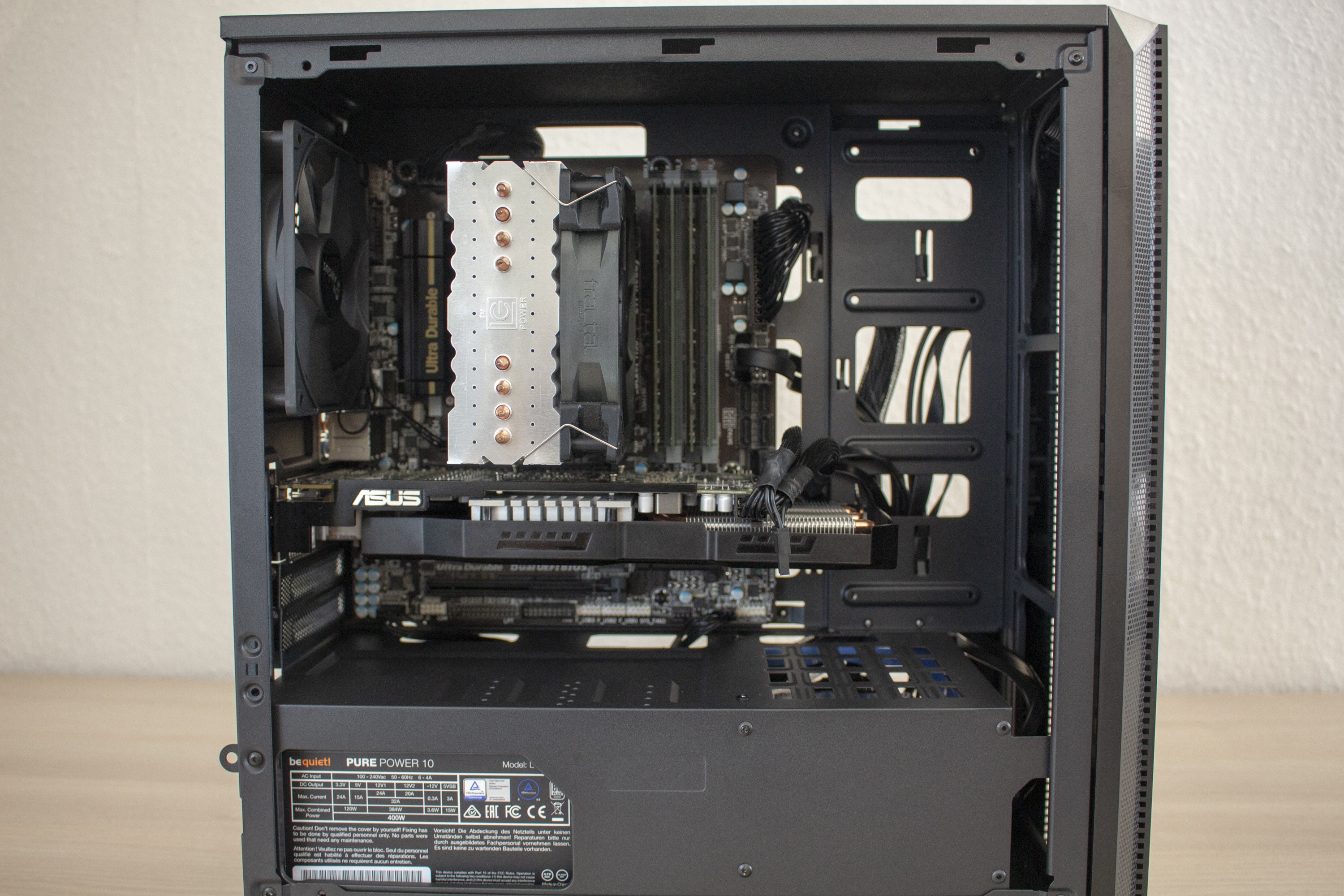 Nun kommen wir zum Systemeinbau. Als Hardware verwende ich einen Intel Xeon 1230v3 auf einem Gigabyte H87M-D3H mit 16GB RAM. Der Xeon wird durch einen LC-Power Cosmo Cool LC-CC-120 gekühlt. Für die Bildausgabe ist eine HD 7850 2GB von Asus zuständig. Die Stromversorgung erledigt das nichtmodulare be quiet! Pure Power mit 400W. Um die Verkabelung optisch noch etwas aufzuwerten, wollte ich zudem einzeln gesleevte Kabelverlängerungen von Phanteks verwenden. Warum das aber leider nicht möglich war, sehen wir sofort.