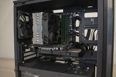 Der Einbau der Hardware war trotz der engen Platzverhältnisse recht schnell erledigt. Jedoch muss man bei der Auswahl von Hardware etwas Bedacht walten lassen. Wo die maximale Länge von 320 mm für Pixelbeschleuniger eigentlich keine Wünsche offen lässt und nahezu jede Grafikkarte im H-606 Platz finden dürfte, so ist der Käufer mit maximal 150 mm für CPU-Kühler schon recht stark beschränkt. Besonders die stärkeren Tower-Kühler sind meistens mindestens 155 mm hoch. Der 152 mm hohe LC-Power Cosmo Cool LC-CC-120 hat trotzdem problemlos gepasst und hatte sogar noch ein paar Millimeter Luft zur Seitenwand. Je nach Sockel könnten also auch etwas größere Kühler in das H-606 passen.