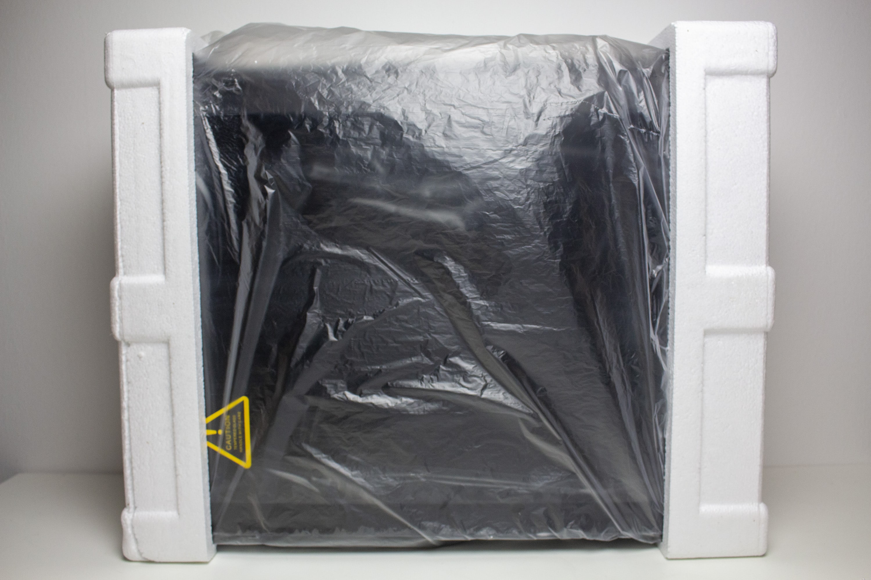 Das erste Einsparpotenzial hat Inter-Tech direkt bei der Verpackung des IT-3503 AIRSTREAM gefunden. Der Karton ist schlicht braun gehalten und wurde mit einer schematischen Zeichnung des Gehäuses bedruckt. Technische Daten oder die Auflistung von Features (mit Ausnahme der zwei vorinstallierten 200-mm-Lüfter) findet man nicht auf dem Karton. Innerhalb des Verpackung wird das IT-3503 von dünnem Styropor und einer Folie aus Kunststoff umhüllt. Eines dieser Styroporelemente war beim Auspacken bereits defekt und hätte keinen weiteren Sturz abfangen können.