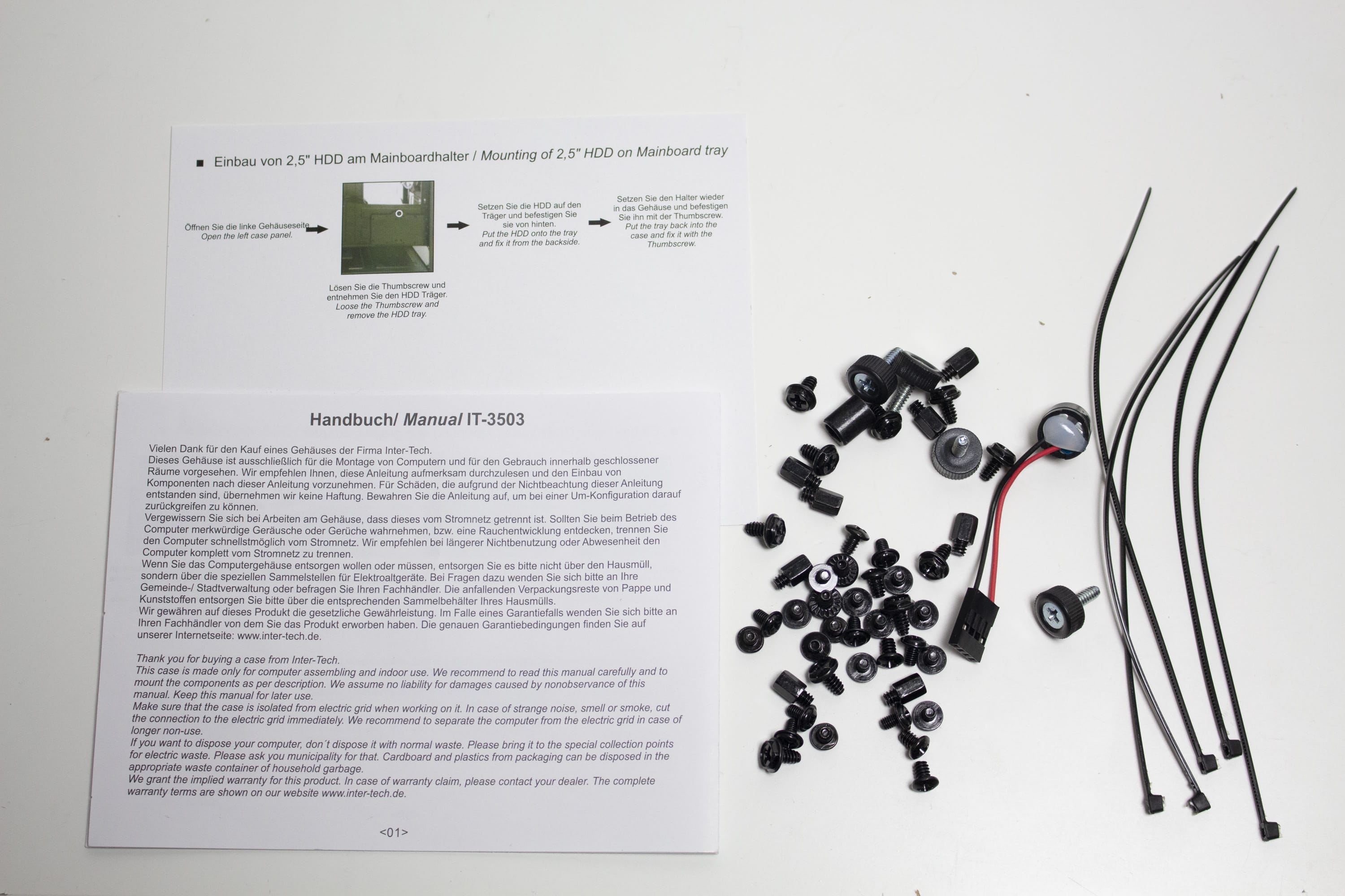Das mitgelieferte Zubehör befindet sich in einem Beutel aus Kunststoff, der im Innenraum mit einem Kabelbinder befestigt. Vorhanden sind alle benötigten Schrauben zum Einbau der Komponenten, einige Kabelbinder sowie ein Mainboard-Speaker. Weiterhin liegen dem Zubehör eine Montageanleitung, zwei vorinstallierte Staubfilter für Netzteil bzw. Deckel und zwei vorinstallierte Lüfter mit einer Rahmenbreite von 200 Millimetern bei.