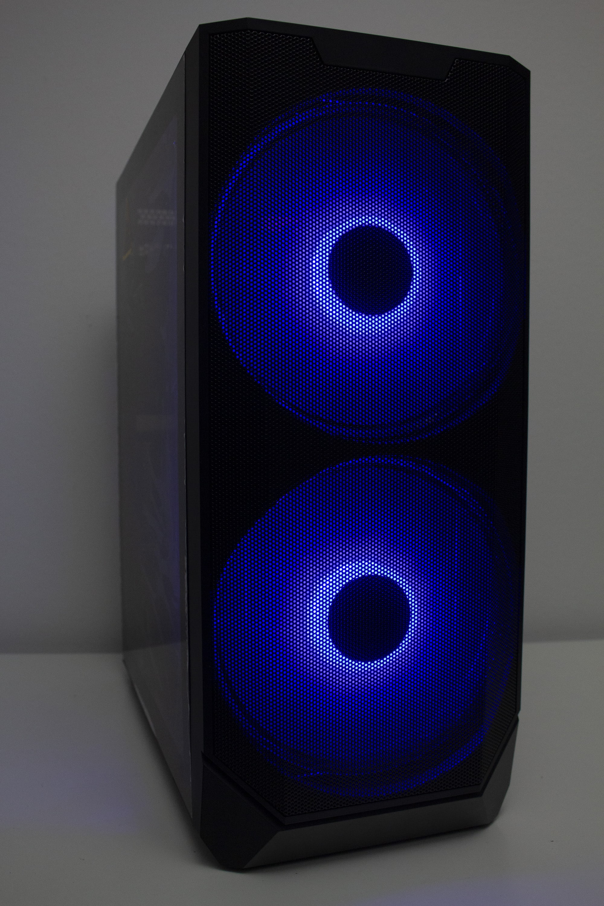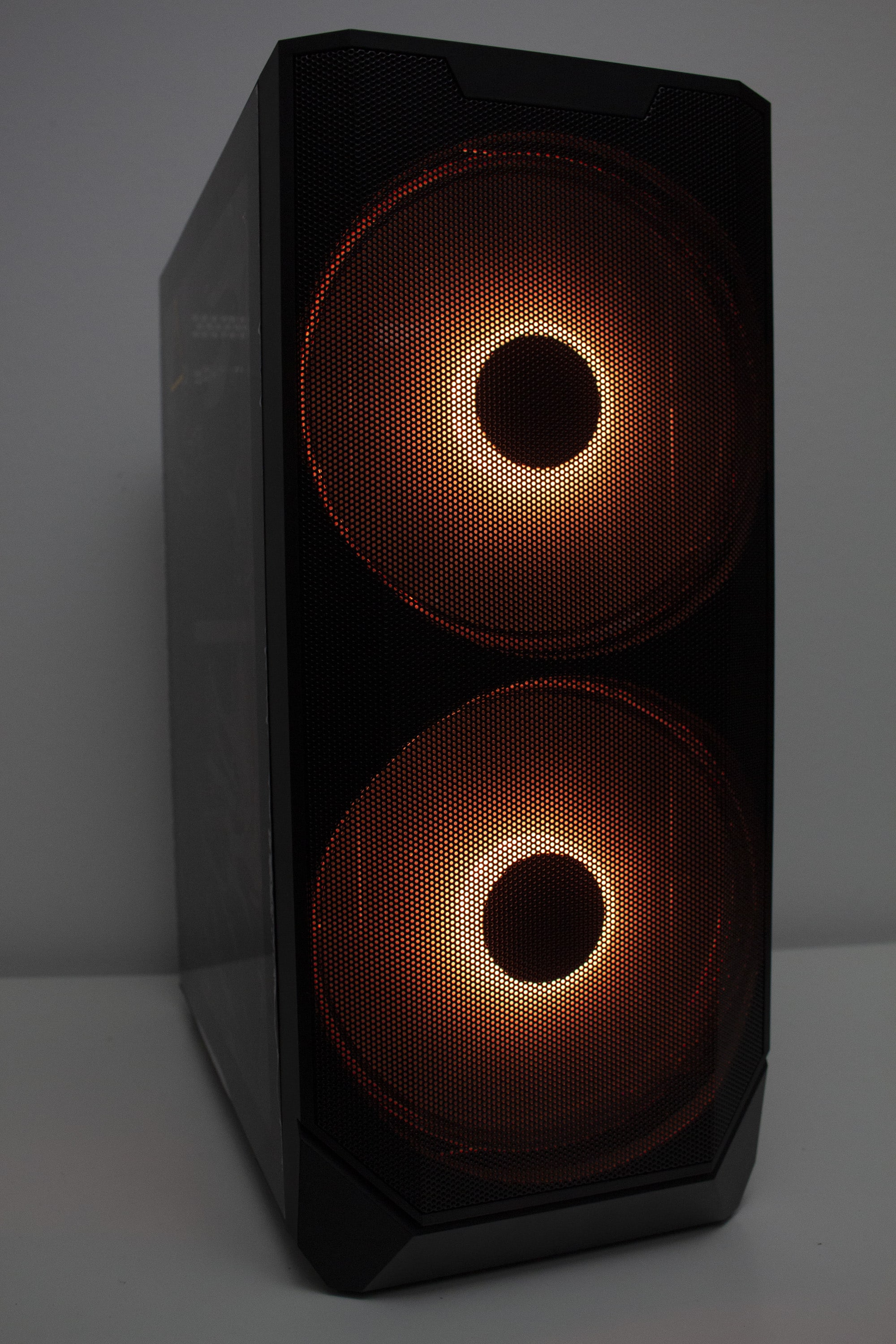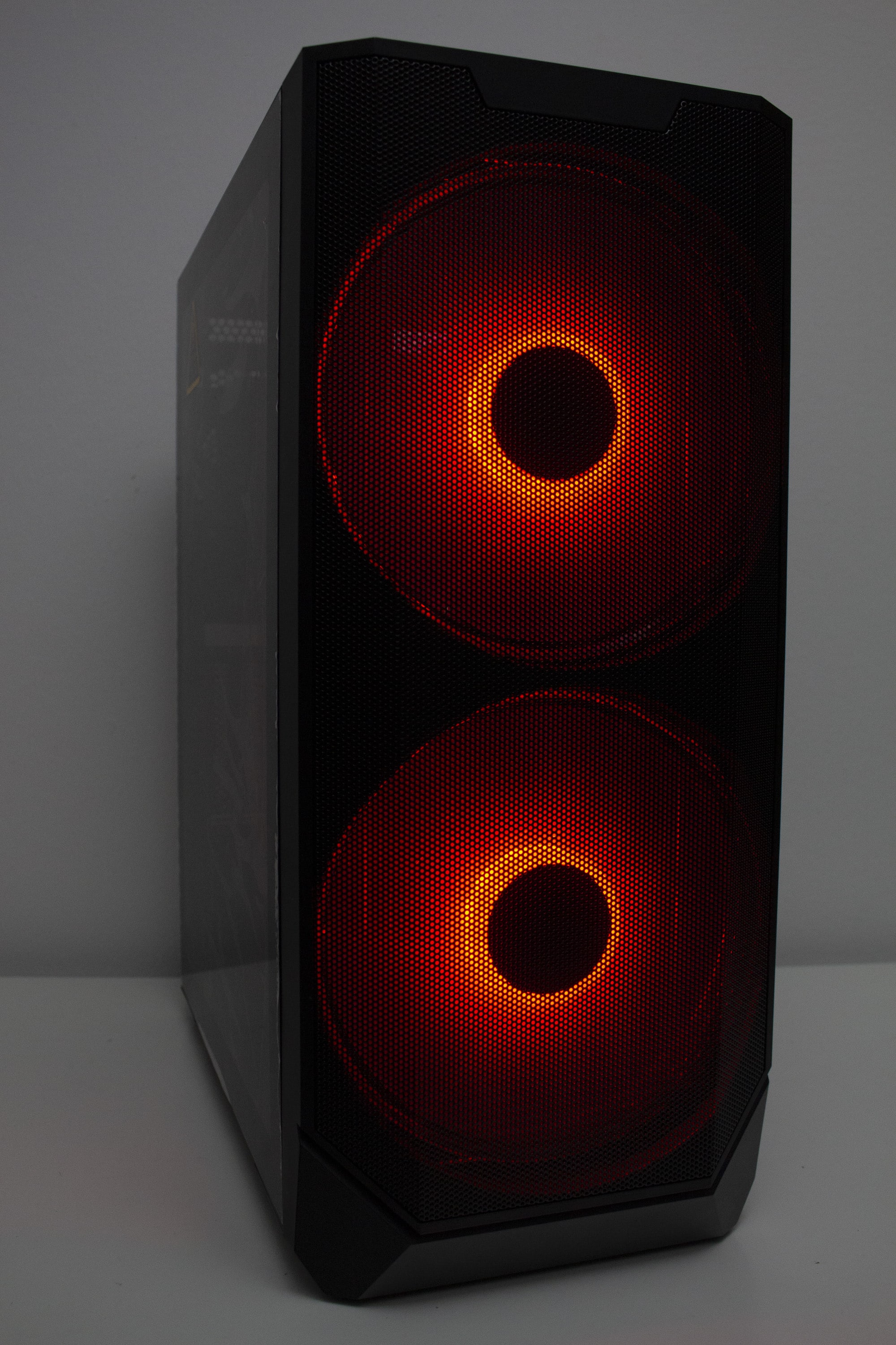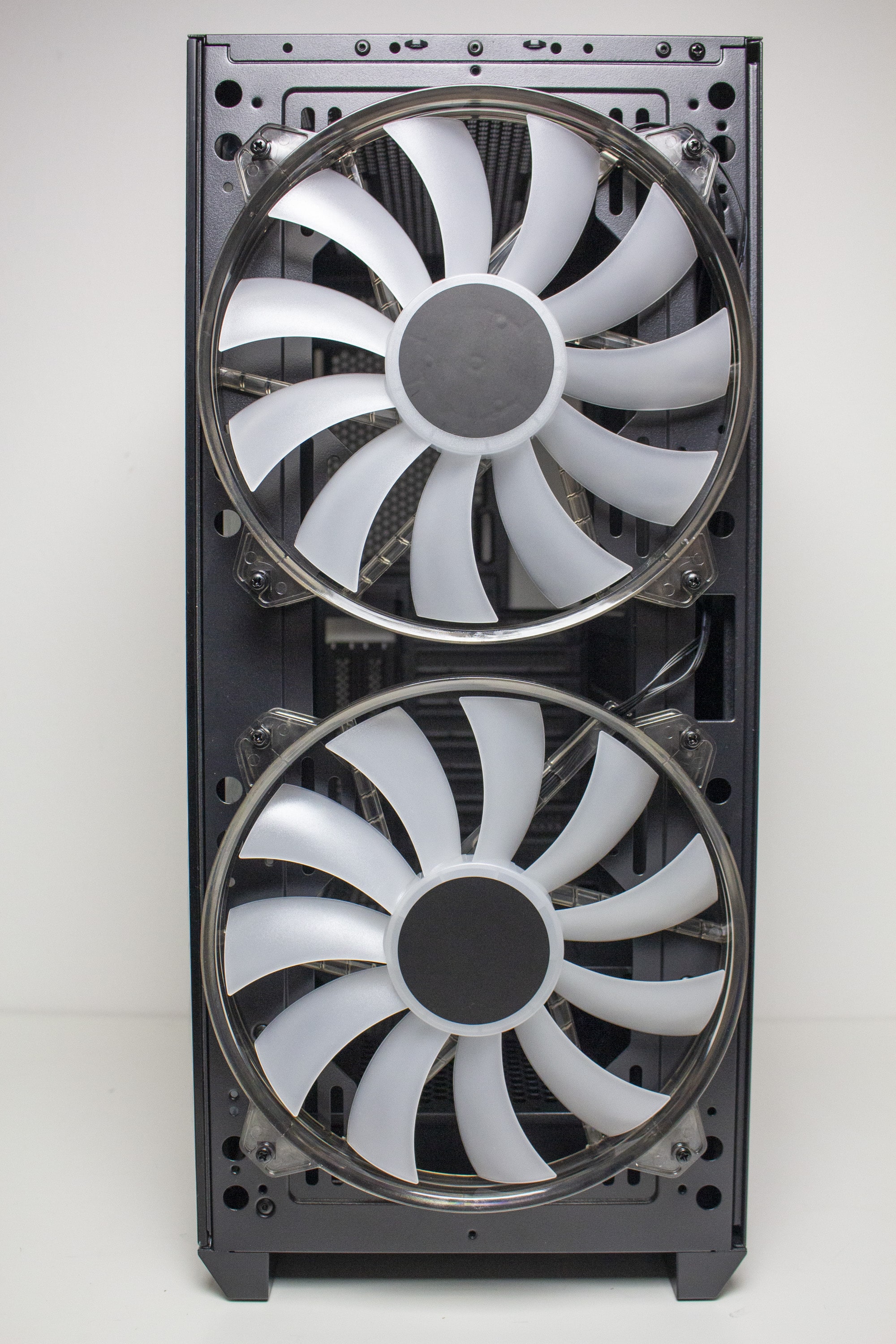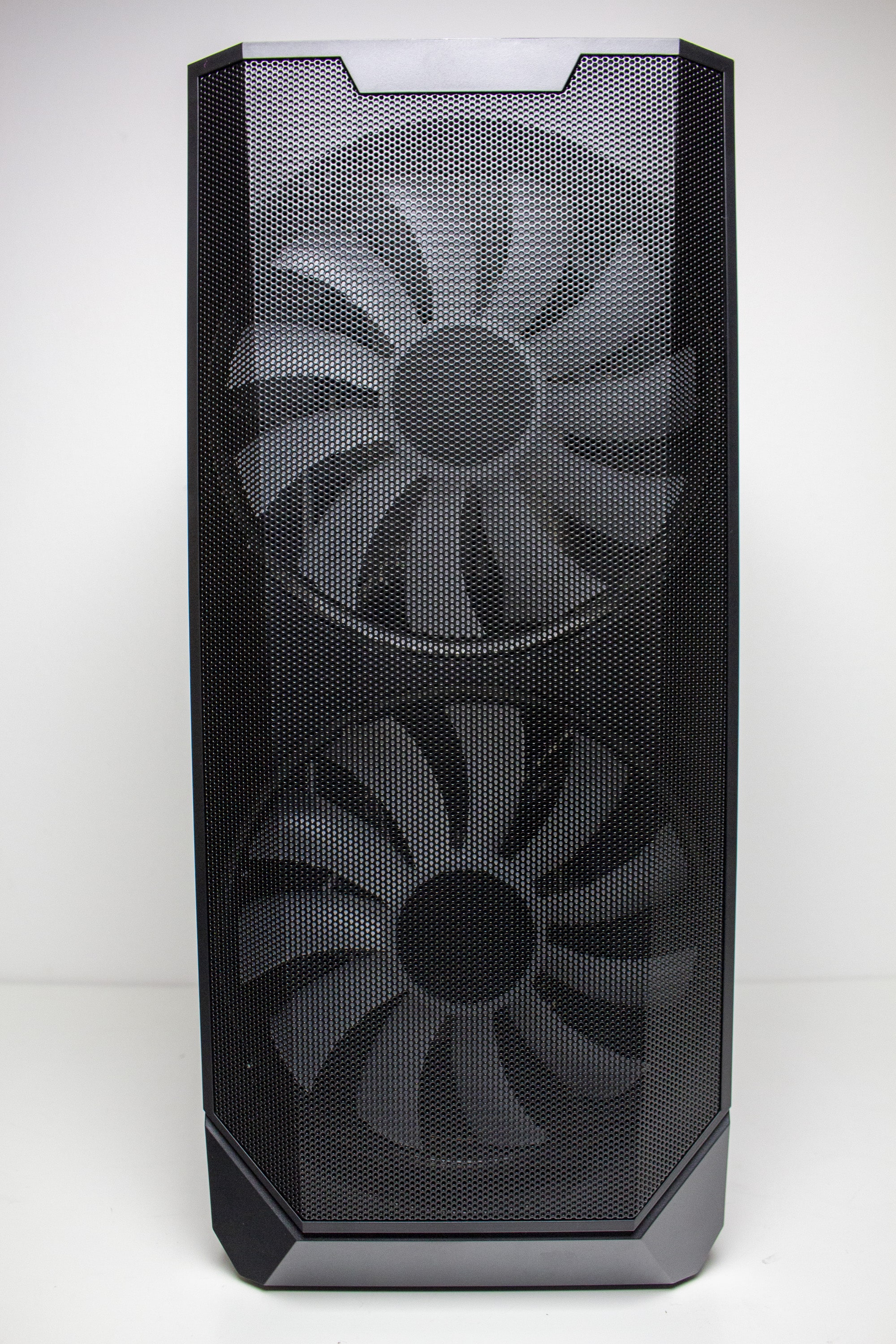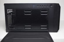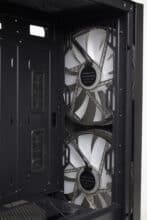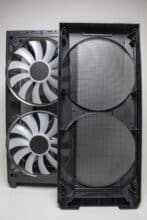 Betrachtet man die Gestaltung des Korpus allerdings genauer, dann kann man direkt erkennen, dass der Korpus eigentlich nicht für die Montage von so großen Lüfter vorgesehen war. Ungefähr zwei Fünftel der Lüfterfläche pro Lüfter liegen auf soliden Stahl auf und haben somit keine Kühlwirkung, da die Luft gar nicht im Innenraum landet. Hier hätte mehr mit Perforation des Stahls gearbeitet werden müssen. Das ist sehr schade, wenn man bedenkt, dass diese Lüfter das Element sind, womit der Hersteller am meisten wirbt. Zudem ist das Frontpanel so gestaltet, dass es optisch nur mit den 200-mm-Lüftern besonders gut aussieht.