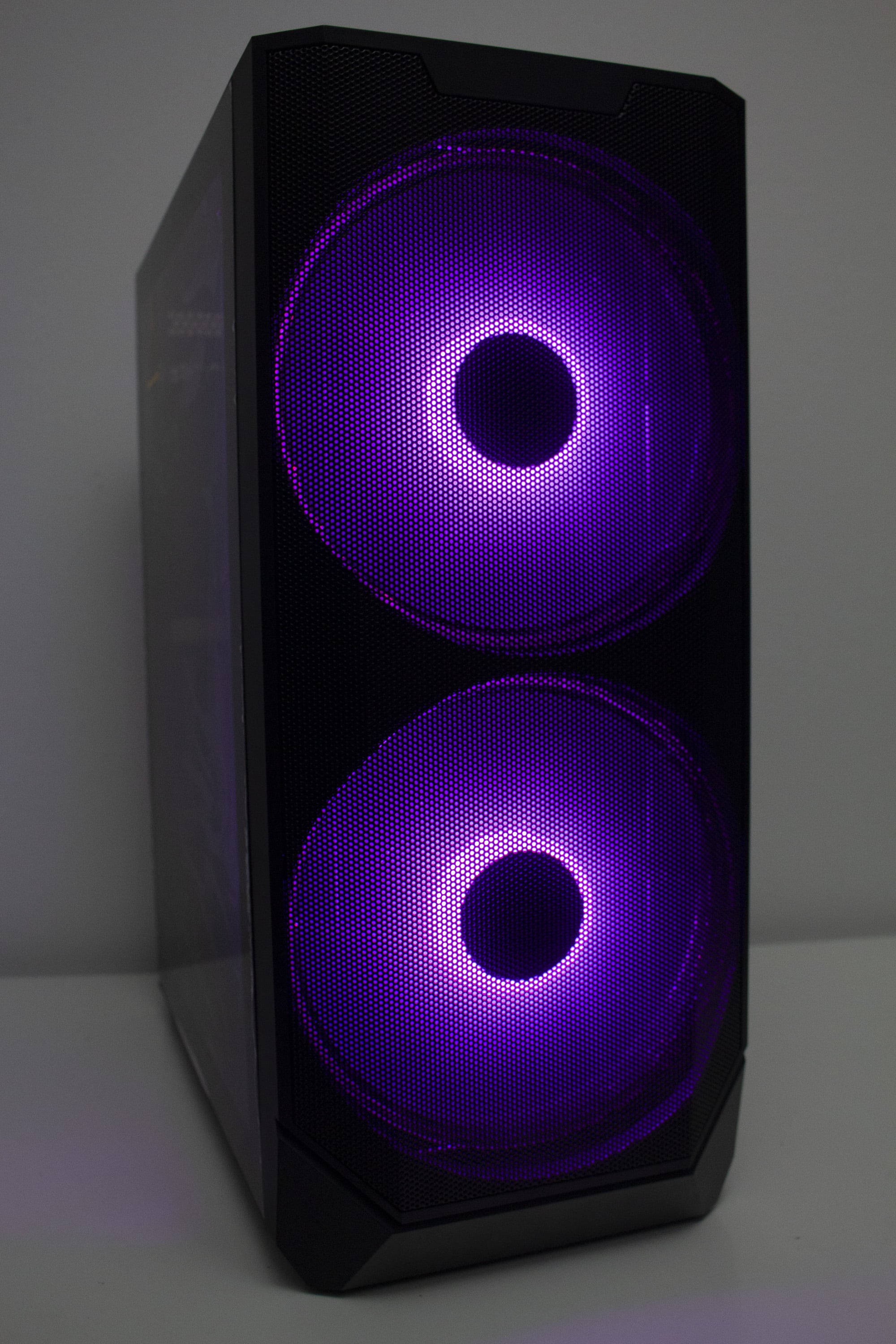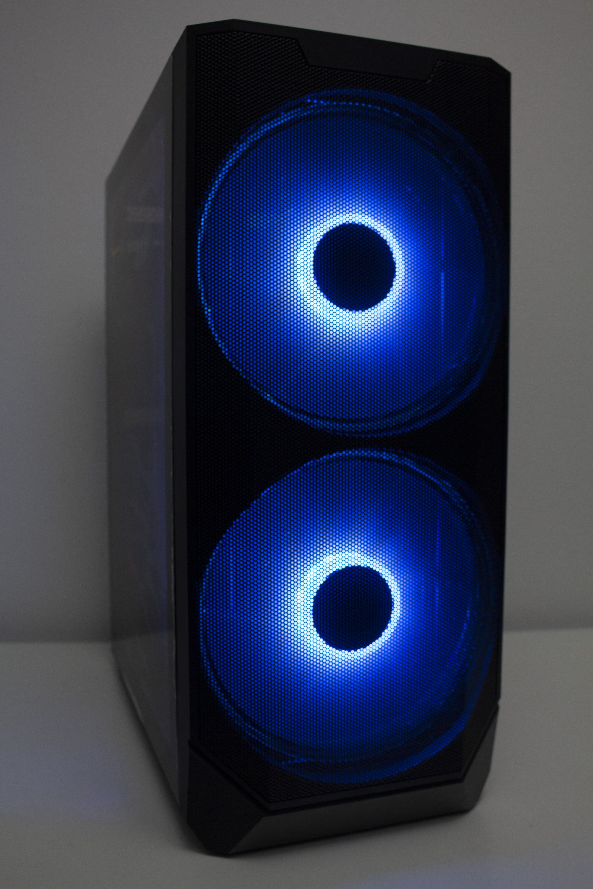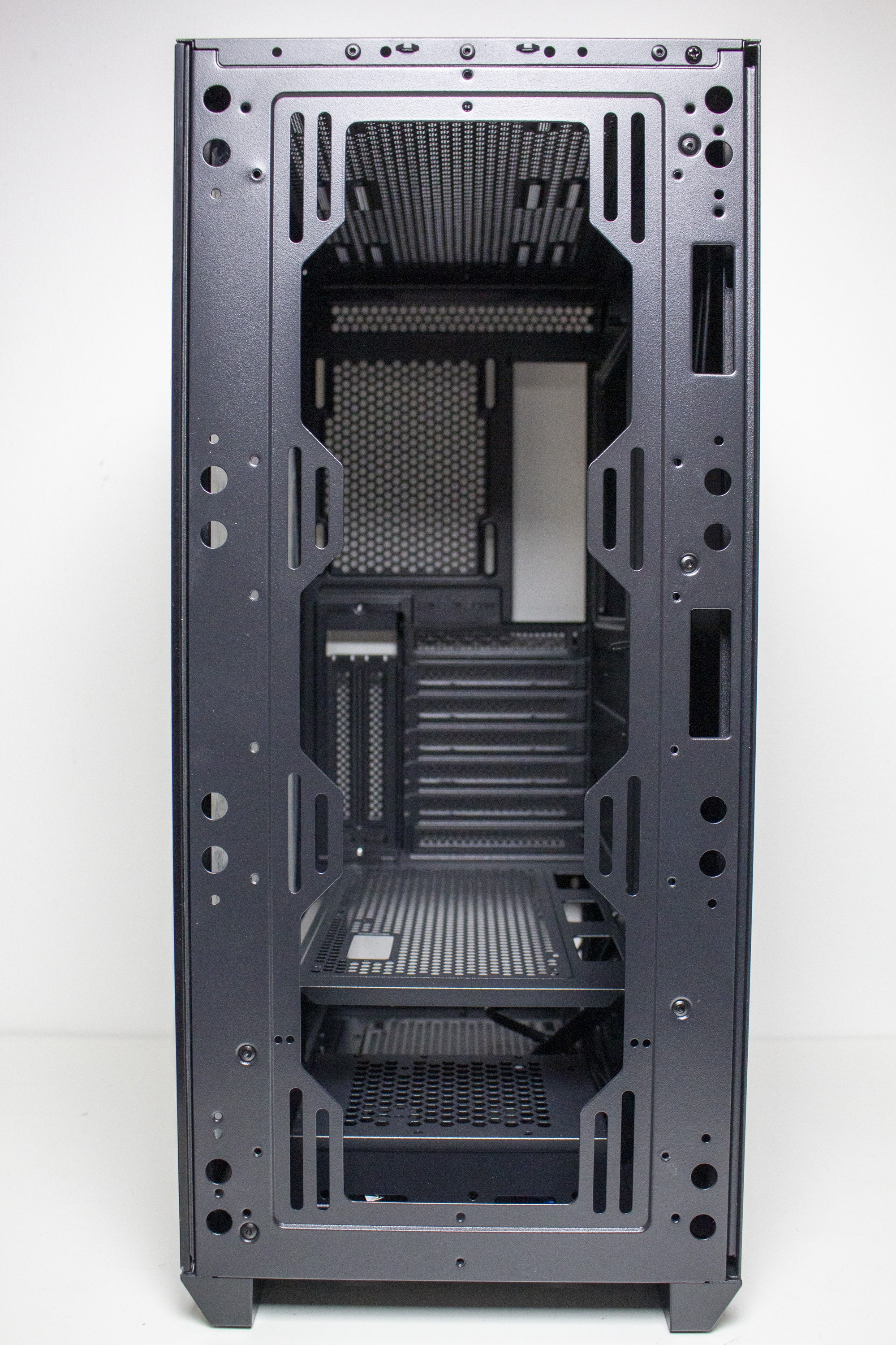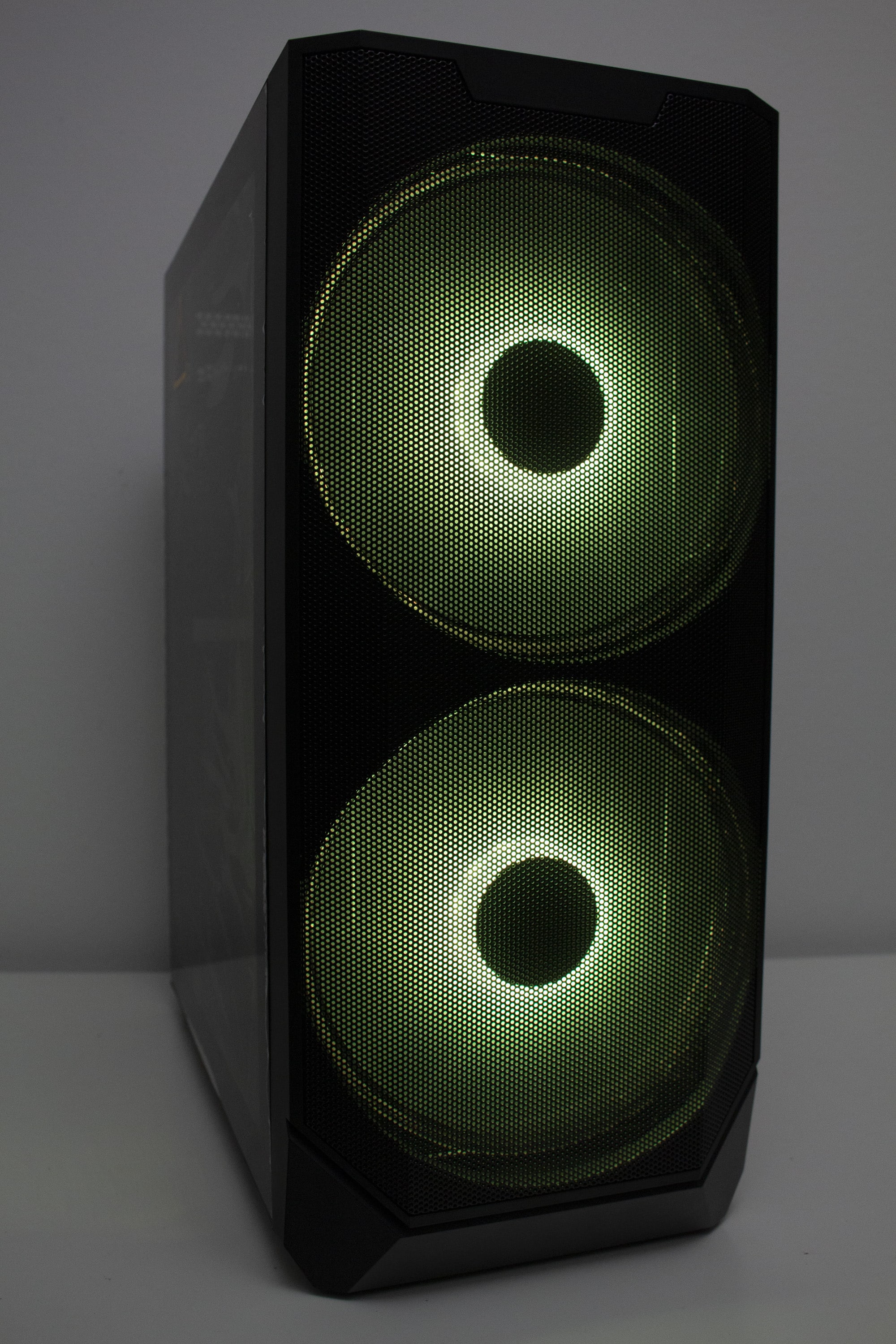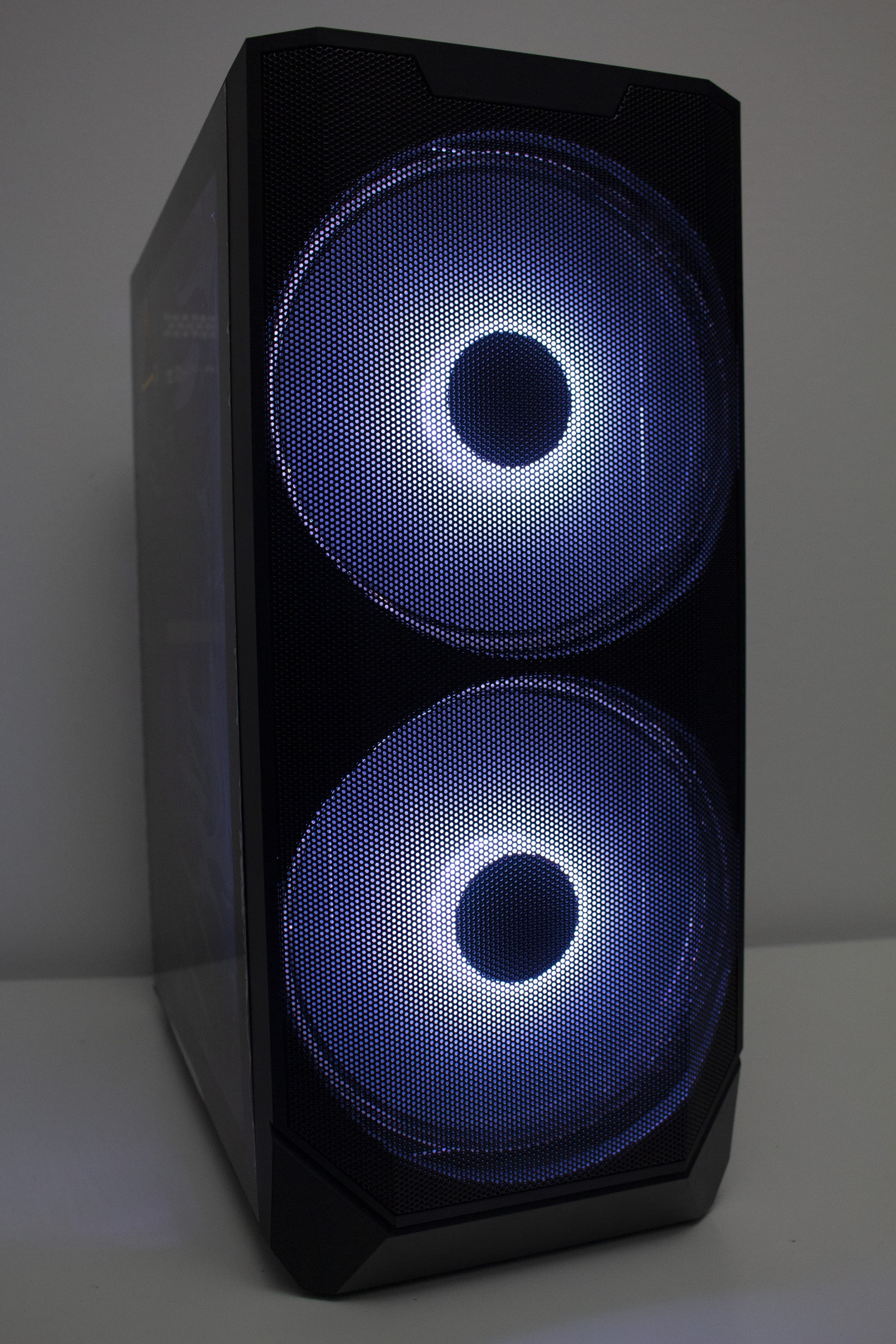 Betrachtet man die Gestaltung des Korpus allerdings genauer, dann kann man direkt erkennen, dass der Korpus eigentlich nicht für die Montage von so großen Lüfter vorgesehen war. Ungefähr zwei Fünftel der Lüfterfläche pro Lüfter liegen auf soliden Stahl auf und haben somit keine Kühlwirkung, da die Luft gar nicht im Innenraum landet. Hier hätte mehr mit Perforation des Stahls gearbeitet werden müssen. Das ist sehr schade, wenn man bedenkt, dass diese Lüfter das Element sind, womit der Hersteller am meisten wirbt. Zudem ist das Frontpanel so gestaltet, dass es optisch nur mit den 200-mm-Lüftern besonders gut aussieht.
