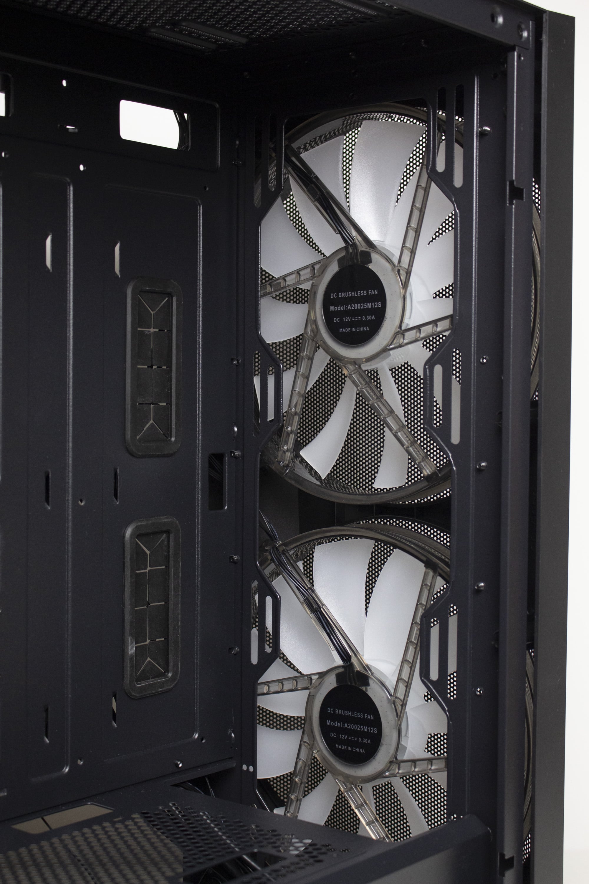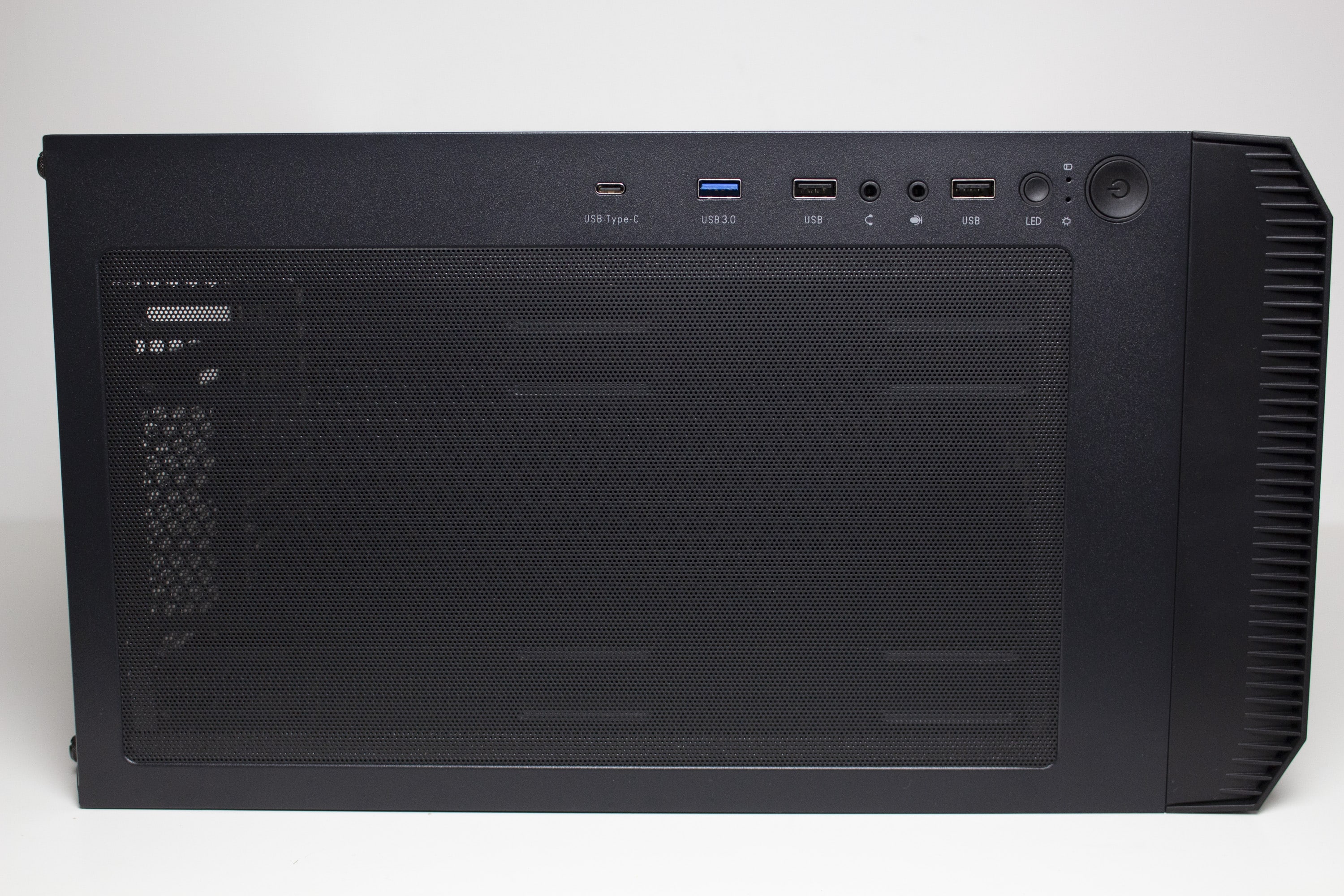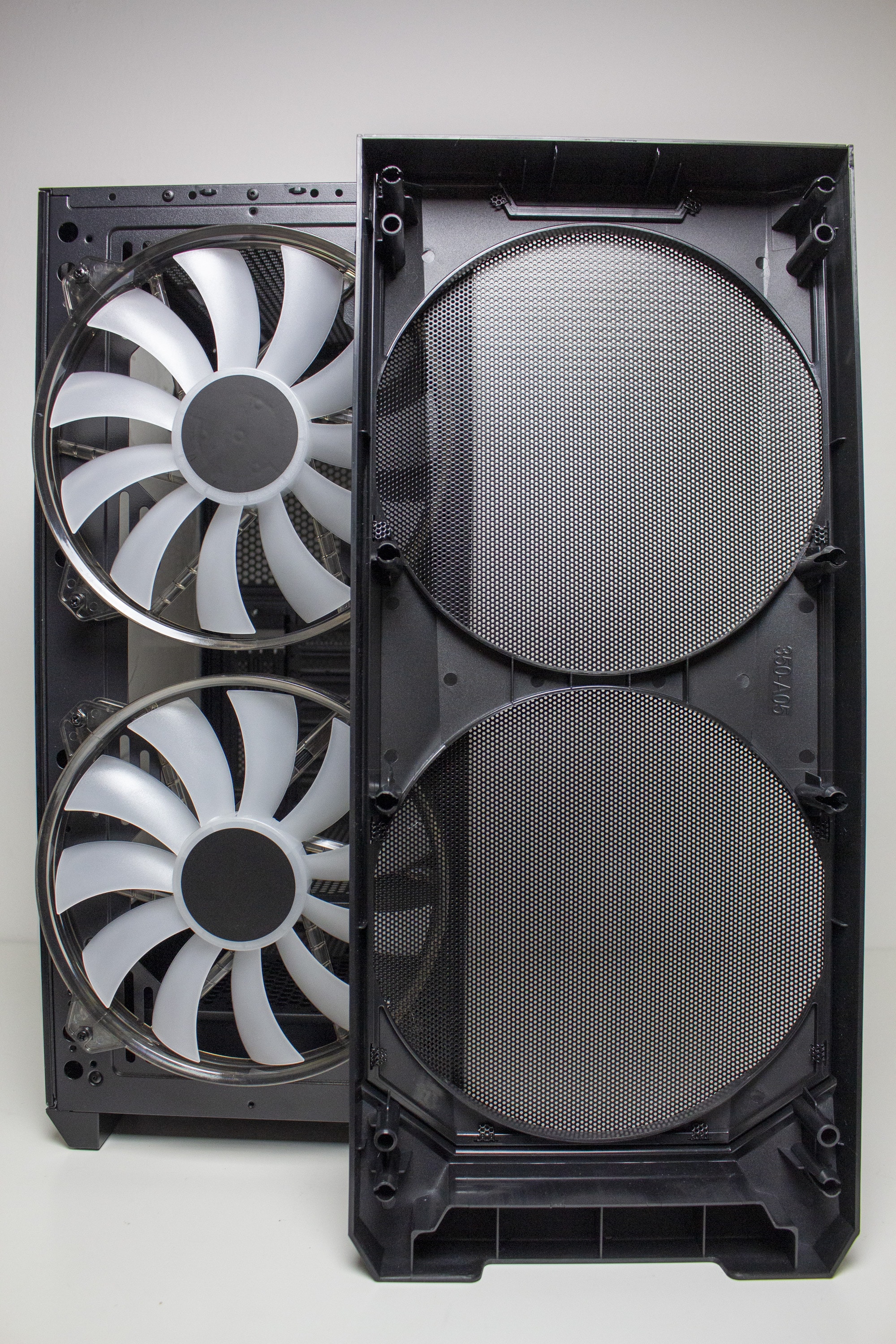 Wo vor einigen Jahren noch Tempered Glas am Frontpanel im Trend lag, setzten viele Hersteller im vorderen Bereich wieder auf Mesh. Auch beim IT-3503 ist das der Fall. Das Frontpanel besteht aus einem recht stabilen Kunststoffrahmen und einem großen Gitter aus einem feinen Mesh, welches auch gleichzeitig als Staubfilter dienen soll. Zudem wurde es nicht eben gestaltet sondern ist nach vorne hin leicht angewinkelt. Zieht man das Frontpanel ab, erhält man den Blick auf zwei vorinstallierte 200-mm-Lüfter, die zwischen Korpus und Mesh verschraubt wurden. Alternativ bietet das IT-3503 AIRSTREAM an der Front auch Platz für drei 120- oder drei 140-mm-Lüfter.