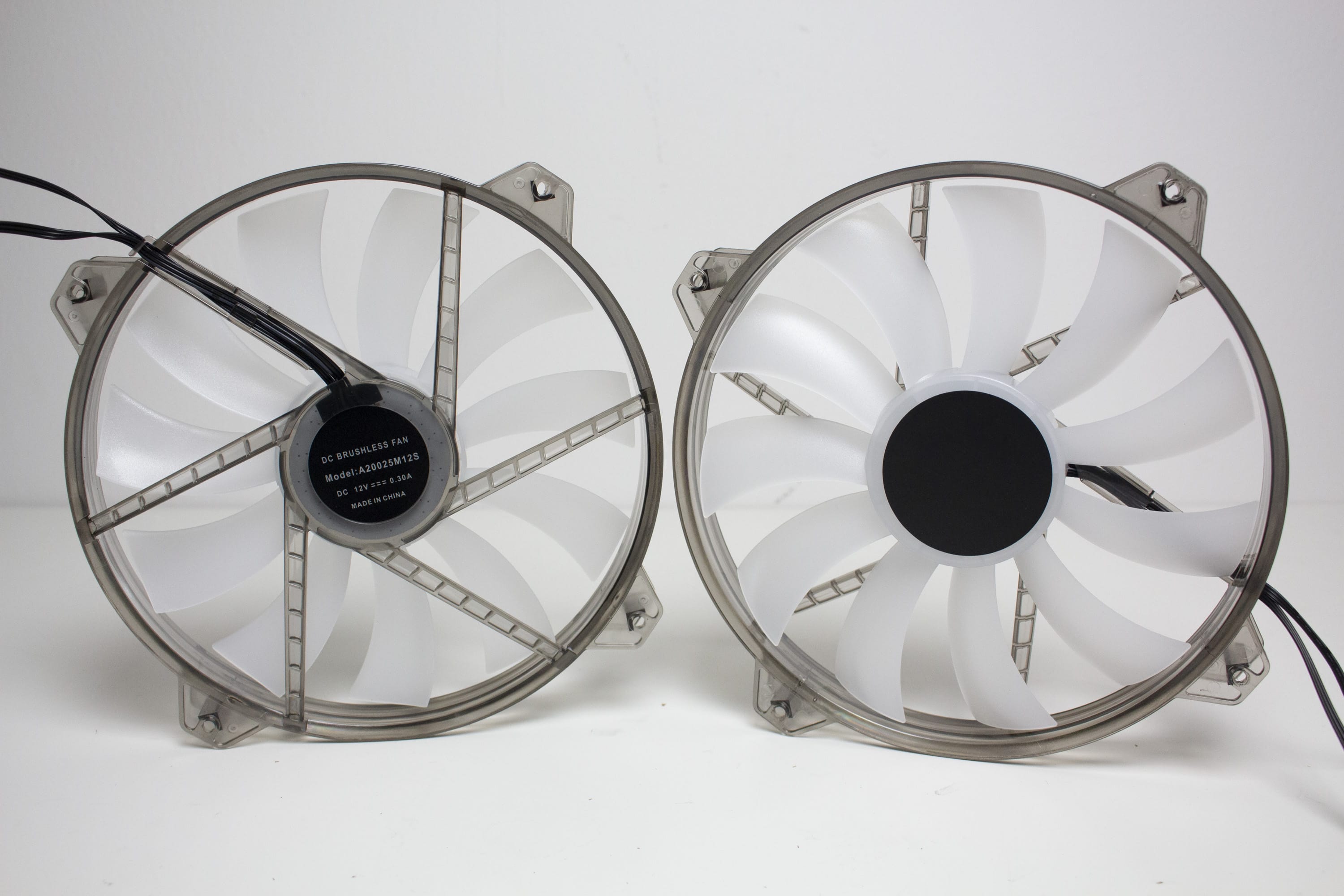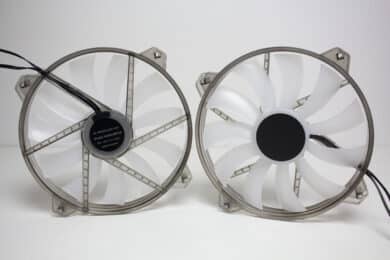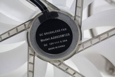 Ab Werk kommt das Inter-Tech IT-3503 AIRSTREAM mit zwei vorinstallierten 200-mm-Lüftern, die zusätzlich über 12 ARGB-LEDs im Bereich der Lüfternabe verfügen. Der Lüfterrahmen besteht auf einem gräulich-transparenten Kunststoff. Bei den Rotoren kommt hingegen ein milchiger Kunststoff sowie ein schwarzer Aufkleber auf der Lüfternabe zum Einsatz. Letzterer wurde in beiden Fällen leider nicht zentriert aufgebracht und eiert deshalb während des Betriebs. Die Maximalgeschwindigkeit liegt bei circa 700 Umdrehungen pro Minute. Der Anschluss erfolgt pro Lüfter jeweils mit einem 3-Pin-Stecker für Strom und einem 3-Pin-5V-ARGB-Header für die Ansteuerung der LEDs.