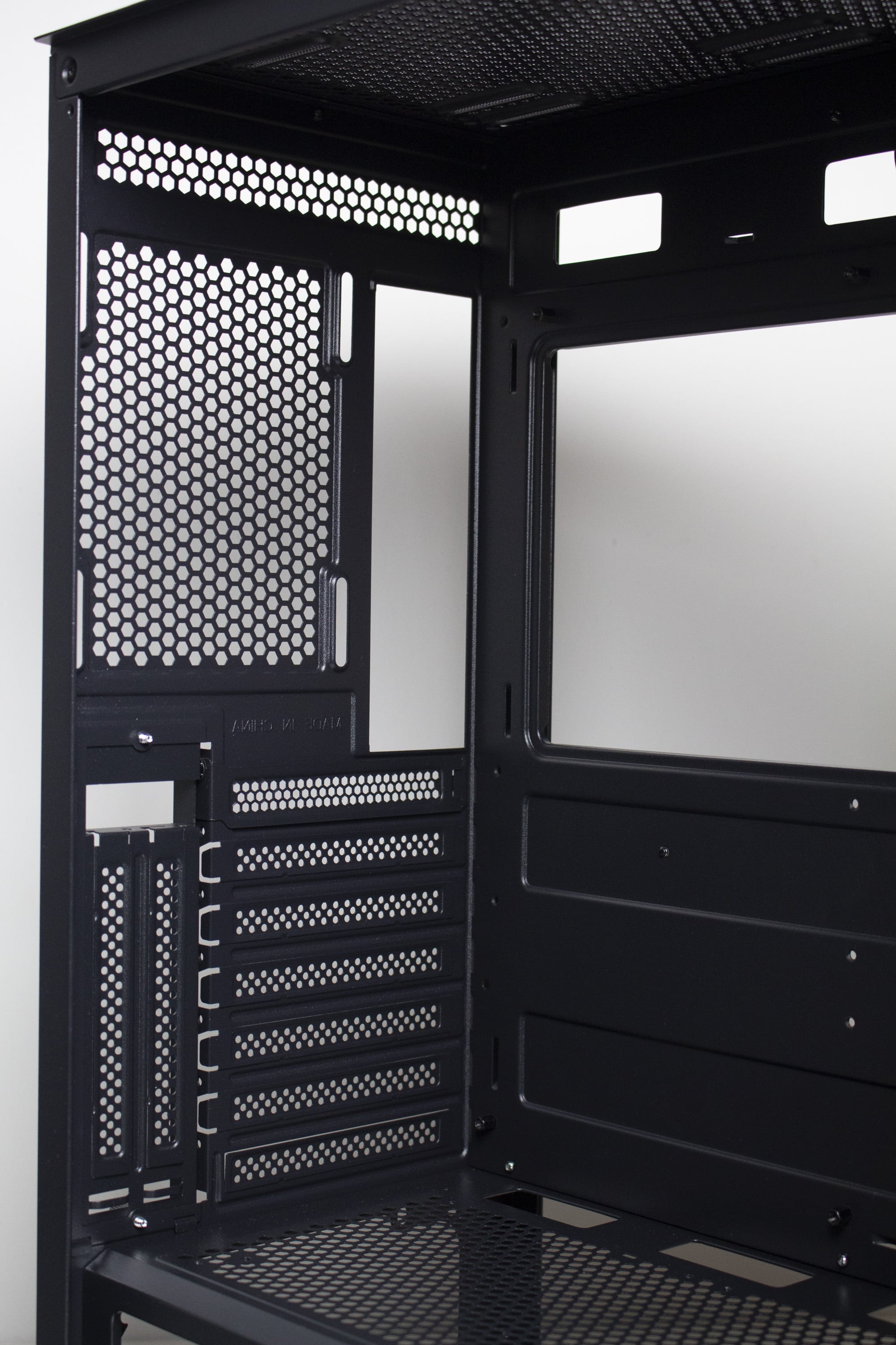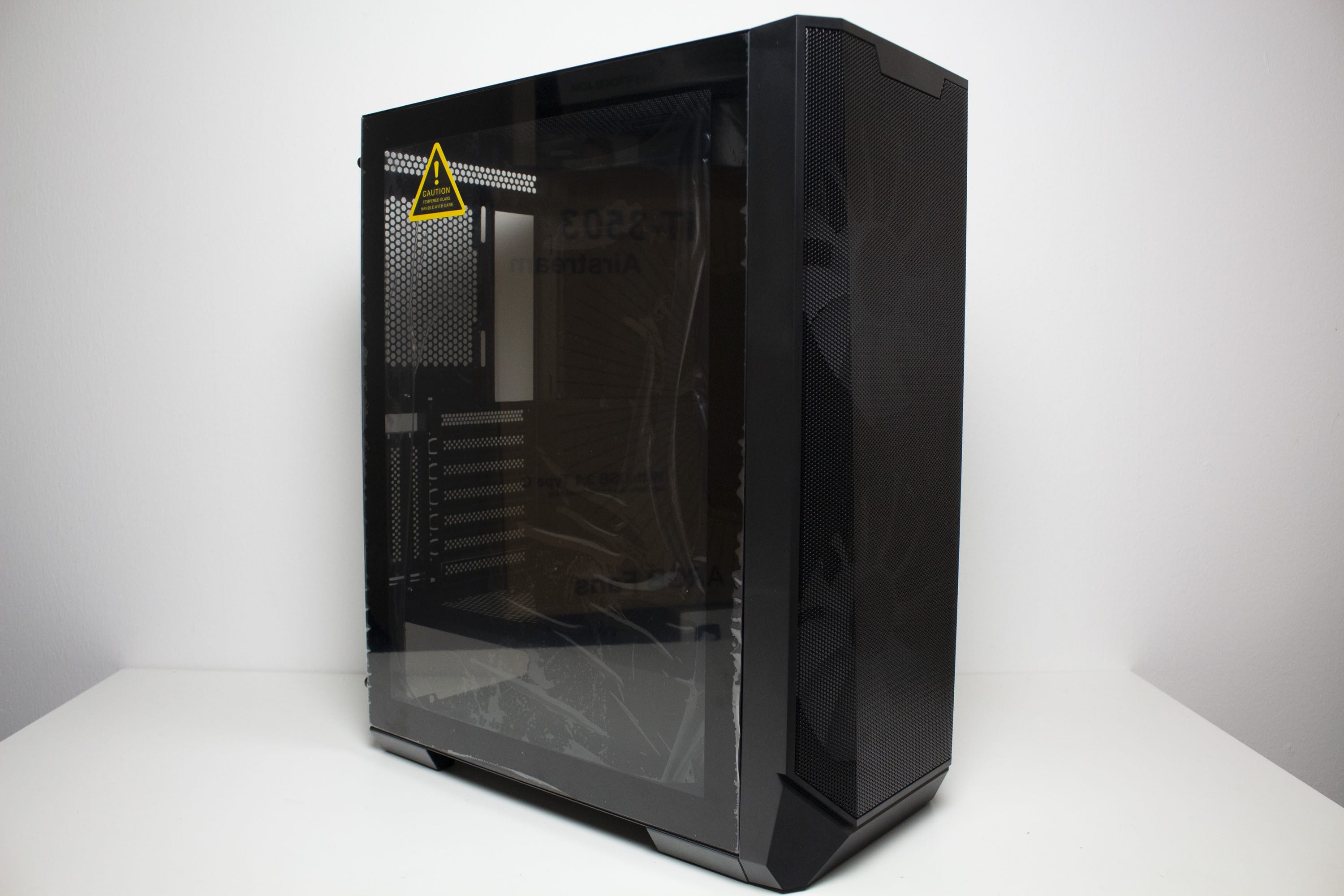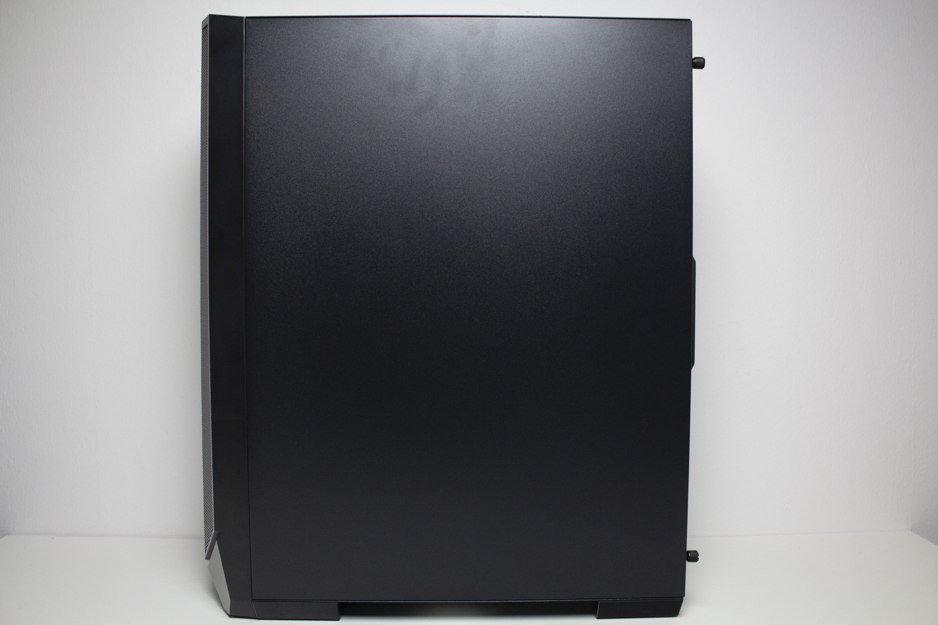 Dem aktuellen Trend folgend, besteht das linke Seitenteil des IT-3503 aus gehärtetem und leicht getöntem Glas. Um die Anbringung am Korpus zu erleichtern, wurde das Glas auf einen Stahlrahmen geklebt, welcher über zwei Rändelschrauben am hinteren Ende mit dem Gehäuserahmen verbunden wird. Zusätzlich wurden die Innenseiten des Rahmens mit einer dünnen Schicht Moosgummi beklebt. Dies dient zum Zweck der Vibrationsminimierung. Das rechte Seitenteil besteht aus Stahl und bietet eine gerade noch akzeptable Stabilität. Auch hier erfolgt die Befestigung über zwei Rändelschrauben und weiterhin verfügt das Panel über eine Ausziehhilfe.