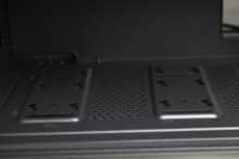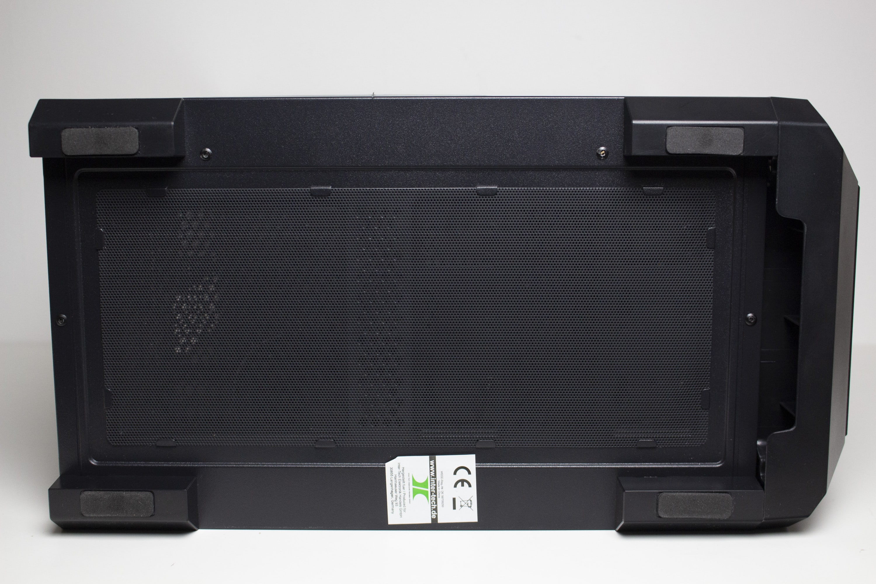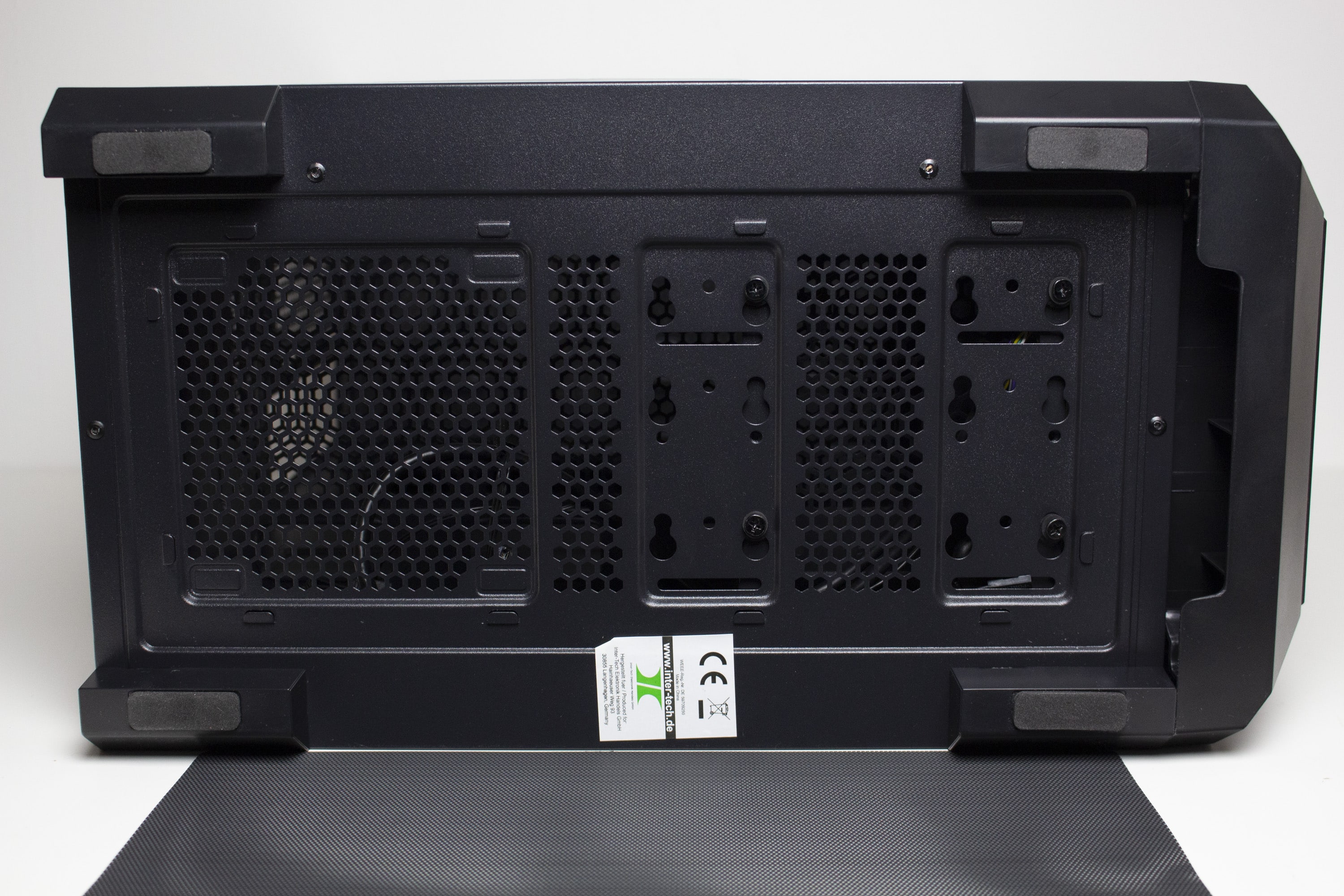 An der Unterseite des IT-3503 gibt es keine großen Überraschungen. Vier große und stabile Kunststofffüße heben den Tower ausreichend hoch vom Boden an und wurden, zum Schutz des Untergrundes, ab Werk mit jeweils einem dünnen Streifen Moosgummi beklebt. Ansonsten hat Inter-Tech die Unterseite des Towers mit einer großen Belüftungsöffnungen und einem einfachen Meshfilter ausgestattet. Im Bereich des HDD-Käfigs sind zudem Schrauben zu erkennen. Das deutet auf einen modularen HDD-Käfig hin.