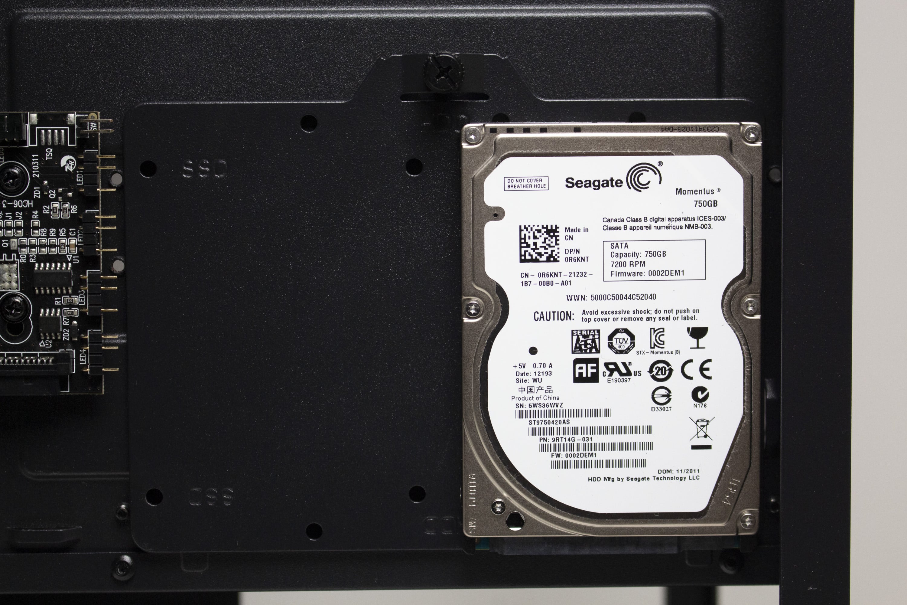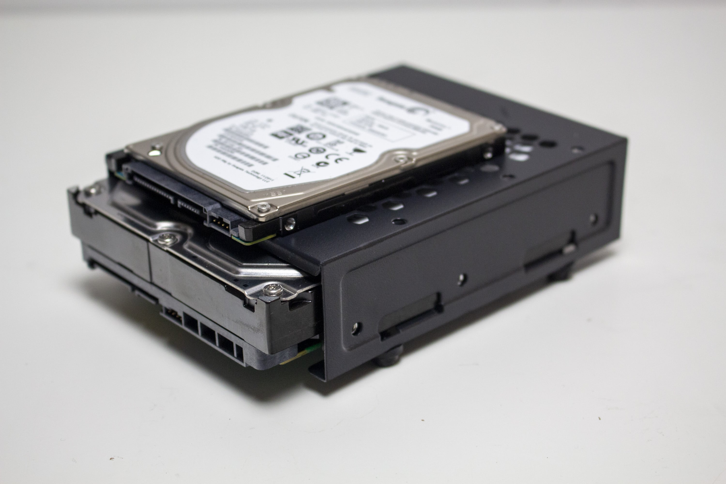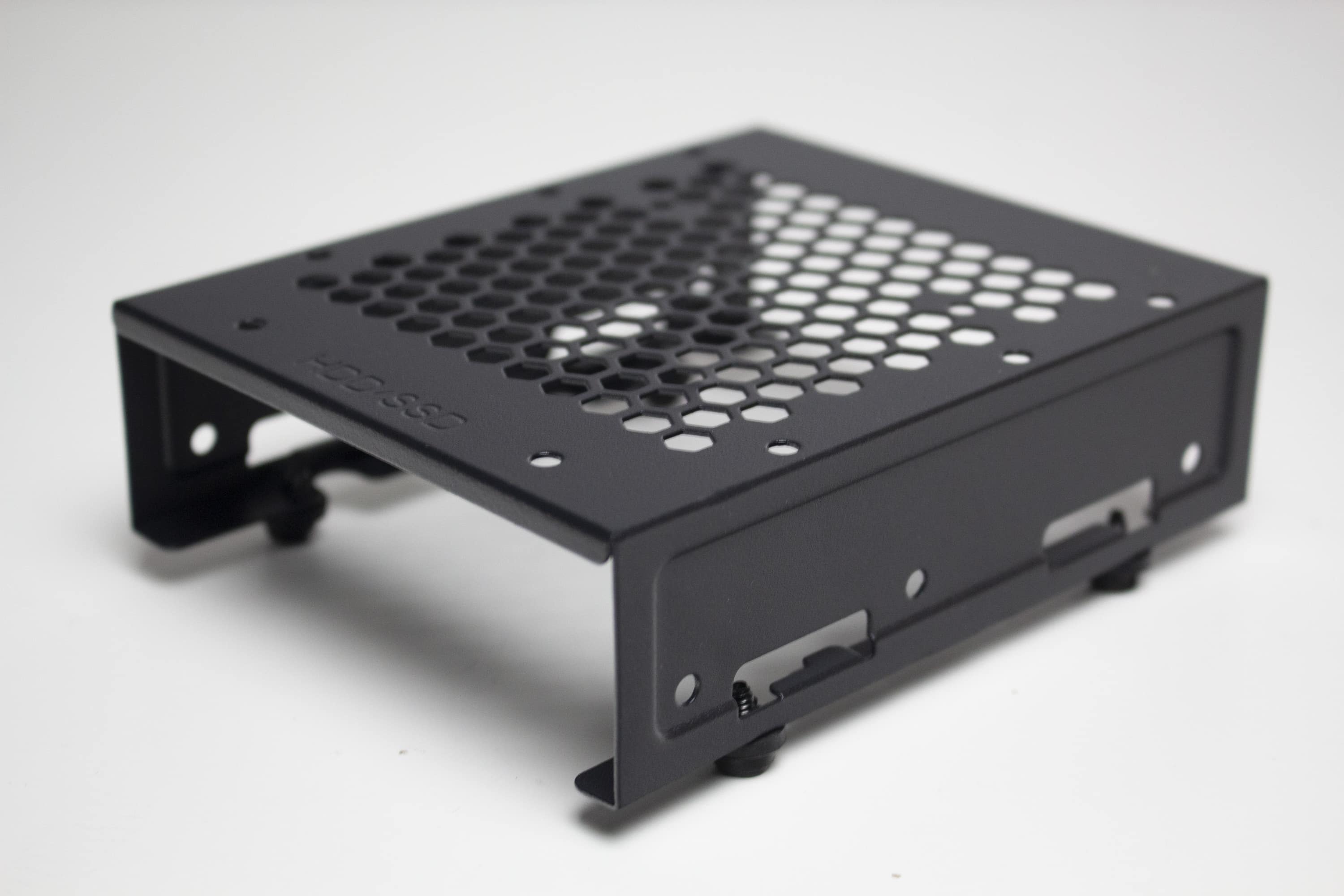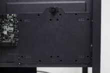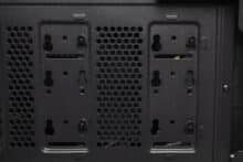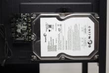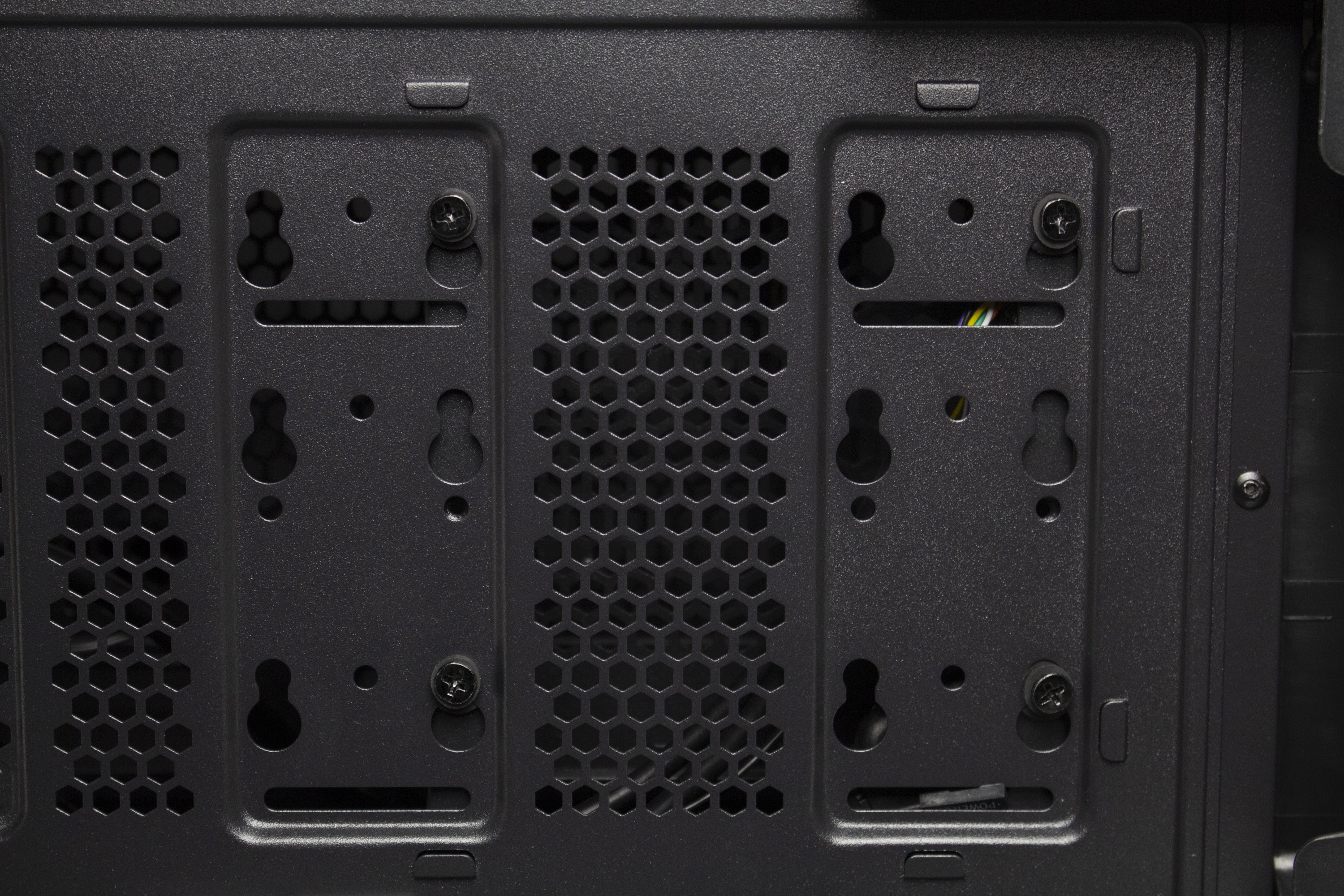 Für einen Midi-Tower mit diesem Aufbau kann das IT-3503 AIRSTREAM entsprechend viele Datenträger unterbringen. Im modularen HDD-Käfig können zwei 3,5″- oder alternativ ein 3,5″- sowie ein 2,5″-Datenträger untergebracht werden. Der gesamte Käfig ist über vier Gummiringe entkoppelt und kann bei Bedarf vollständig ausgebaut werden. Weiterhin bietet eine Stahlplatte auf der Rückseite des Mainboards-Trays Montagepunkte für zwei weitere 2,5″-SSDs oder eine 3,5″-HDD. Verbaut man letztere, ist aber mit einer starken Übertragung von Schwingungen zu rechnen, da der Rahmen nicht entkoppelt ist und sich die HDD sehr nah am Seitenteil befindet.