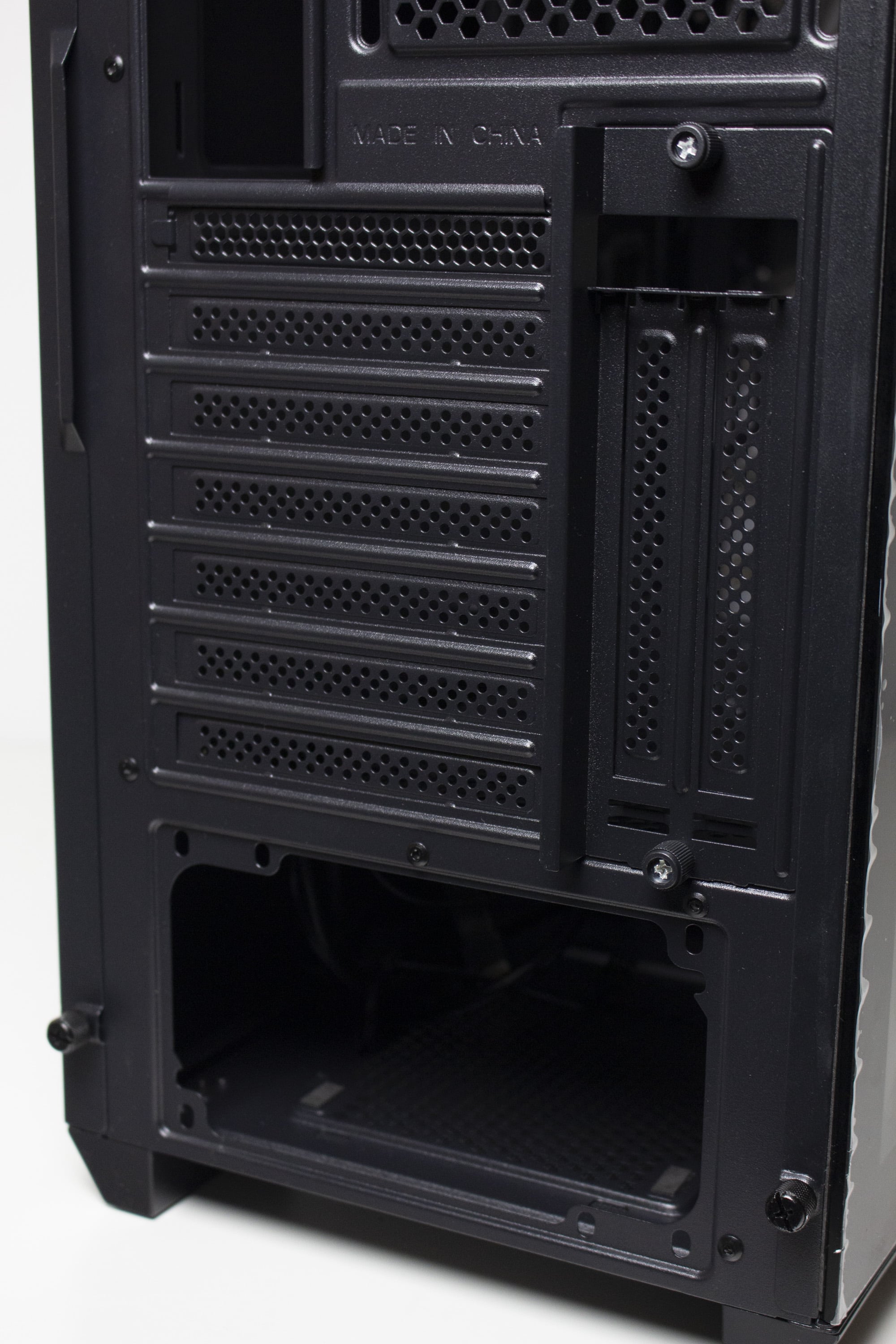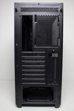 Die Rückseite zeigt ein, für einen Midi-Tower, typisches Erscheinungsbild. Das Netzteil wird unten platziert und von außen verschraubt. Darüber finden wir sieben PCI-Slotblenden und einen Montageplatz für einen 120-mm-Lüfter. Leider sind die Slotblenden nicht wiederverwendbar und müssen herausgebrochen werden. Oberhalb des optionalen Hecklüfters gibt es zudem circa zwei Zentimeter Platz zum Deckel. Dieses zusätzliche Raumangebot ist in der Regel bei der Montage eines Deckelradiators besonders nützlich.