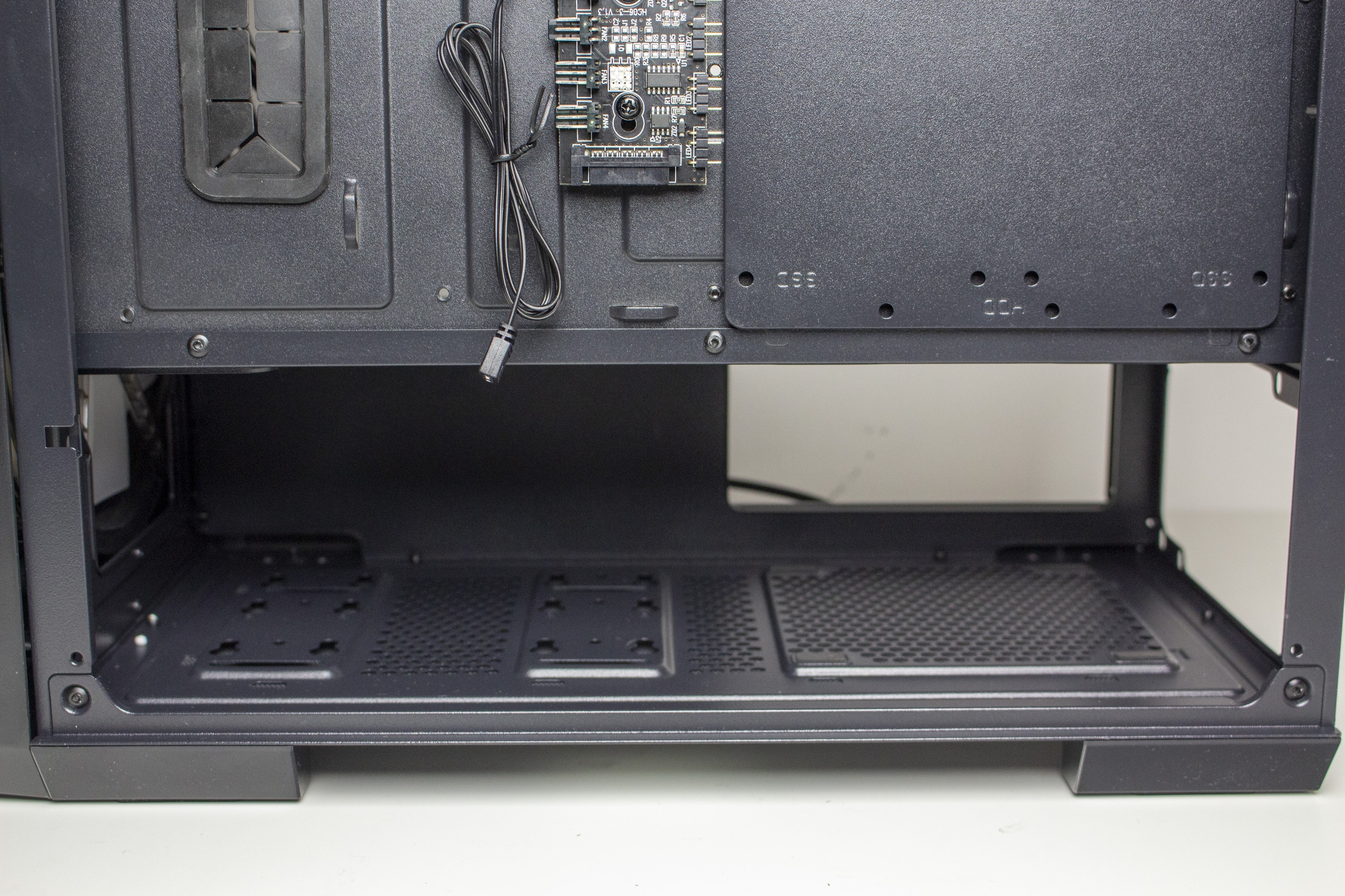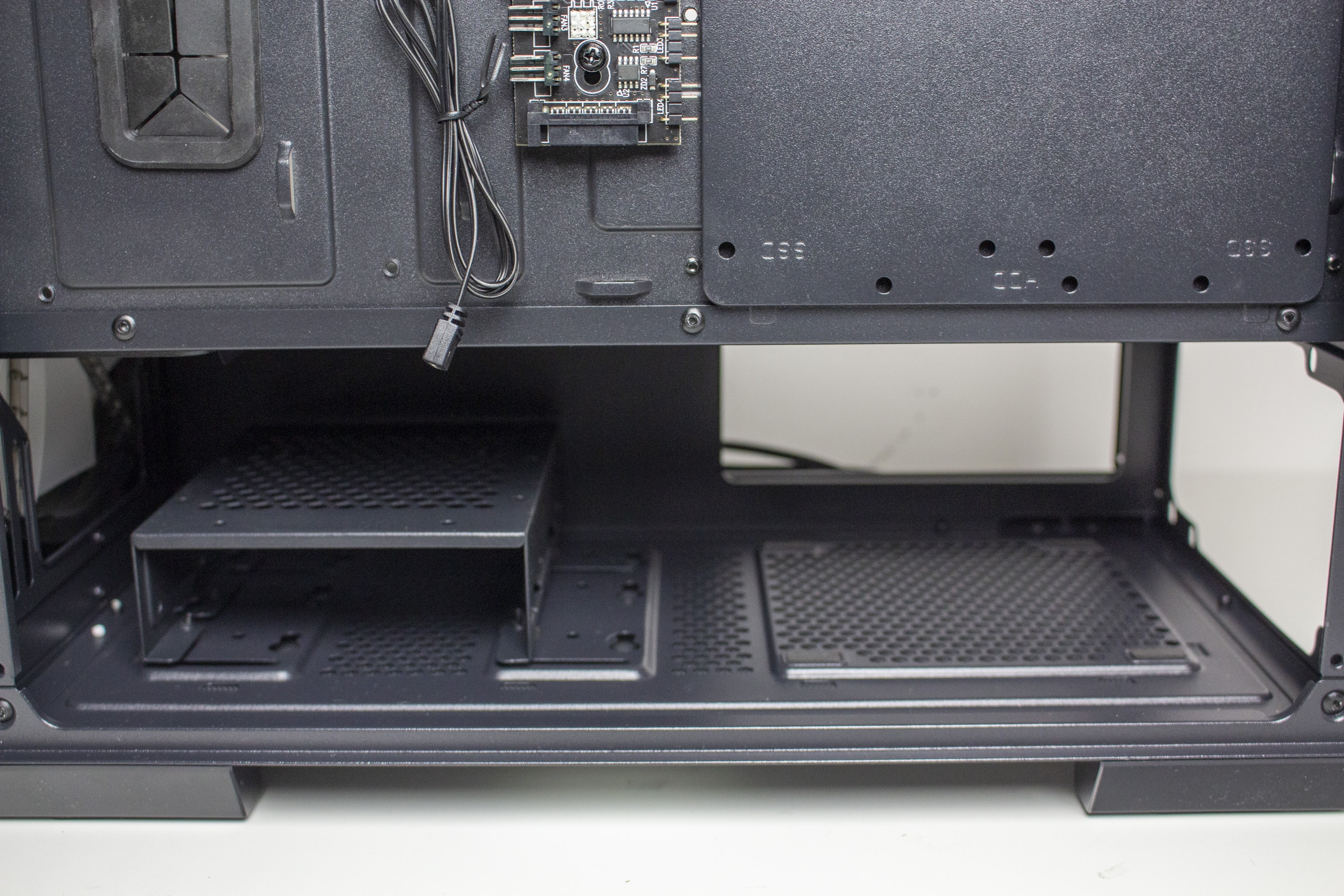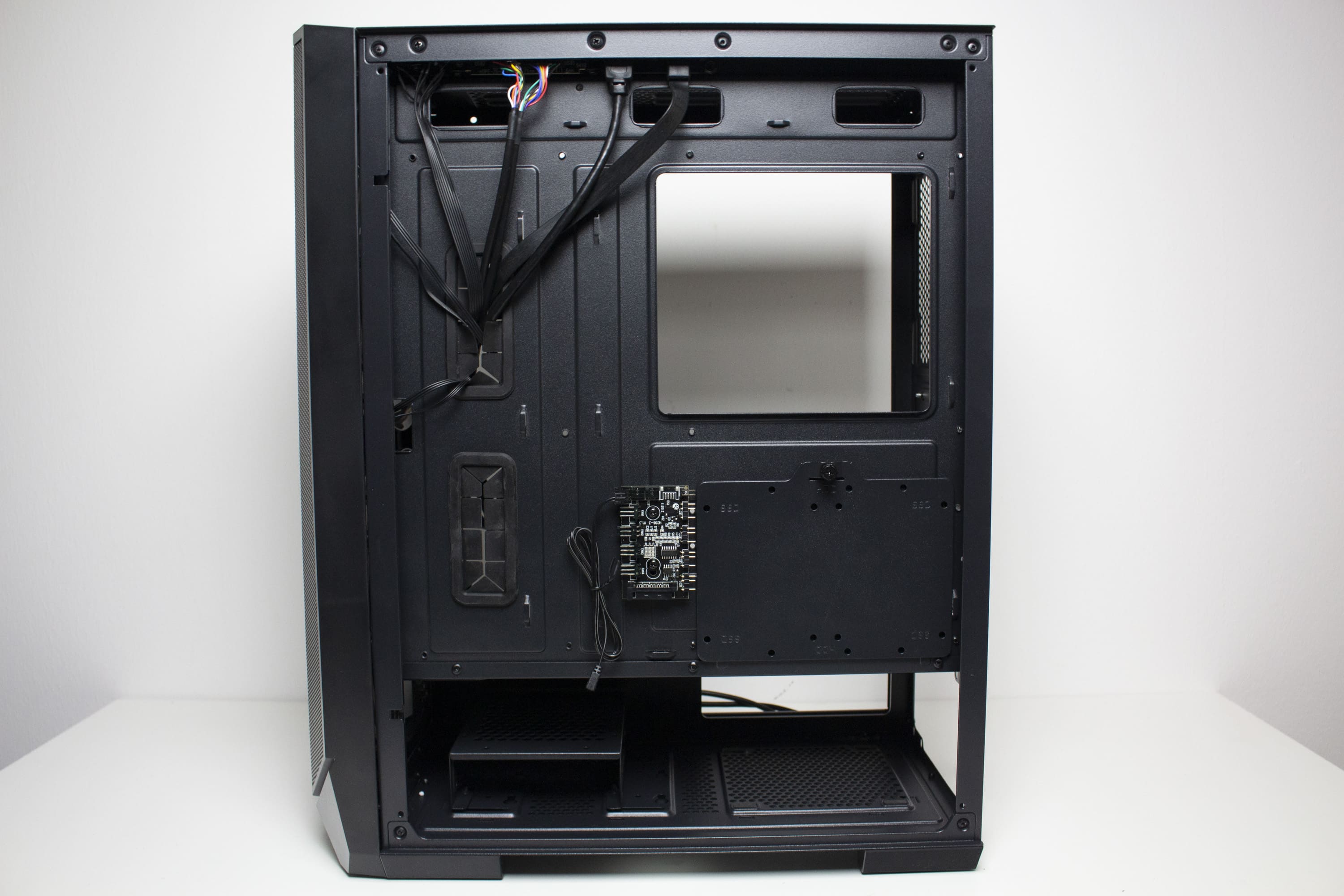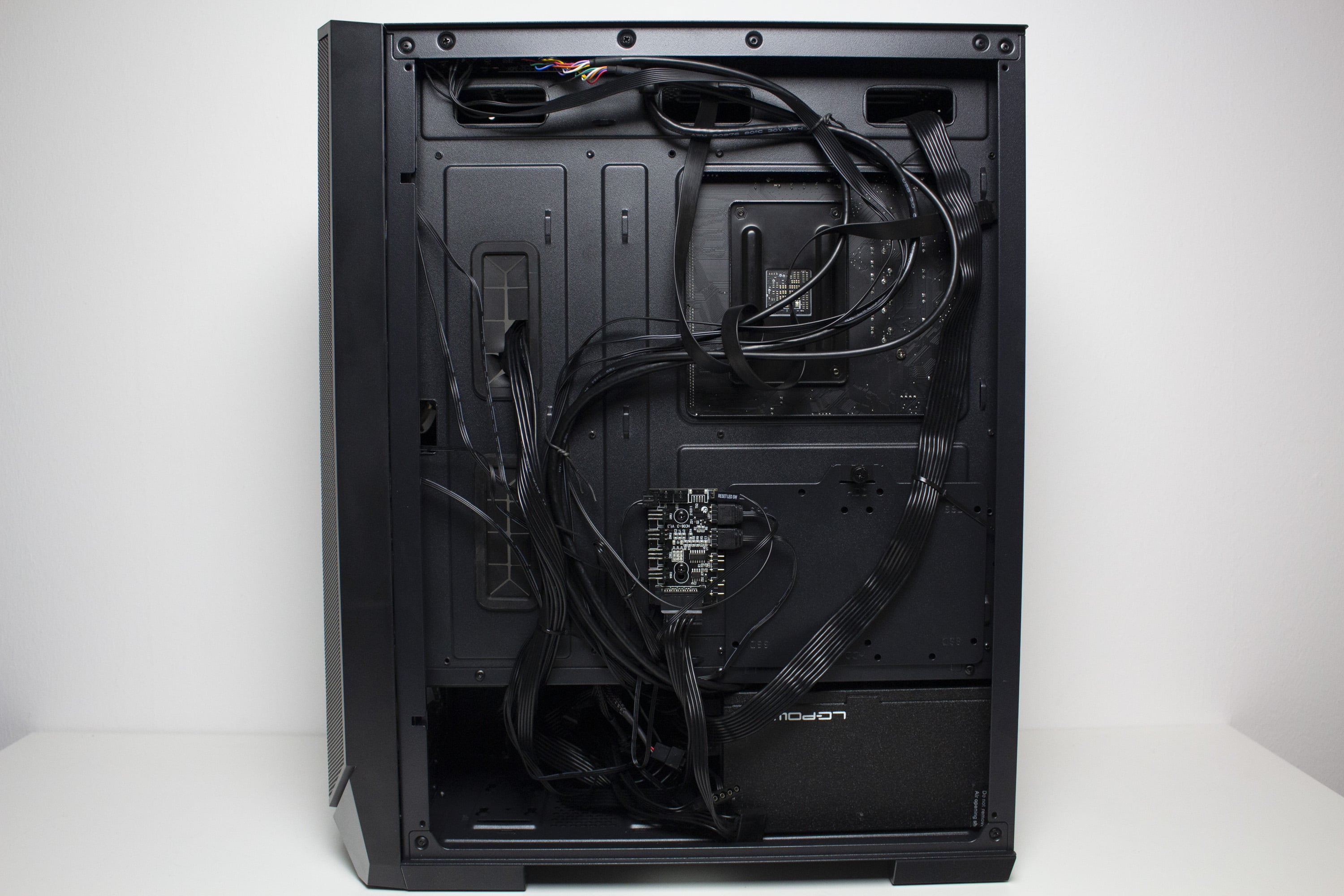 Die Rückseite des Mainboard-Trays bietet vor allem viel Platz für Kabel und zahlreiche Ösen für Kabelbinder. Durch die bis zu 28 Millimeter Raum sollte sich das Verlegen der Netzteilkabel sehr einfach gestalten. Ansonsten finden sich an der Rückseite noch die Steuerplatine für die Lüfter sowie weitere Montagemöglichkeiten für Festplatten.